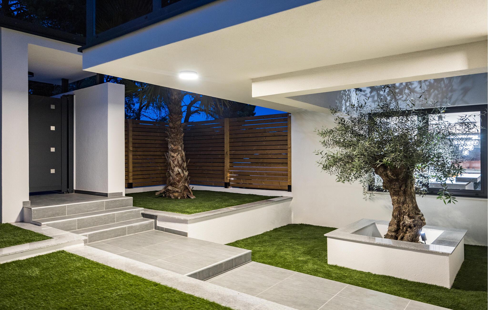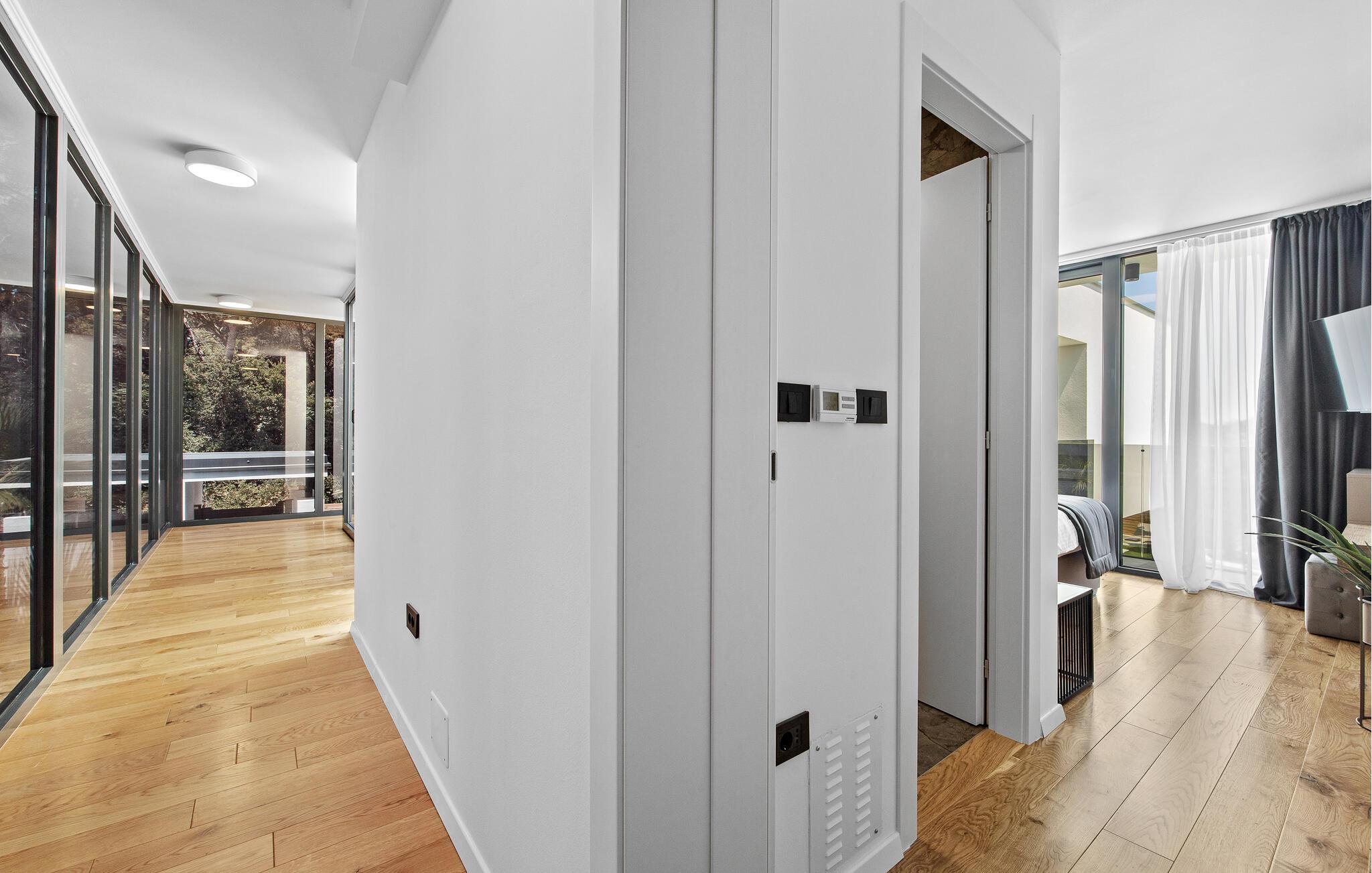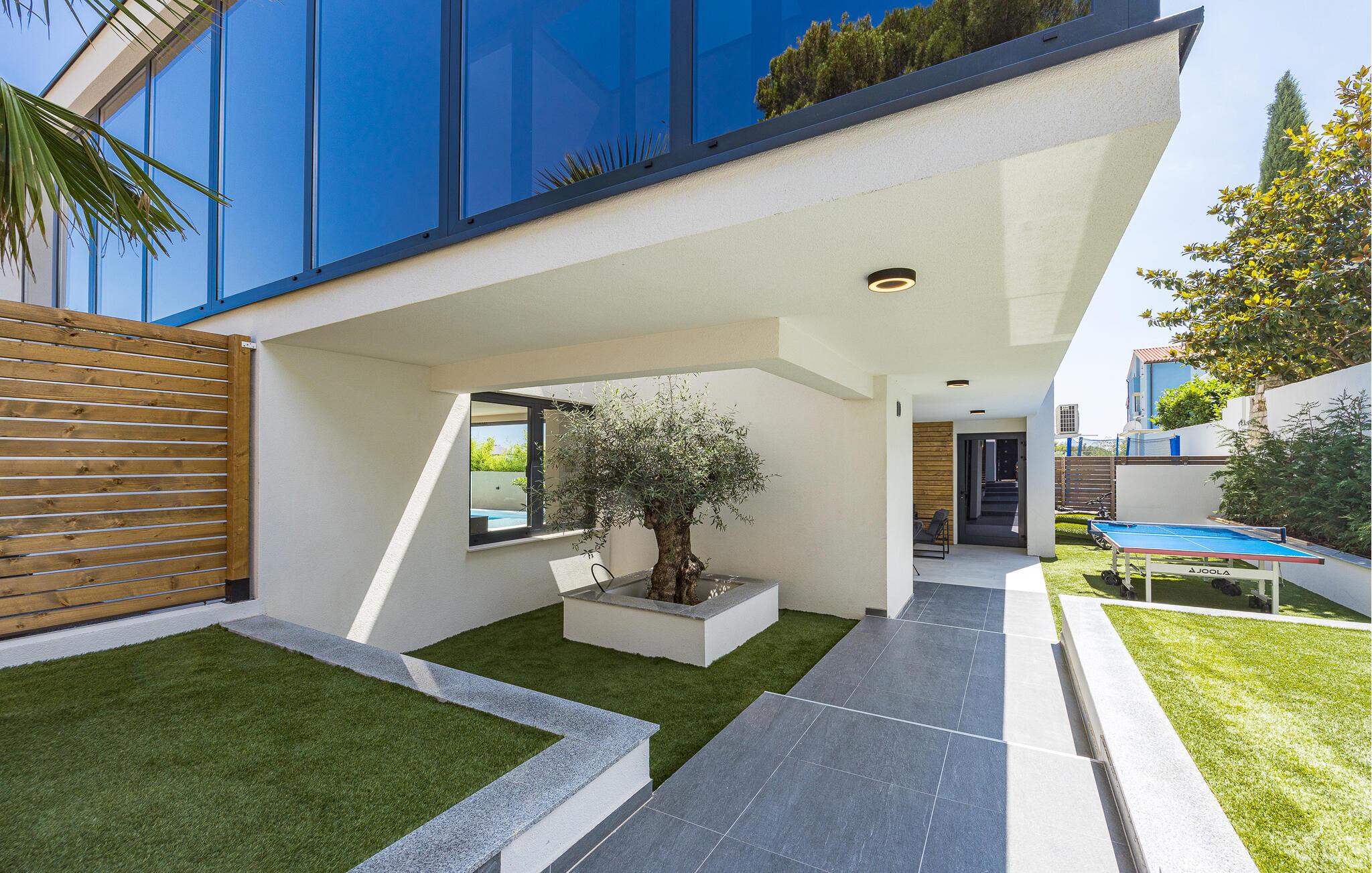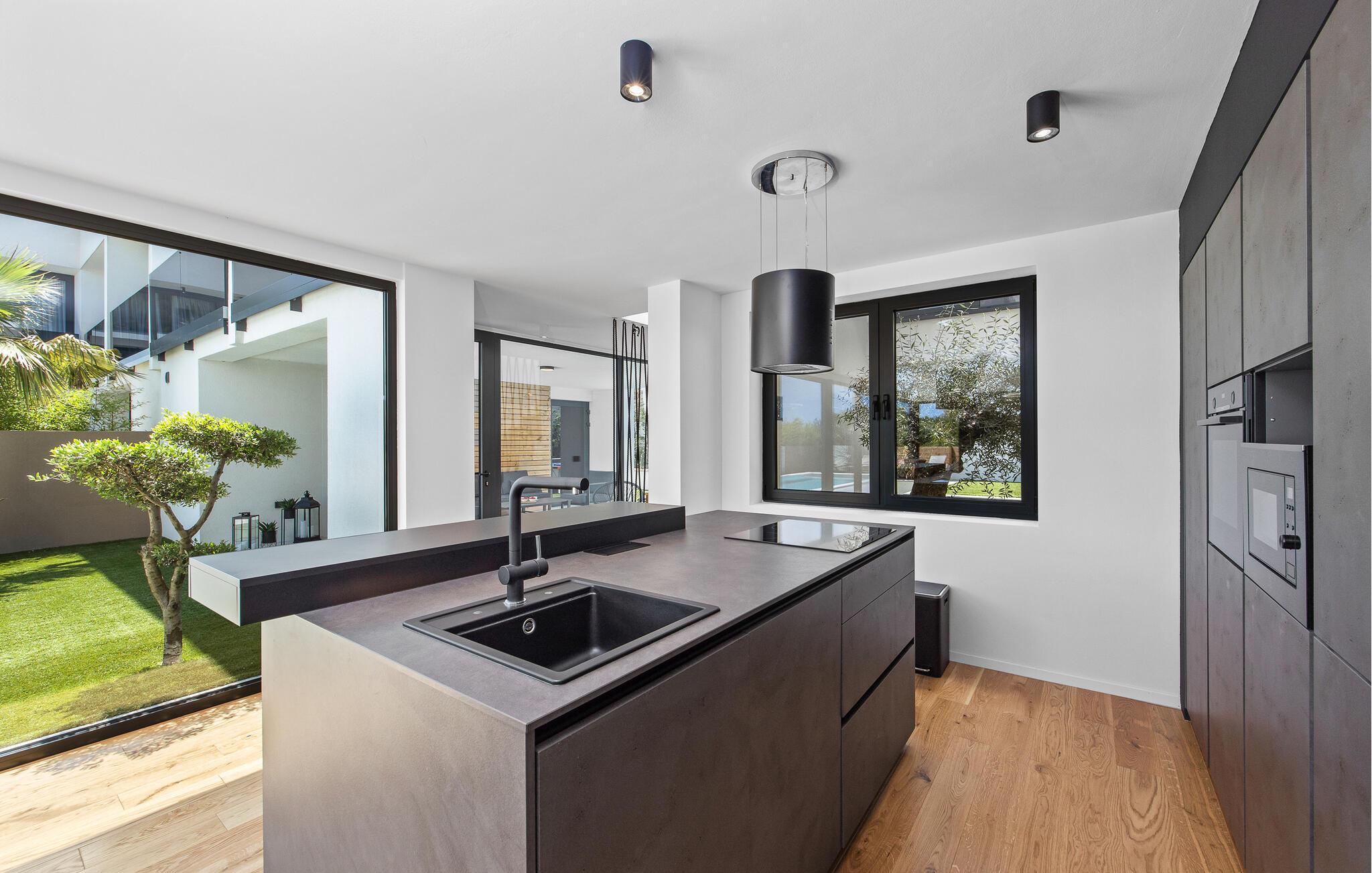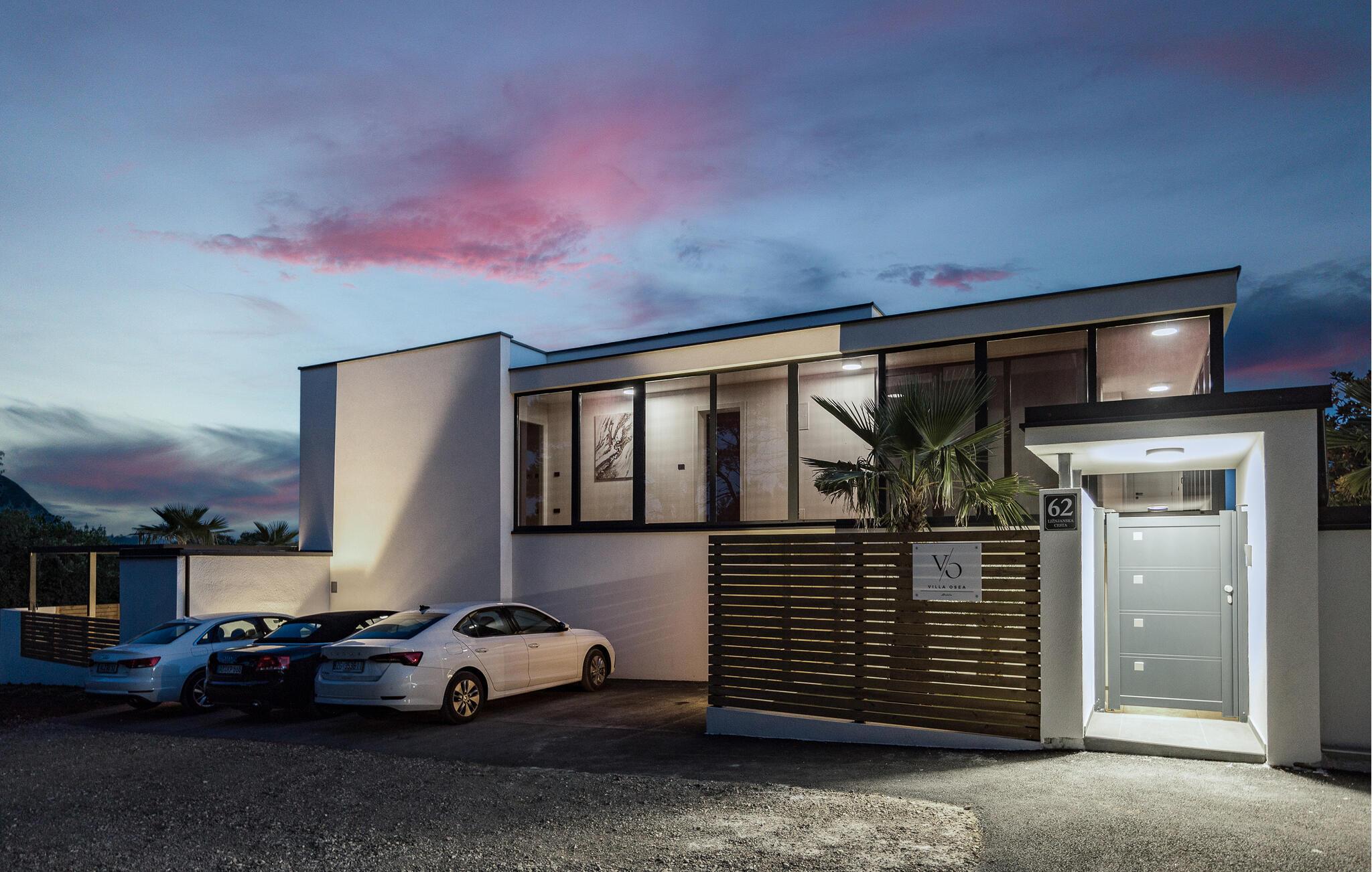 Dieses moderne Designerhaus wird Sie mit seiner außergewöhnlichen Architektur, eleganten Einrichtung und zahlreichen Annehmlichkeiten begeistern. Zelebrieren Sie das Zubereiten köstlicher Mahlzeiten in der hochwertigen Küche bei einem Glas Wein, entfachen Sie den Kamin und nehmen Sie im stilvollen Essbereich Platz. Verbringen Sie erholsame Momente in der Sauna und freuen Sie sich auf entspannte Filmabende im großen Wohnzimmer, wo großzügige Fensterfronten den Blick auf den stimmungsvoll beleuchteten Pool freigeben.