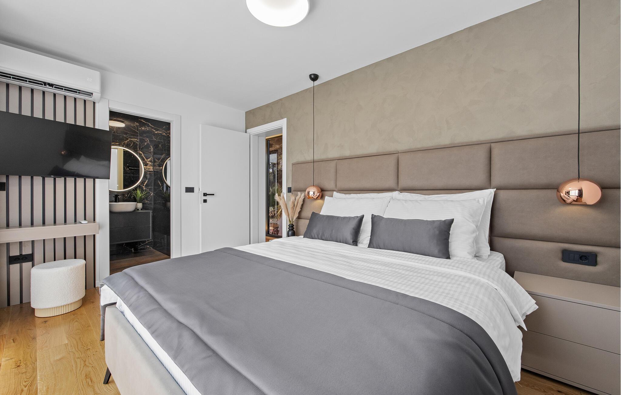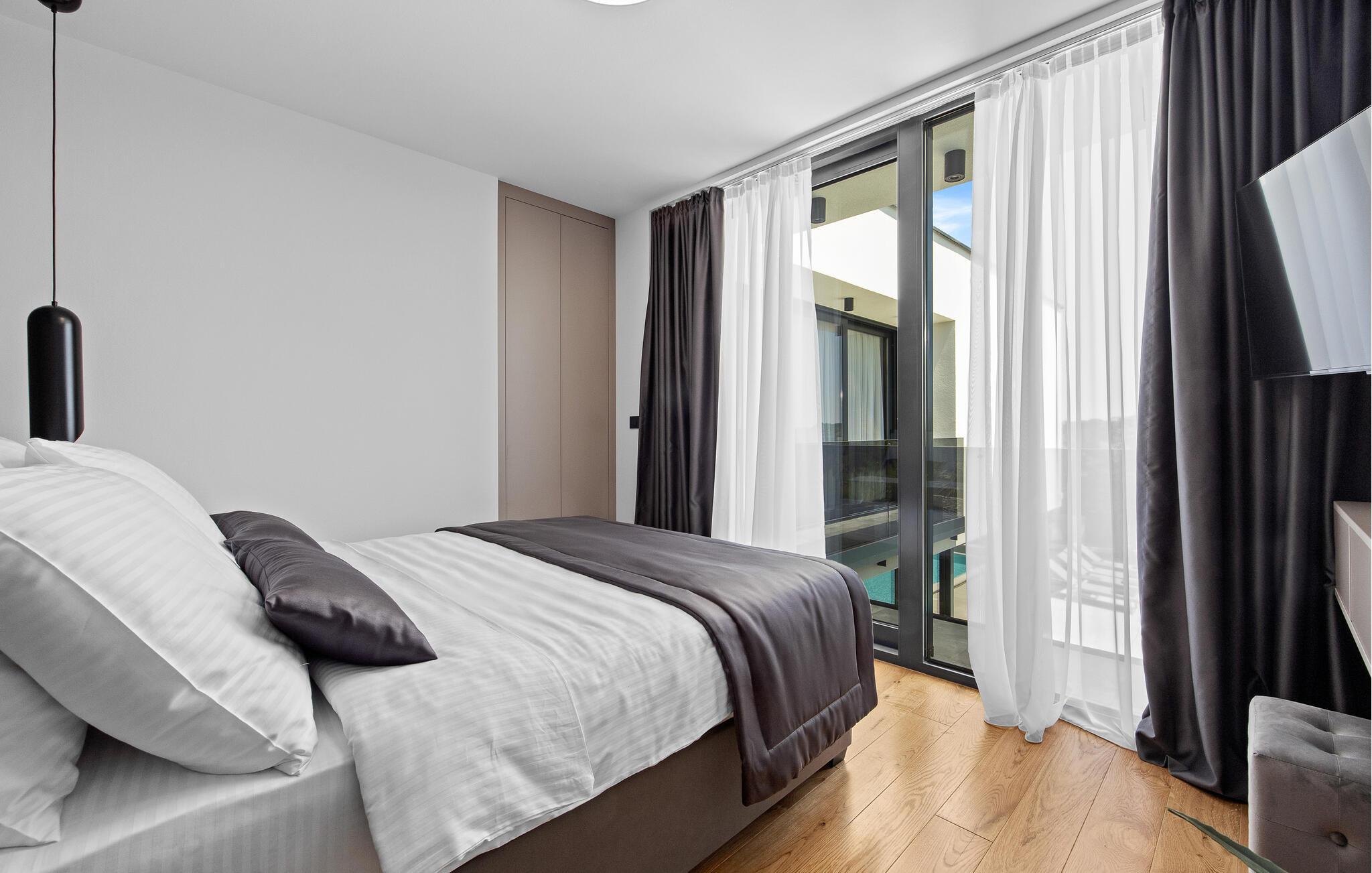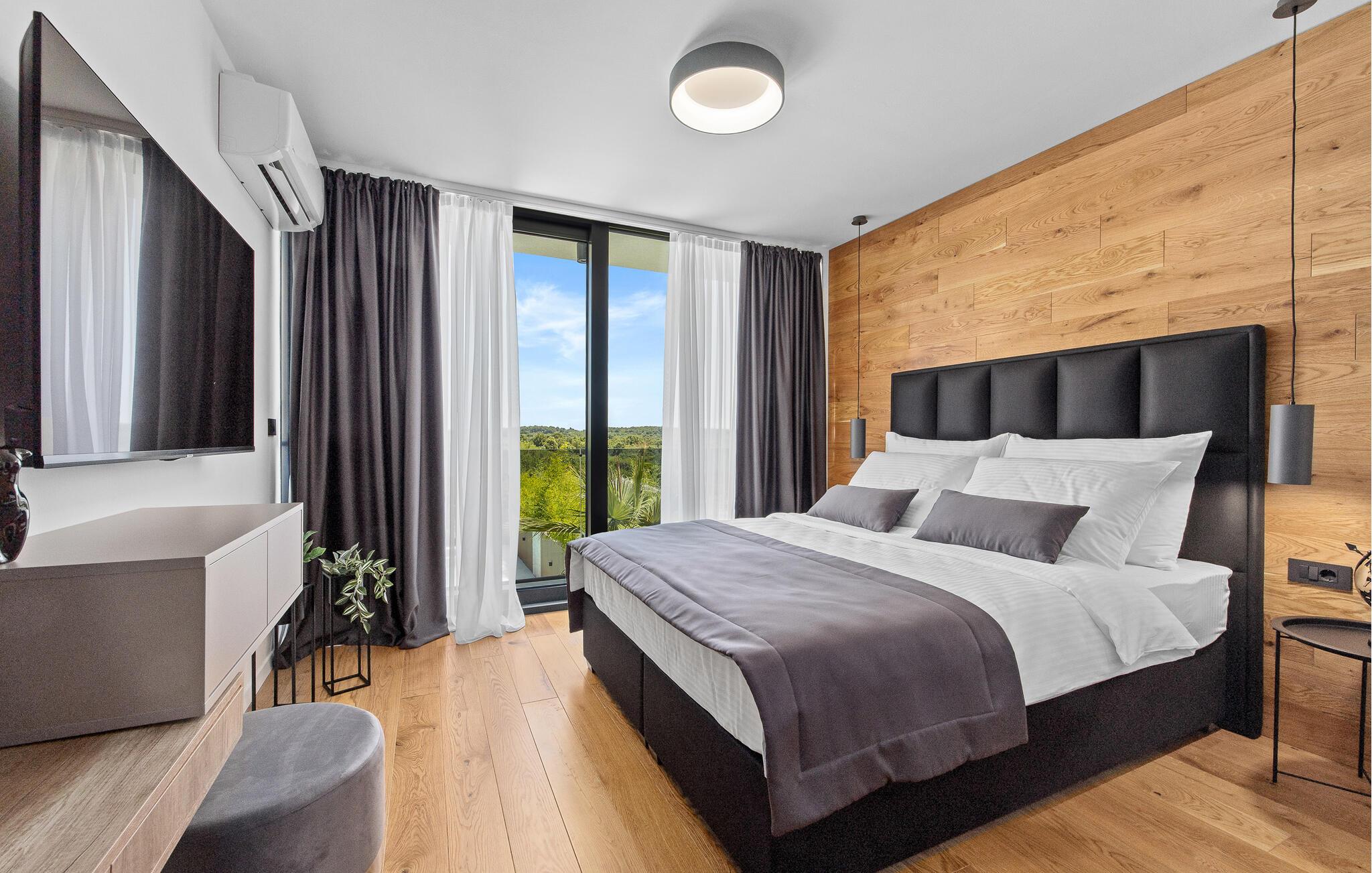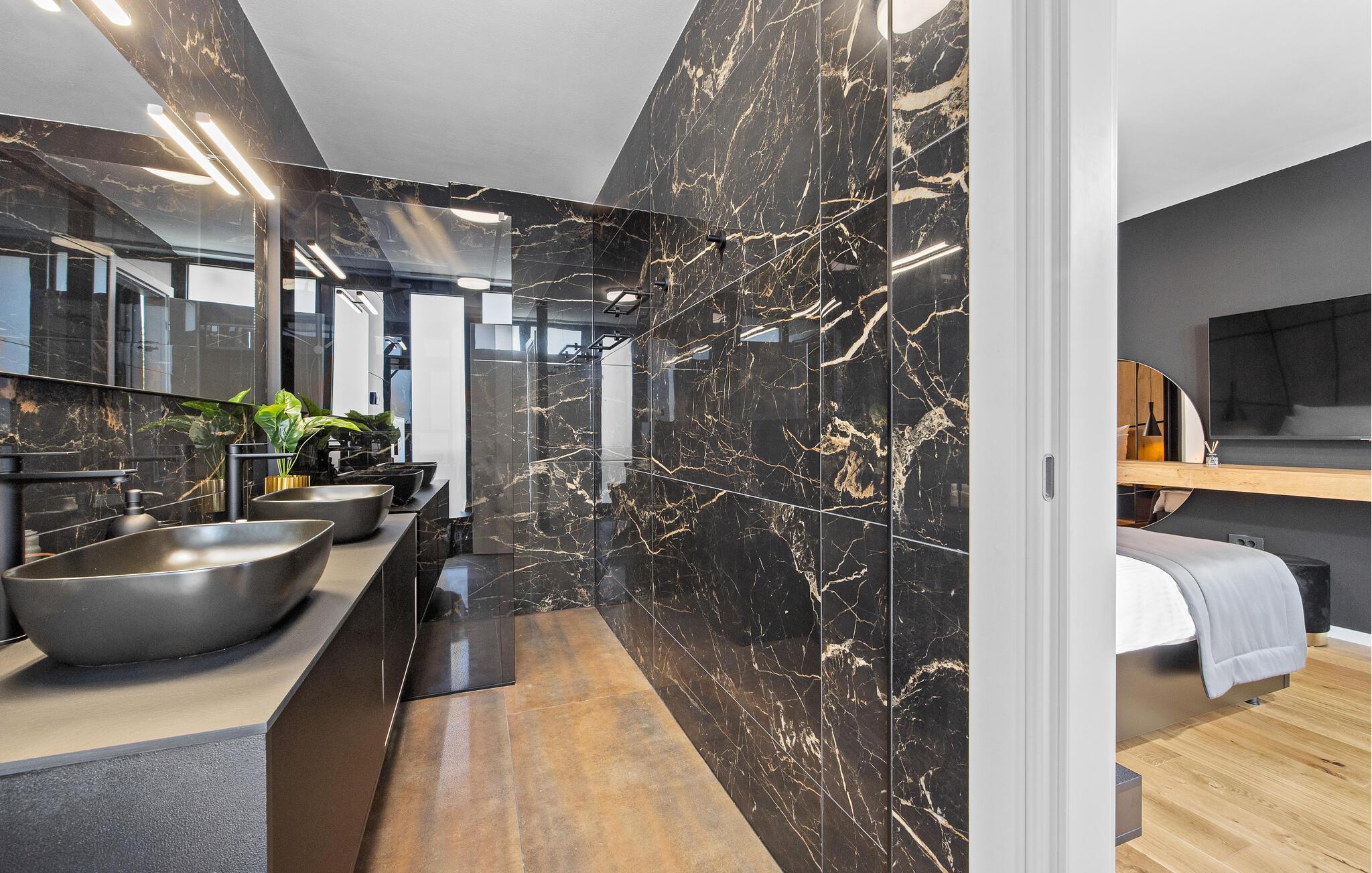Dieses moderne Designerhaus wird Sie mit seiner außergewöhnlichen Architektur, eleganten Einrichtung und zahlreichen Annehmlichkeiten begeistern. Zelebrieren Sie das Zubereiten köstlicher Mahlzeiten in der hochwertigen Küche bei einem Glas Wein, entfachen Sie den Kamin und nehmen Sie im stilvollen Essbereich Platz. Verbringen Sie erholsame Momente in der Sauna und freuen Sie sich auf entspannte Filmabende im großen Wohnzimmer, wo großzügige Fensterfronten den Blick auf den stimmungsvoll beleuchteten Pool freigeben.