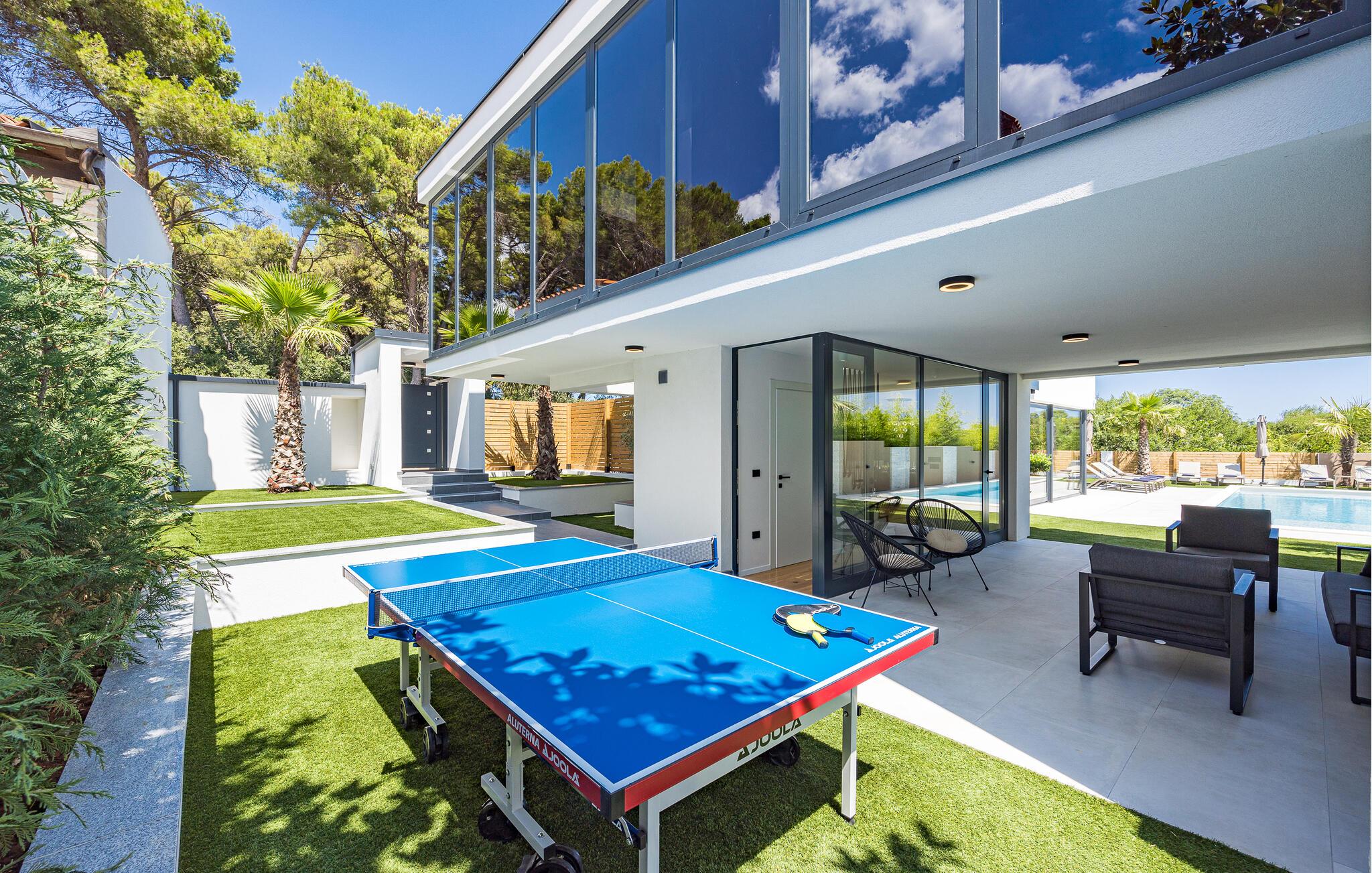 Starten Sie den Tag mit einem Frühstück auf der überdachten Terrasse, erfrischen Sie sich nach Lust und Laune im Pool und tanken Sie Sonne auf den bequemen Liegen. Liefern Sie sich spannende Tischtennis-Duelle und feiern Sie die mediterranen Sommernächte mit Spezialitäten vom Grill.