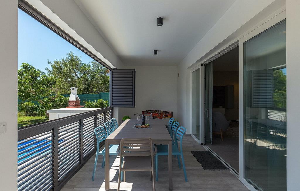 Der Wohnbereich hat direkten Zugang zum überdachten Essbereich im Freien mit Blick auf den erfrischenden Pool und den Garten. Hier können sich Familie und Freunde treffen und gemeinsame Mahlzeiten genießen, die auf dem Grill zubereitet werden.