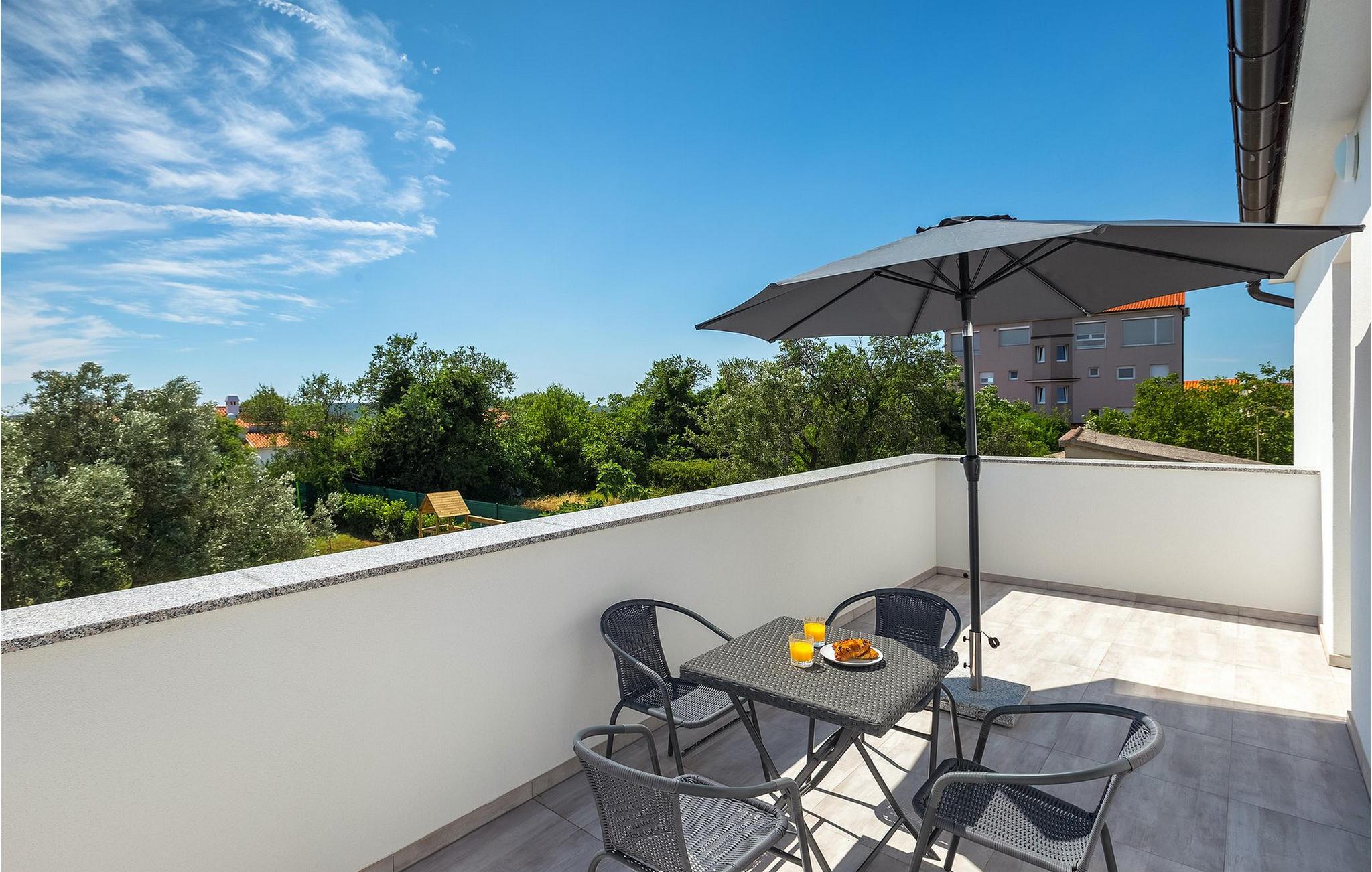 Die nicht überdachte Terrasse im ersten Stock bietet einen schönen Platz für Ihren morgendlichen Tee oder Kaffee, während Sie die schöne Aussicht auf Medulin und das weniger als einen Kilometer entfernte Meer genießen.