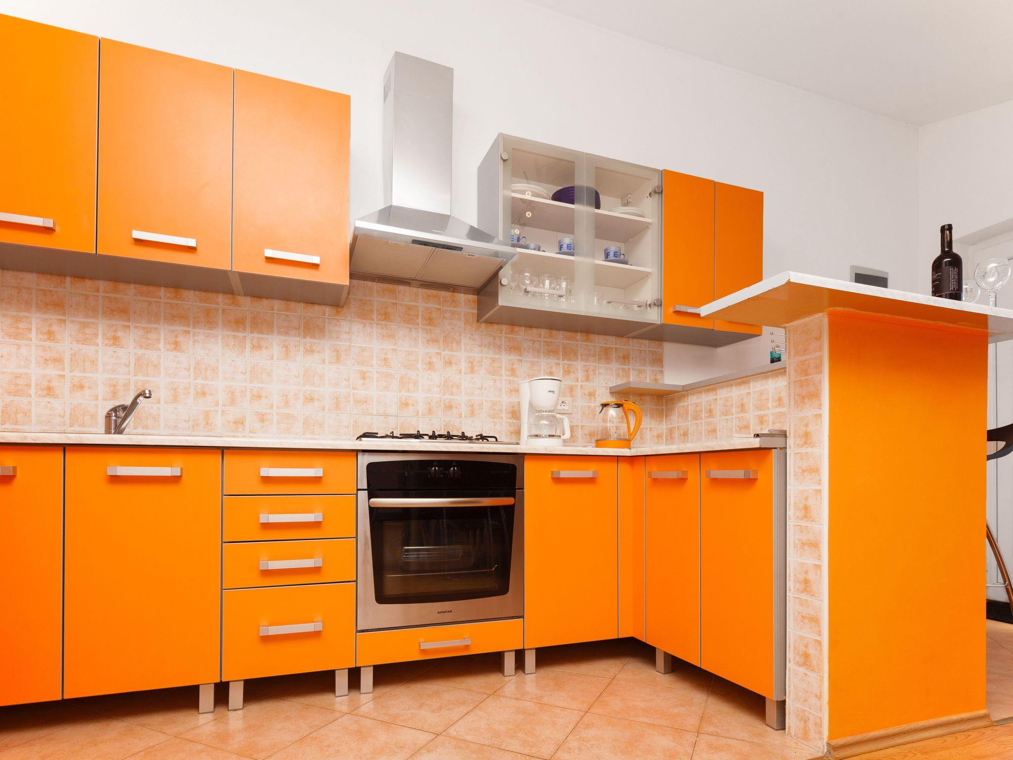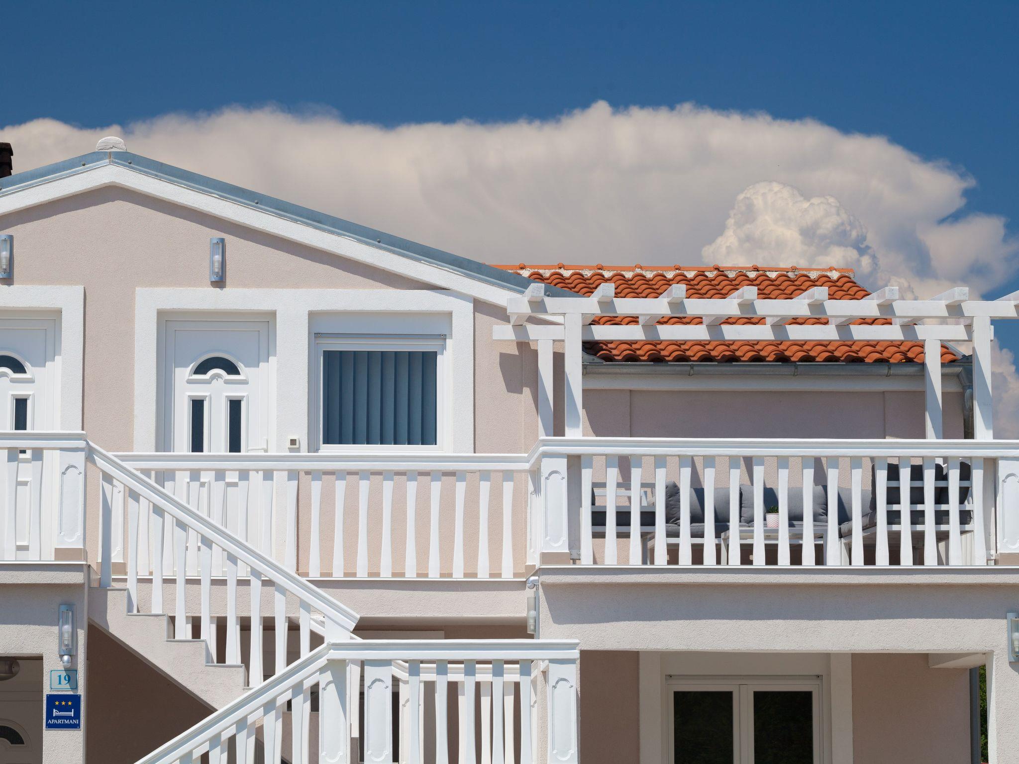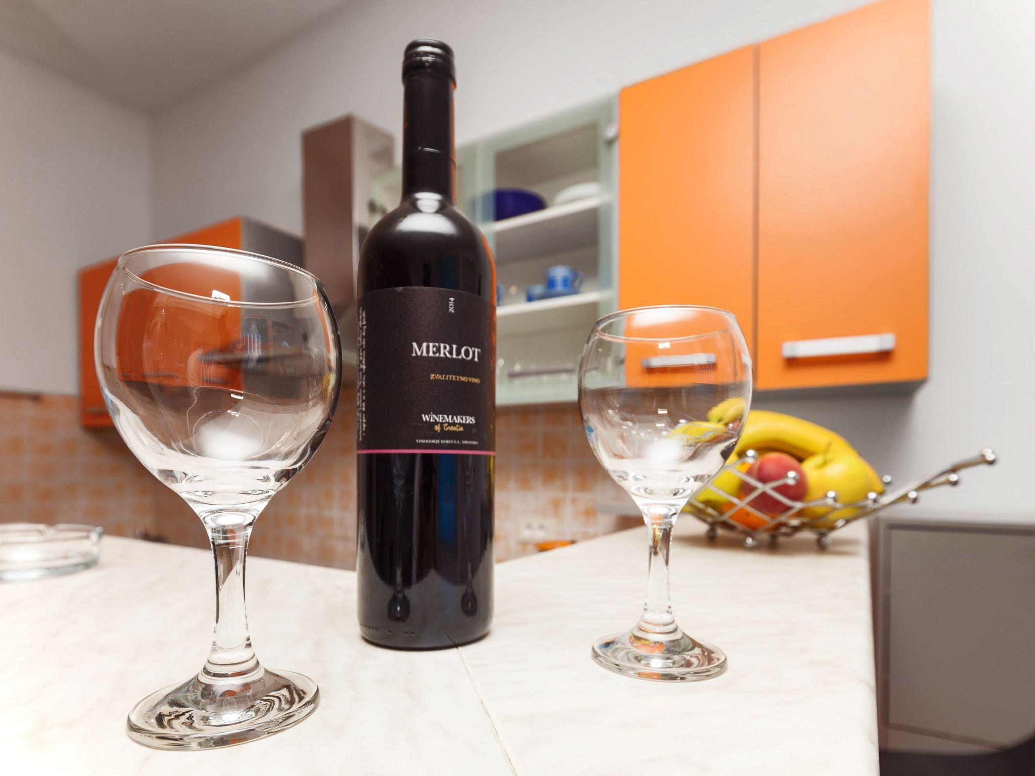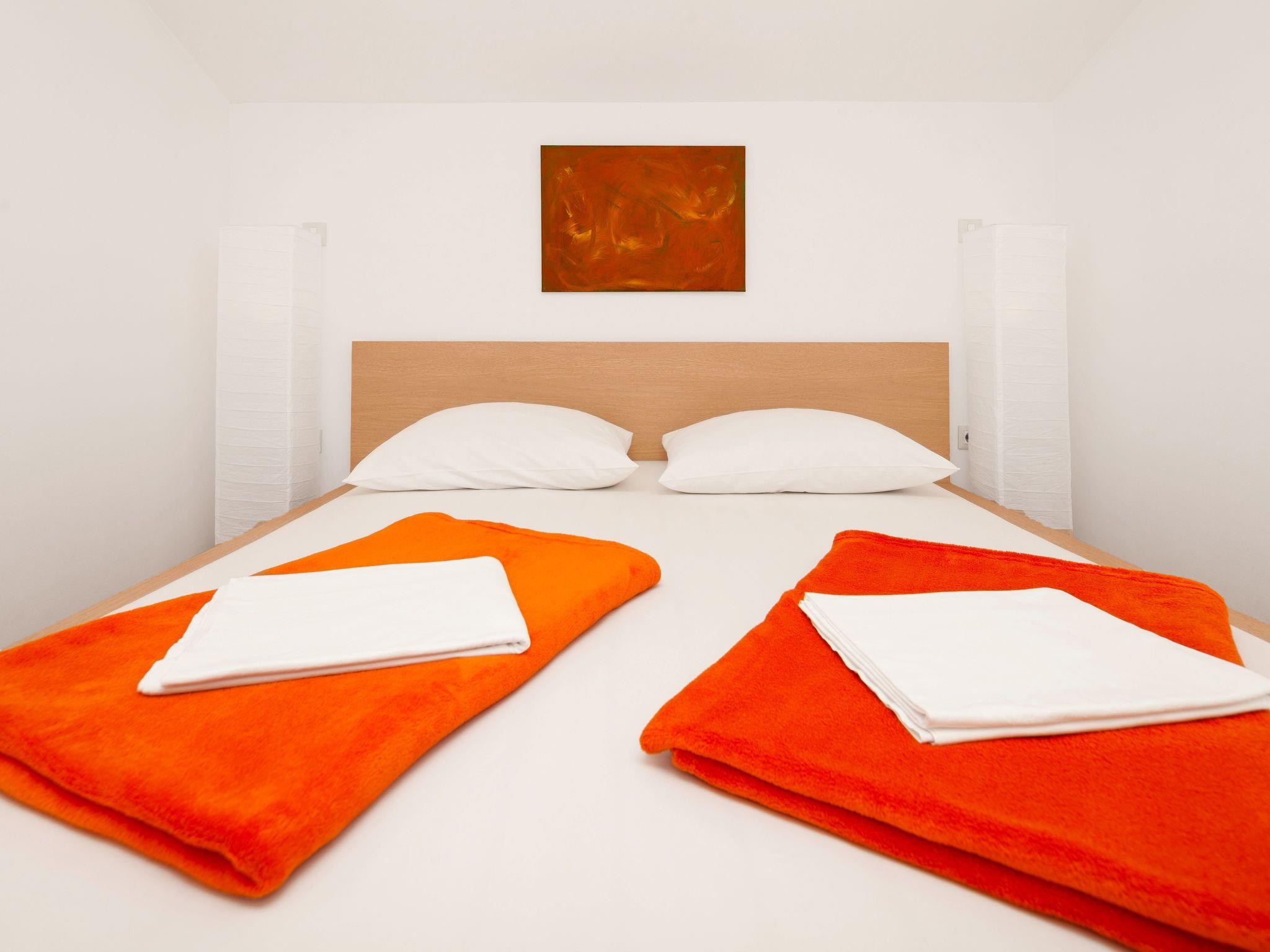 Die Wohnungen sind modern und freundlich eingerichtet. Fliesen-/Laminatboden. Es gibt Satelitten-TV, Internetzugang mit W-LAN, gratis, eine Waschmaschine und Bügeleisen/-brett und Klimaanlage mit Kühl-/Heizfunktion. Hinweis: Das Erdgeschoß bleibt verschlossen. Hier mieten Sie eine Drei-Zimmer-Wohnung in der ersten Etage (Dachschräge, nicht störend) mit ca. 60 m². Wohn-/ Schlafraum mit Bettcouch, Eßplatz, und einer durch eine Theke abgeteilten, offenen Küche (drei Flammen, eine Platte, Backofen, Wasserkocher, Toaster, Kaffeemaschine, Gefrierfach), Terrassenausgang. Es gibt ein Schlafzimmer mit französischem Bett und ein Zweibettzimmer. Im Bad befinden sich Dusche und WC.
