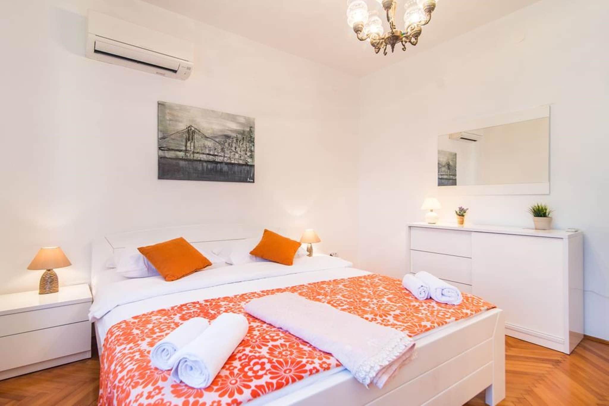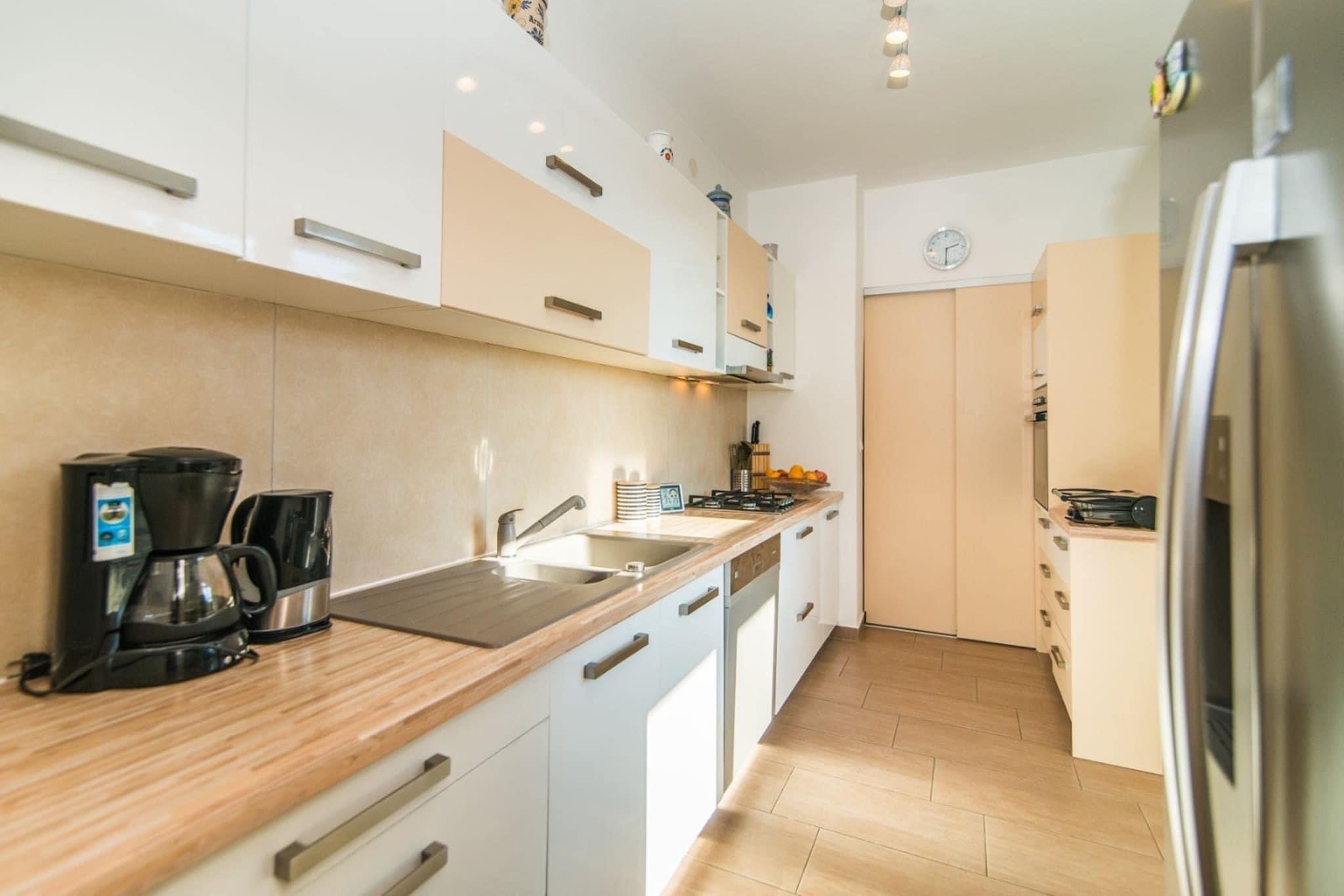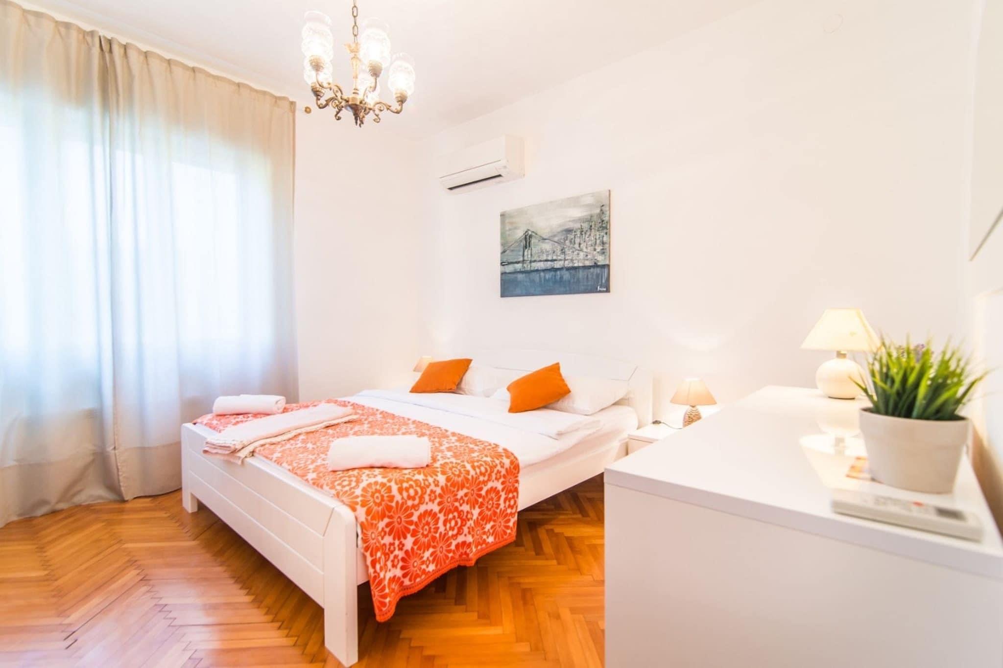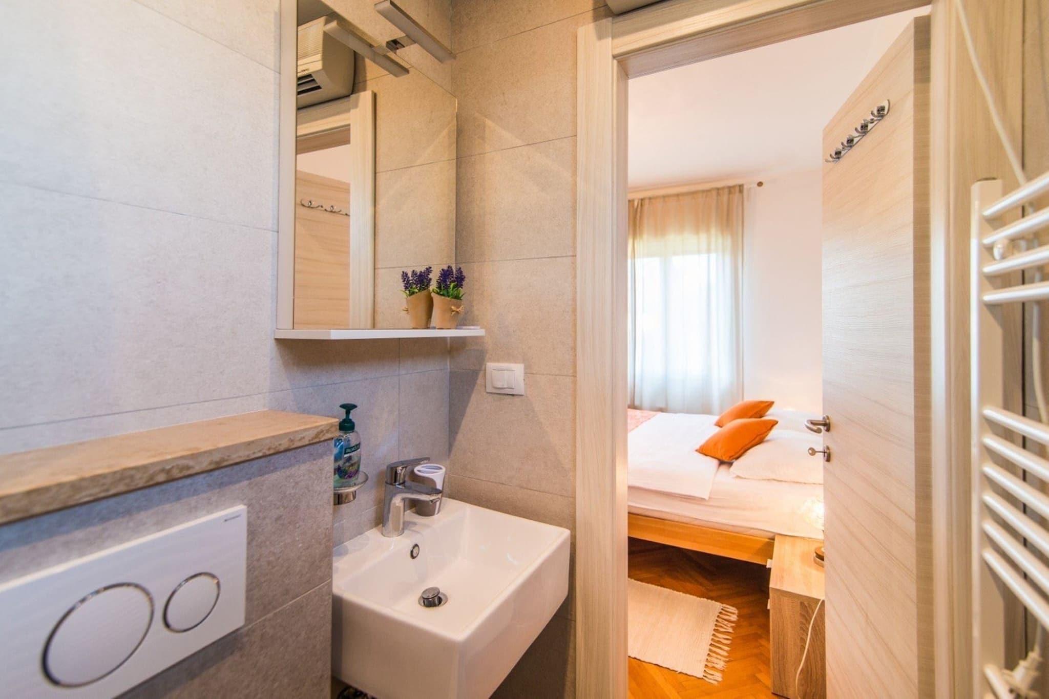 Dieses geräumige Apartment mit drei Schlafzimmern ist ideal für Familien oder Gruppen von bis zu sechs Personen und bietet einen komfortablen und erholsamen Aufenthalt in Medulin. Mit zwei Badezimmern (eines davon en suite), einer voll ausgestatteten Küche und einem geschmackvoll eingerichteten Wohnzimmer sorgt dieses Apartment für ein angenehmes Erlebnis. Die 20 m² große Terrasse bietet einen atemberaubenden Meerblick und ist ideal, um Mahlzeiten im Freien zu genießen oder an der frischen Luft zu entspannen. Das Apartment ist mit Klimaanlage in zwei Zimmern und drei internetfähigen Fernsehern ausgestattet und bietet Gästen Komfort und Unterhaltung. Für längere Aufenthalte steht eine Waschmaschine zur Verfügung. Für Familien mit Kleinkindern ist auf Anfrage ein Babybett verfügbar. Das Apartment liegt verkehrsgünstig nur 500 Meter vom nächsten Strand entfernt. Alles, was Sie brauchen, ist fußläufig erreichbar, darunter ein Restaurant, ein Lebensmittelgeschäft, eine Apotheke und eine Bushaltestelle (200 Meter entfernt). Der Flughafen Pula ist etwa 12 km entfernt und somit ideal für Flugreisende. Medulin ist vor allem für seinen Sandstrand Bijeca bekannt, der Familien und alle, die eine entspannte Atmosphäre suchen, anzieht. Darüber hinaus bietet die Gegend zahlreiche Möglichkeiten für Outdoor-Aktivitäten wie Wandern, Radfahren und die Erkundung der nahegelegenen historischen Stätten wie dem Archäologischen Park Vizula und dem Nationalpark Brijuni. Das Apartment verfügt über eine moderne und voll ausgestattete Küche, ideal für die Zubereitung hausgemachter Mahlzeiten. Das gemütliche Wohnzimmer lädt nach einem erlebnisreichen Tag zum Entspannen ein. Kostenloses WLAN und Klimaanlage sorgen für einen komfortablen Aufenthalt, während die Außenterrasse den herrlichen Meerblick bietet.