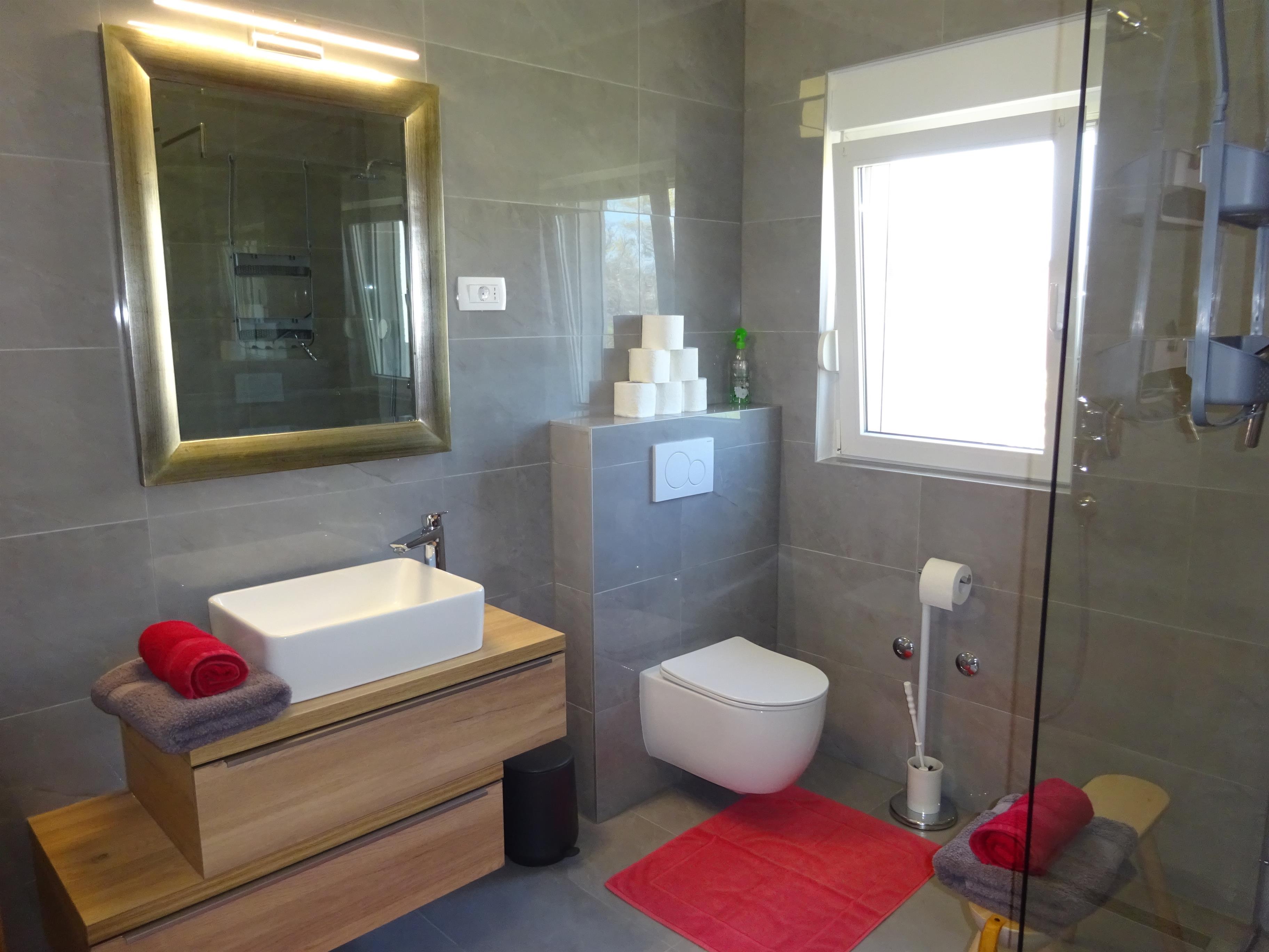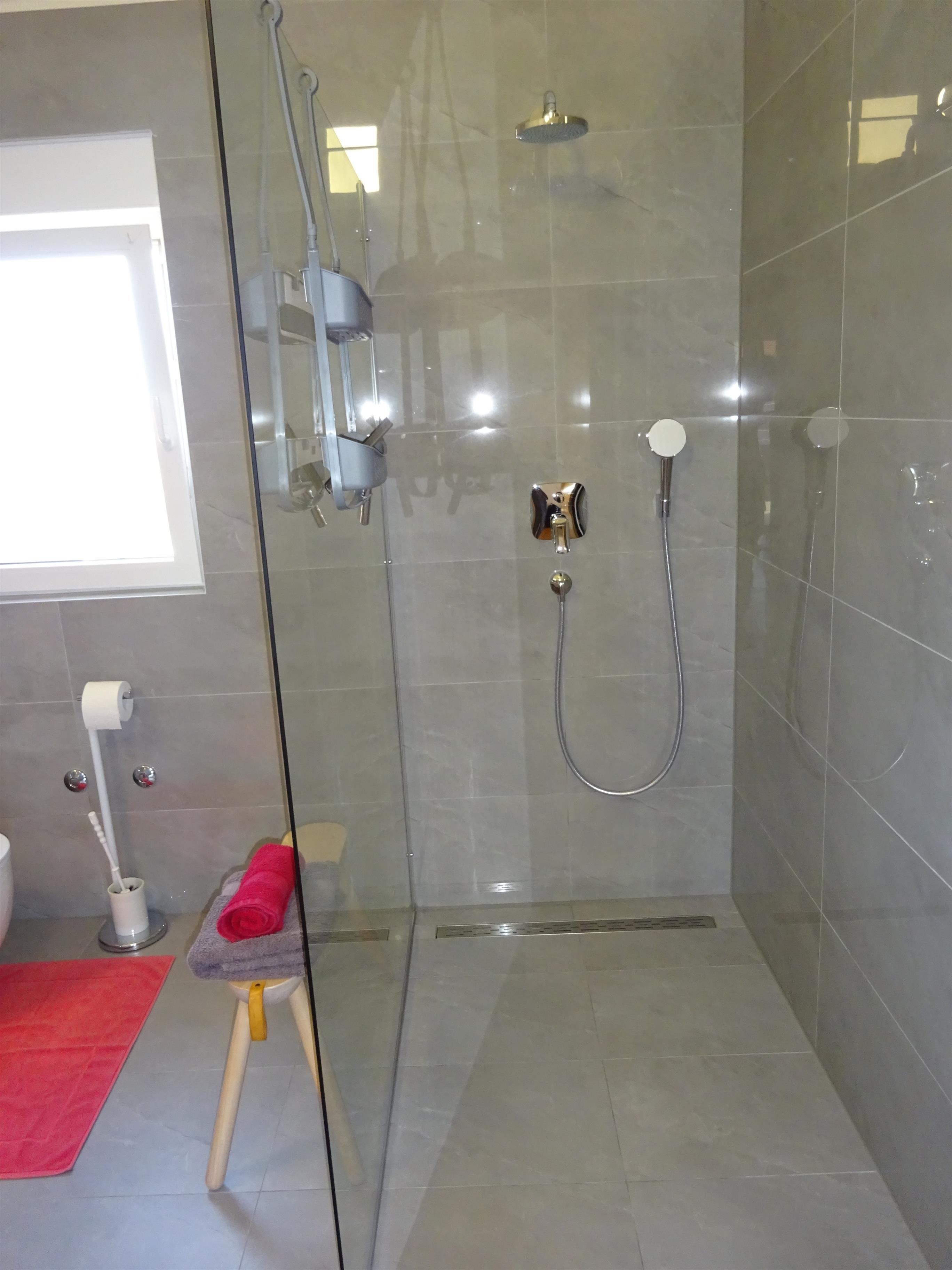 Sie haben ein großes Badezimmer mit einer begehbaren Dusche. Im Badezimmer befindet sich auch noch ein Haarföhn zu Ihrer Verwendung.