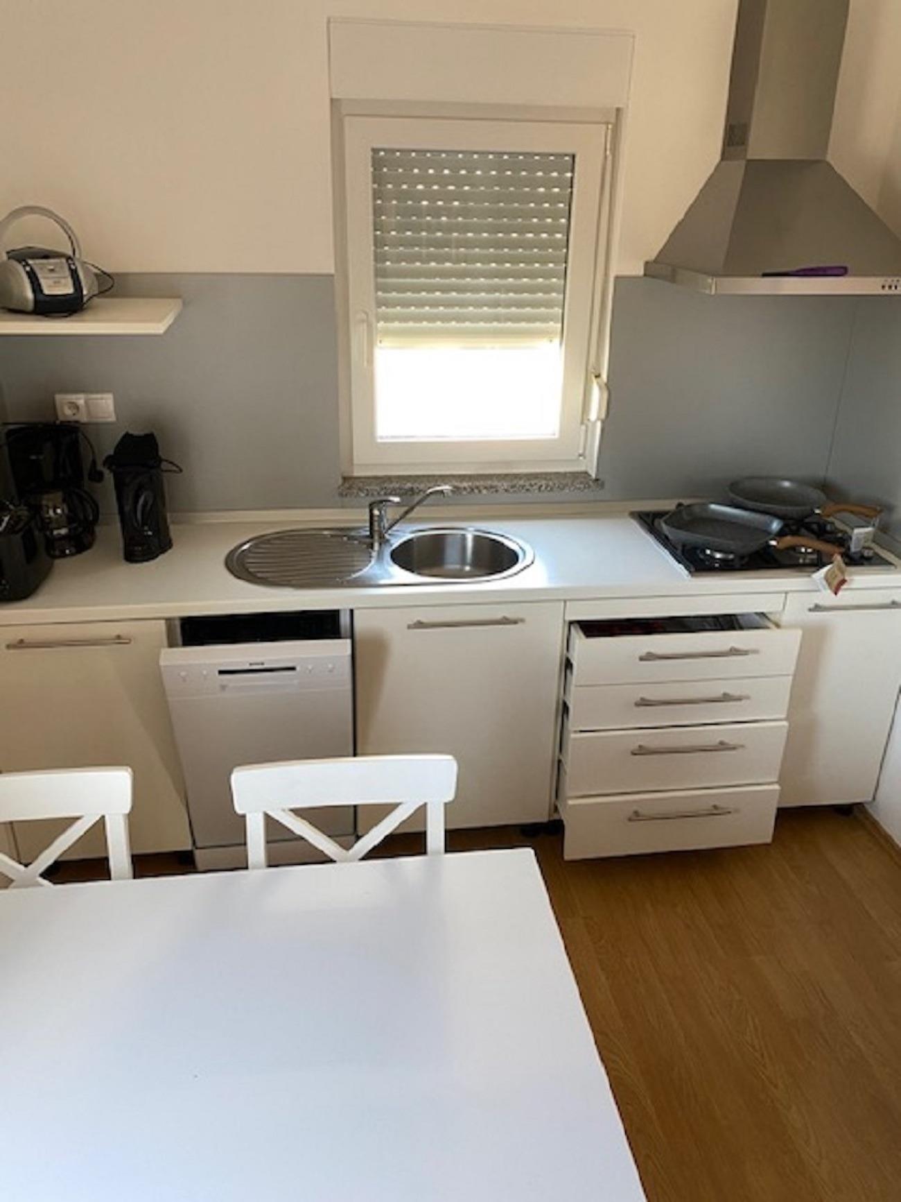 Die separate Küche ist ausgestattet mit einem 4-Flamm-Gasherd, großem Kühlschrank, Spülmaschine, Kaffeemaschine (Filter und Kapselmaschine), Toaster und Wasserkocher.