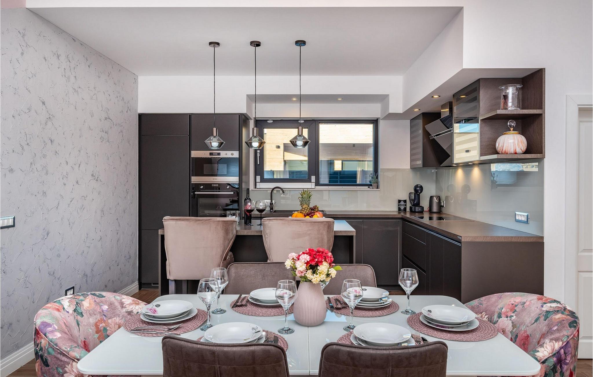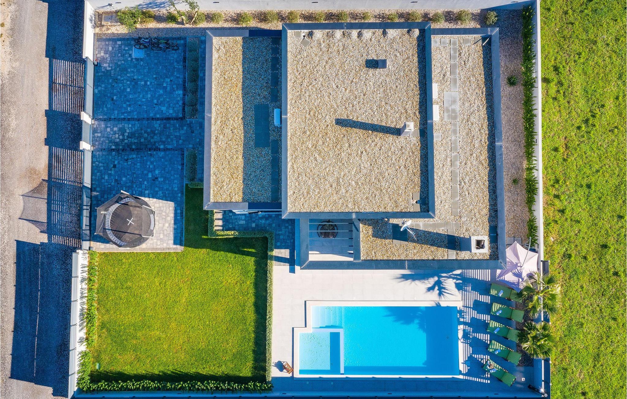 Nur eine kurze Autofahrt von einem der schönsten Strände Kroatiens, dem Queen's Beach, entfernt, bietet Ihnen dieses luxuriöse Ferienhaus höchsten Komfort. Die geschmackvoll eingerichteten Schlafzimmer sowie die Badezimmer, eines mit einer Massagebadewanne, laden Sie zur täglichen Entspannung ein. Die moderne Küche und das harmonische Wohnzimmer mit Zugang zur Terrasse und dem Gartenbereich sind ideal für gesellige Stunden. Grillen Sie am Abend auf der Terrasse, während Ihre Kinder sich über ein Trampolin und den kleinen beheizten Kinderpool im Garten freuen, während Sie im großen Pool relaxen.