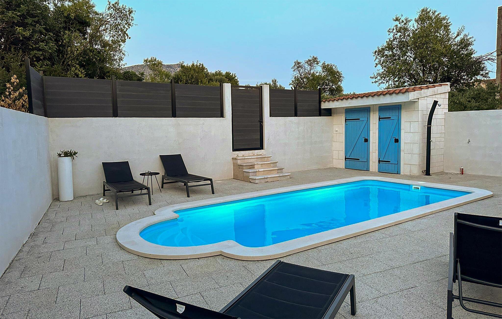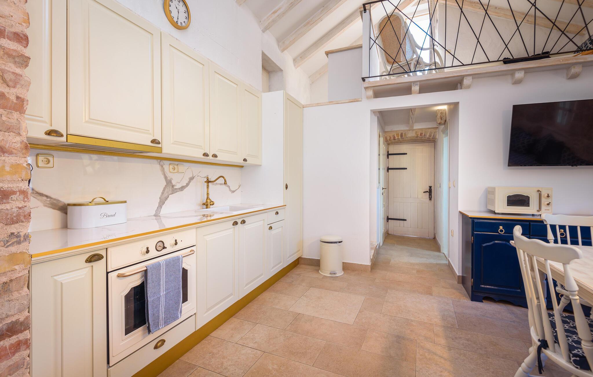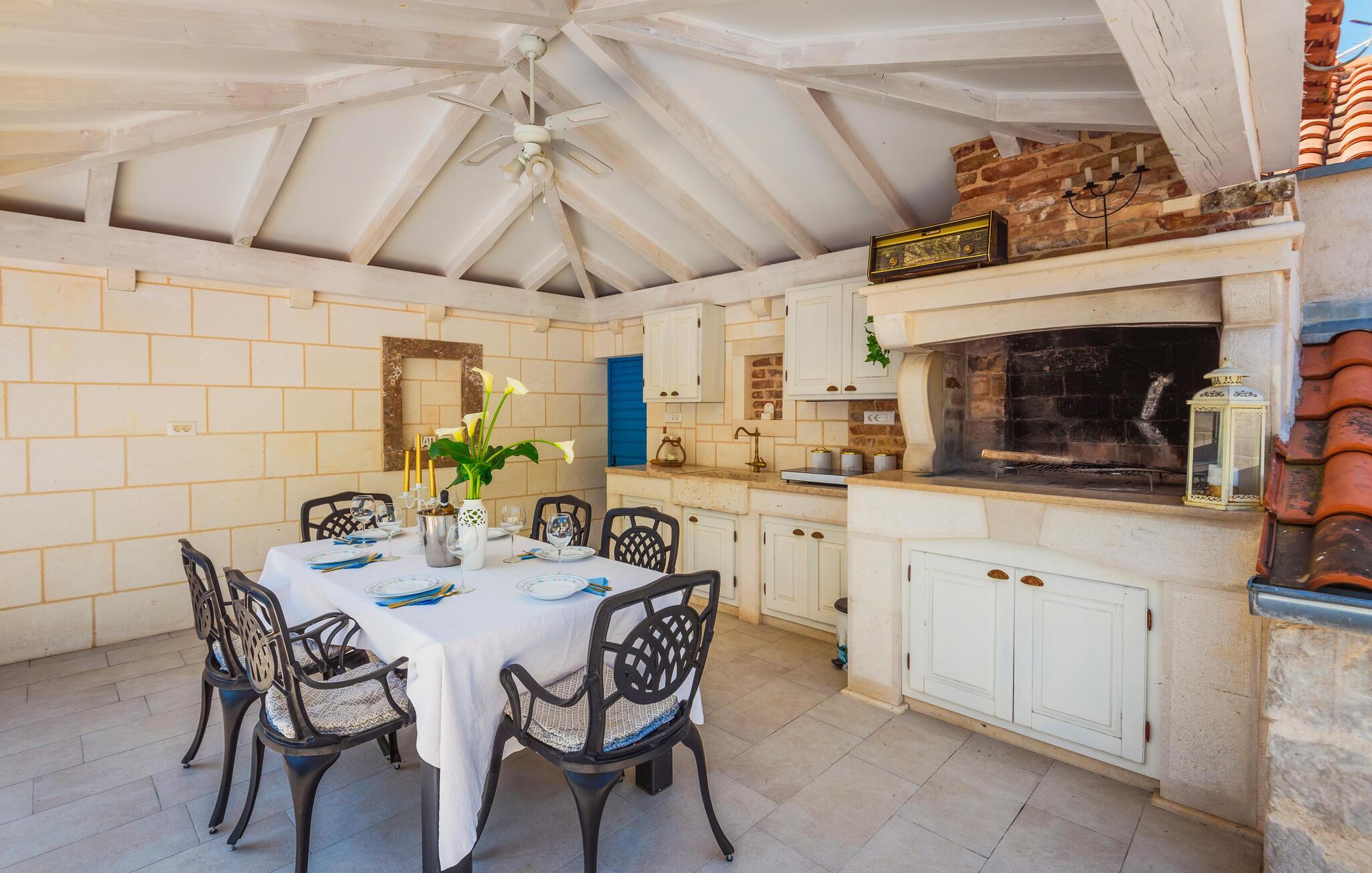 Begeben Sie sich morgens gut ausgeruht in die Küche, die Sie mit einem rustikalen Charme begrüßt, und bereiten Sie ein üppiges Frühstück für die ganze Familie zu. Servieren können Sie Ihre Mahlzeiten am langen Esstisch in der Küche oder draußen auf der überdachten Terrasse mit Grill und Außenküche. Setzen Sie sich später mit einem erfrischenden Getränk auf die oben gelegene Terrasse und genießen Sie das glitzernde Blau des Meeres am Horizont. Lassen Sie die friedliche Atmosphäre und die frische Luft auf sich wirken. Und nutzen Sie den privaten Pool für eine erfrischende Abkühlung und entspannen Sie auf den bequemen Sonnenliegen.