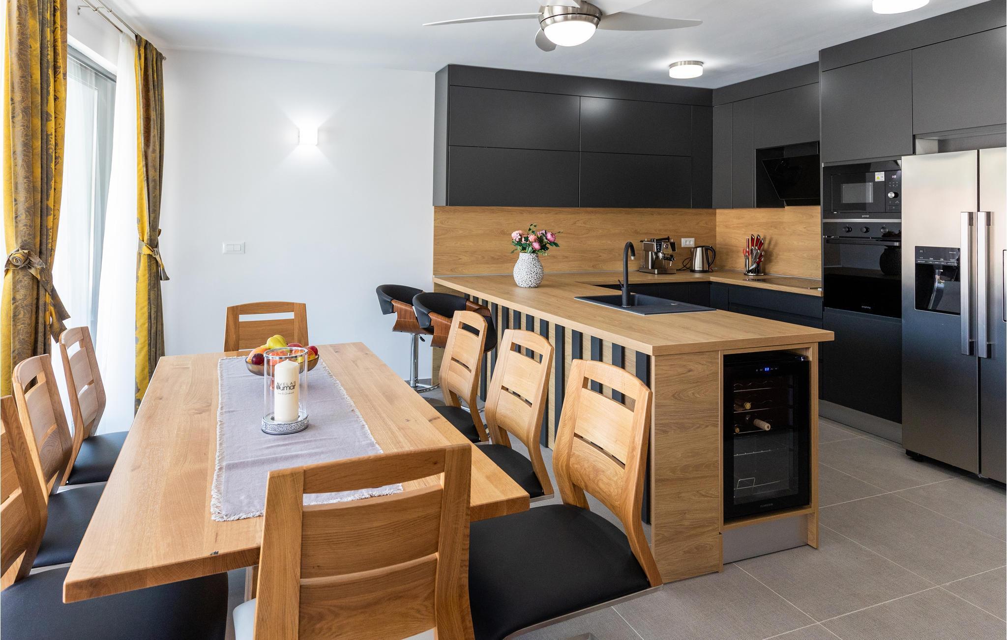 Willkommen in diesem ansprechenden und komfortablen Haus, das Ihnen alle Annehmlichkeiten für den Urlaub bietet. Genießen Sie eine unvergessliche Zeit mit der Familie in dem Haus, das durch die gediegene Einrichtung und große Panoramafenster besticht. Verbringen Sie hier gemütliche Abende mit Spielen und guten Gesprächen am langen Esstisch oder auf einladenden Sofas.