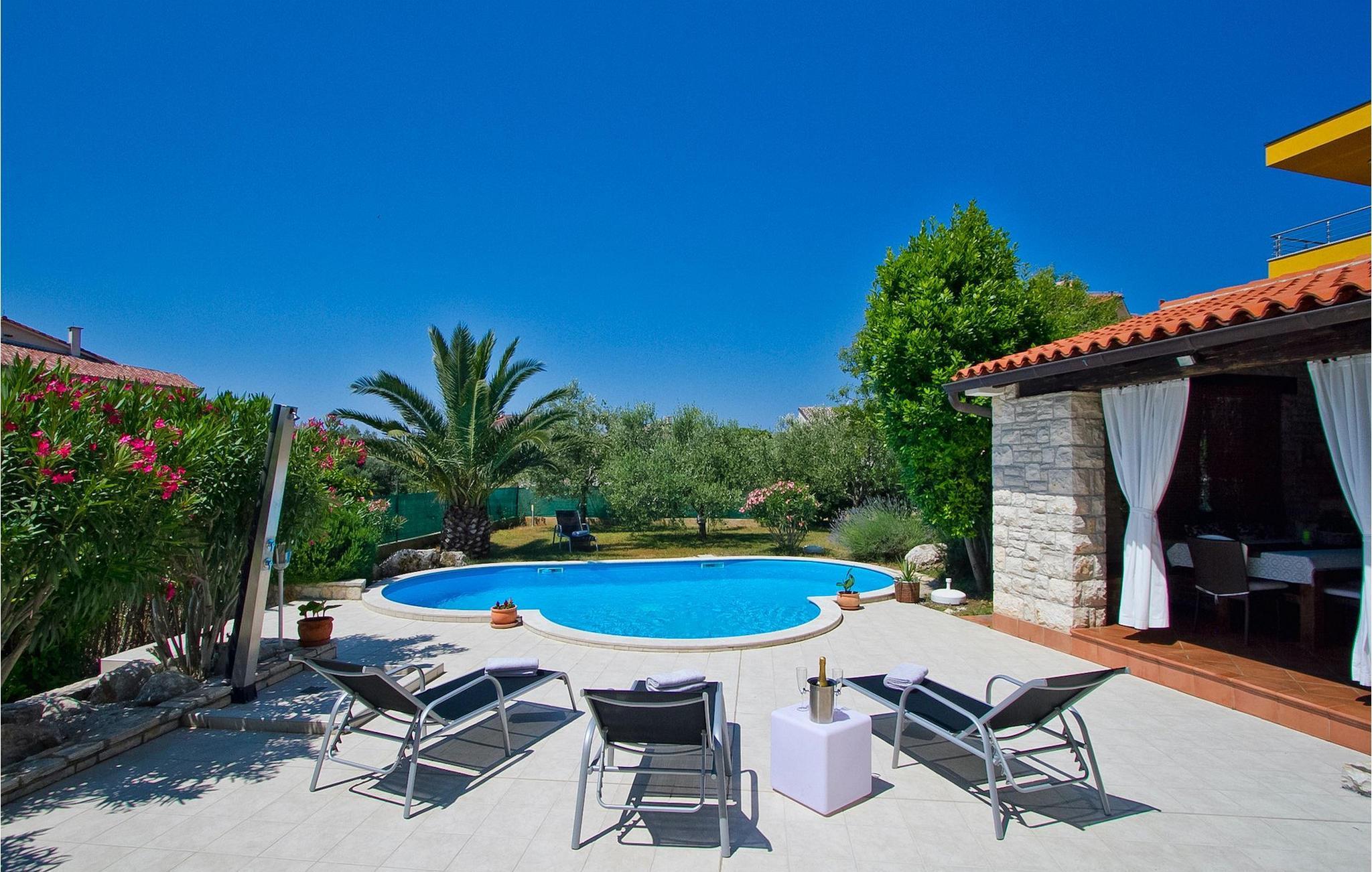 Diese schöne 3-Schlafzimmer-Villa mit privatem Swimmingpool ist in ausgezeichneter Lage im Dorf Premantura in der Nähe von Pula. Die Villa ist in kurzer Gehentfernung vom geschützten Kap Kamenjak Naturpark. Premantura ist von der Natur umgeben – eine Seltenheit. Südlich von der Stadt liegt Kap Kamenjak: eine geschützte Landschaft, 9,5 km lang und 1,5 km breit, mit insgesamt 30 km zerklüfteter Küste. In keinem anderen Ort in der Welt ist das Meer so blau-grün und sauber wie hier, am südlichsten Zipfel Istriens. Hier sind zahlreiche felsige Strände, sowie Kiesbuchten. Draußen befinden sich ein schön gepflegter Garten mit Privatpool und ein großer, überdachter Essbereich mit eingebautem Grill. Drinnen gibt es einen geräumigen Wohnbereich und 3 Doppelschlafzimmer im Obergeschoss. Die Villa ist klimatisiert, mit WLAN und Mini-Fitnessbereich ausgestattet. 2 Parkplätze sind vorhanden.