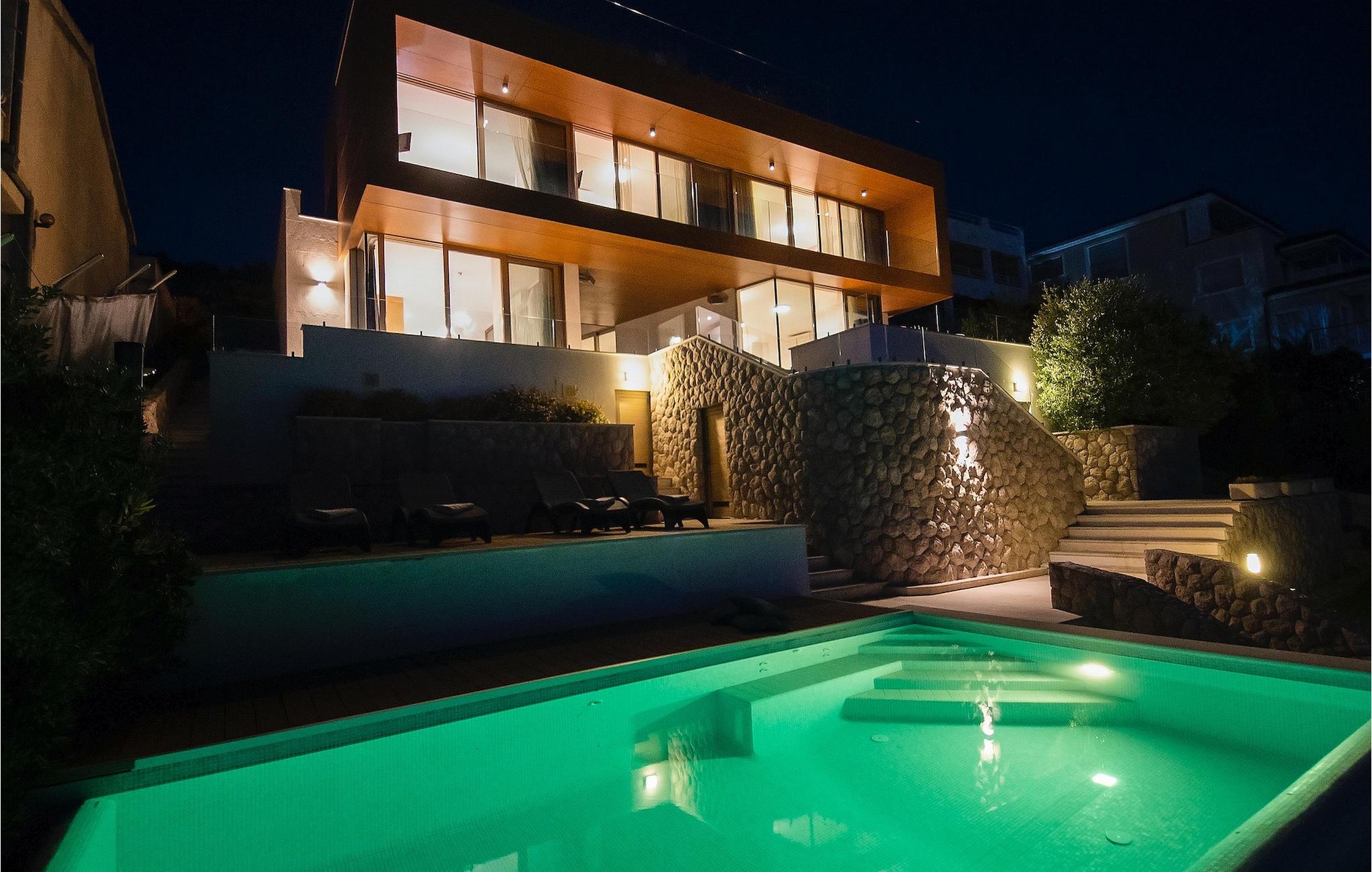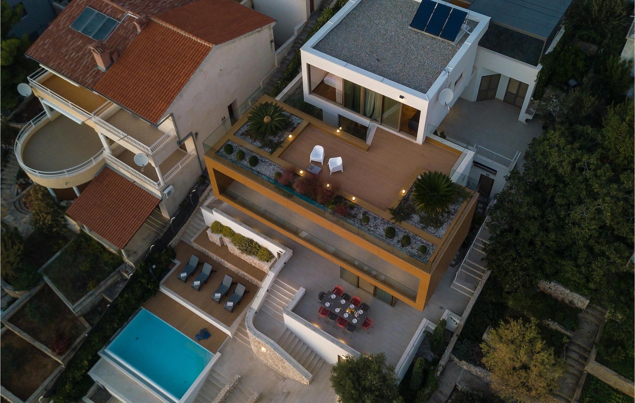 Wenn man in den Hof der Villa geht, sieht man zuerst den Infinity Pool, wo man sich entspannen kann. Der Blick auf das Meer, während Sie im Pool schwimmen, wird Sie faszinieren. Die Villa bietet Billard und Tischfußball für zusätzliche Unterhaltung. Der zusätzliche Reinigungsdienst steht auf Anfrage kostenlos zur Verfügung. Die Villa bietet kostenlosen WiFi und einen abgedeckten Parkplatz für 4 Autos. Wenn Sie von einem schönen Urlaubsort träumen, ist Villa Gloss die perfekte Wahl. Packen Sie Ihre Koffer und buchen Sie Villa Gloss für unvergessliche Momente.Die Villa Gloss liegt an der dalmatischen Küste im keinen Dorf Bilo nahe der beliebten Stadt Primosten. Primosten ist ein berühmtes Touristenziel in Dalmatien und gilt als eine der schönsten Städte an der Adria. Wenn Sie vom Urlaub mit einem spektakulären Blick auf die Mittelmeerlandschaft und einem glasklaren Meer träumen, dann ist die Lage der Villa Gloss ideal für Sie. In Primosten finden Sie alles, was Sie für einen angenehmen Urlaub brauchen, wie Geschäfte, Restaurants, verschiedene Aktivitäten, beliebte Clubs, Veranstaltungen in der Stadt und unberührte Natur mit wunderschönen Stränden und klarem Meer. Planen Sie eine Exkursion mit ihrer Familie? Besuchen Sie den Nationalpark Krka. Nur 30 Minuten Schifffahrt trennt Sie vom Nationalpark Kornati mit rund 60 Inseln. Wir sind sicher, dass Sie von diesem großartigen Gebiet begeistert sein werden. Es gibt Wander- und Fahrradwege nicht weit von der Villa, so dass Sie diese unberührte Natur erforschen können.