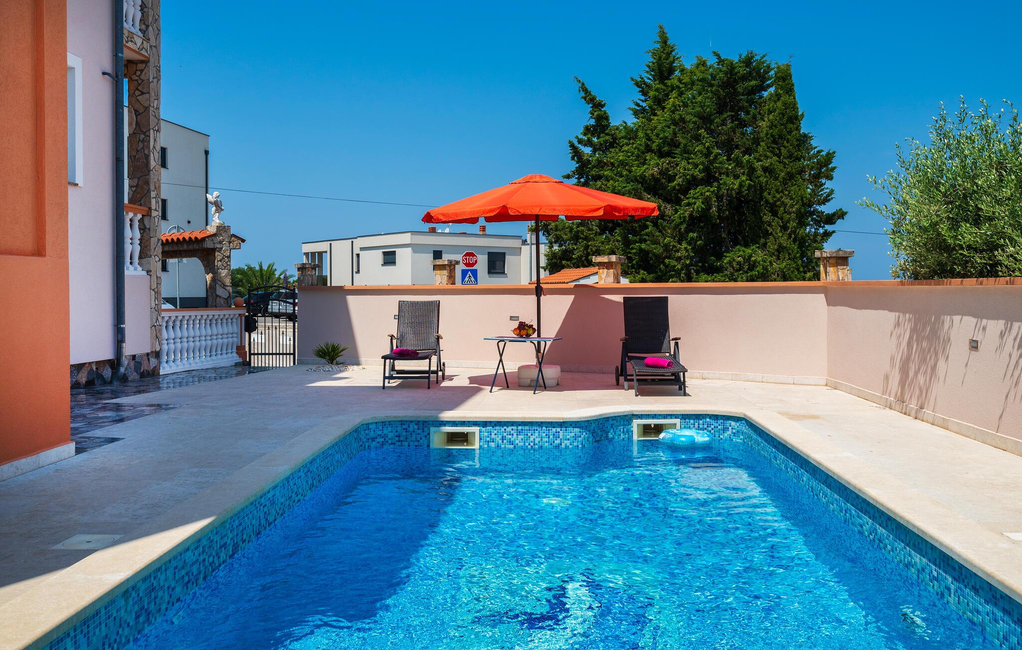Hier handelt es von einer komfortablen Wohnung, die funktionell ausgestattet und geschmackvoll möbliert ist. Diese einfache und sonnige Atmosphäre wird Ihnen gefallen, denn hier können Sie sich in gemütlichen Sofas niederlassen und entspannte Tage in Kroatien verbringen. Ebenso haben Sie Zugang zu einem überdachten Balkon, welcher sich perfekt zum Frühstücken und Sonnengenießen anbietet, während Sie den Blick auf das Meer und die Brijuni Inseln schweifen lassen können. Die andere offene Terrasse wird mit den Gästen der Apartments CIP635, CIP634, CIP633, CIP632 geteilt. Hier finden Sie einen Außenpool, einen Grill und für die jungen Gäste eine Schaukel und Wippe.