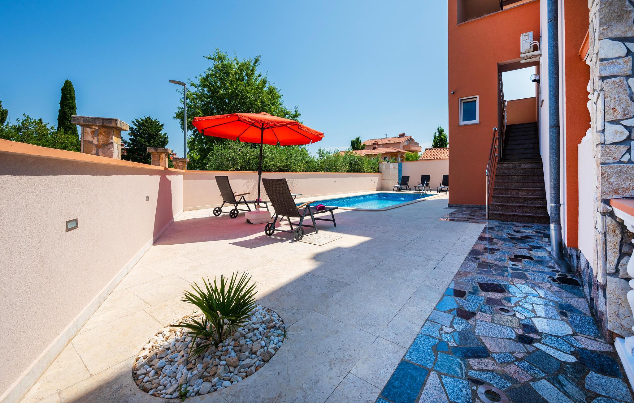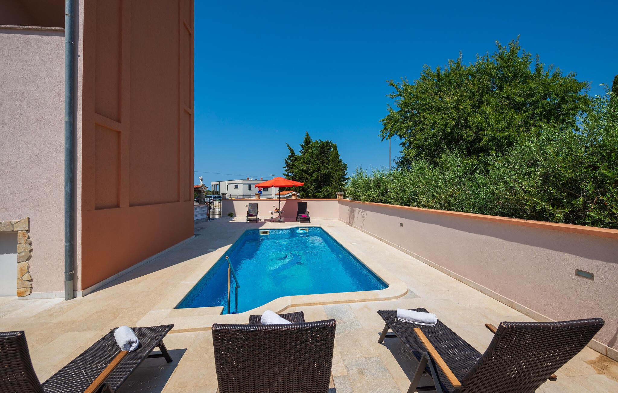 Dieses schöne Ferienhaus liegt in dem kleinen Ort Stinjan, in der Nähe der Stadt Pula aber auch in der Nähe des Städtchens Fazana, das für hervorragende Restaurants mit Fischspezialitäten bekannt ist, die Sie sich nicht entgehen lassen sollten. Das Ferienhaus erstreckt sich über die 1. Etage, wobei das Erdgeschoss und die 2. Etage abgeschlossen sind und den Gästen nicht zur Verfügung stehen. Verbringen Sie unvergessliche Momente neben dem Pool oder auf der Terrasse mit dem Grill und genießen Sie Urlaubsentspannung sowie Ausflüge in die Umgebung.