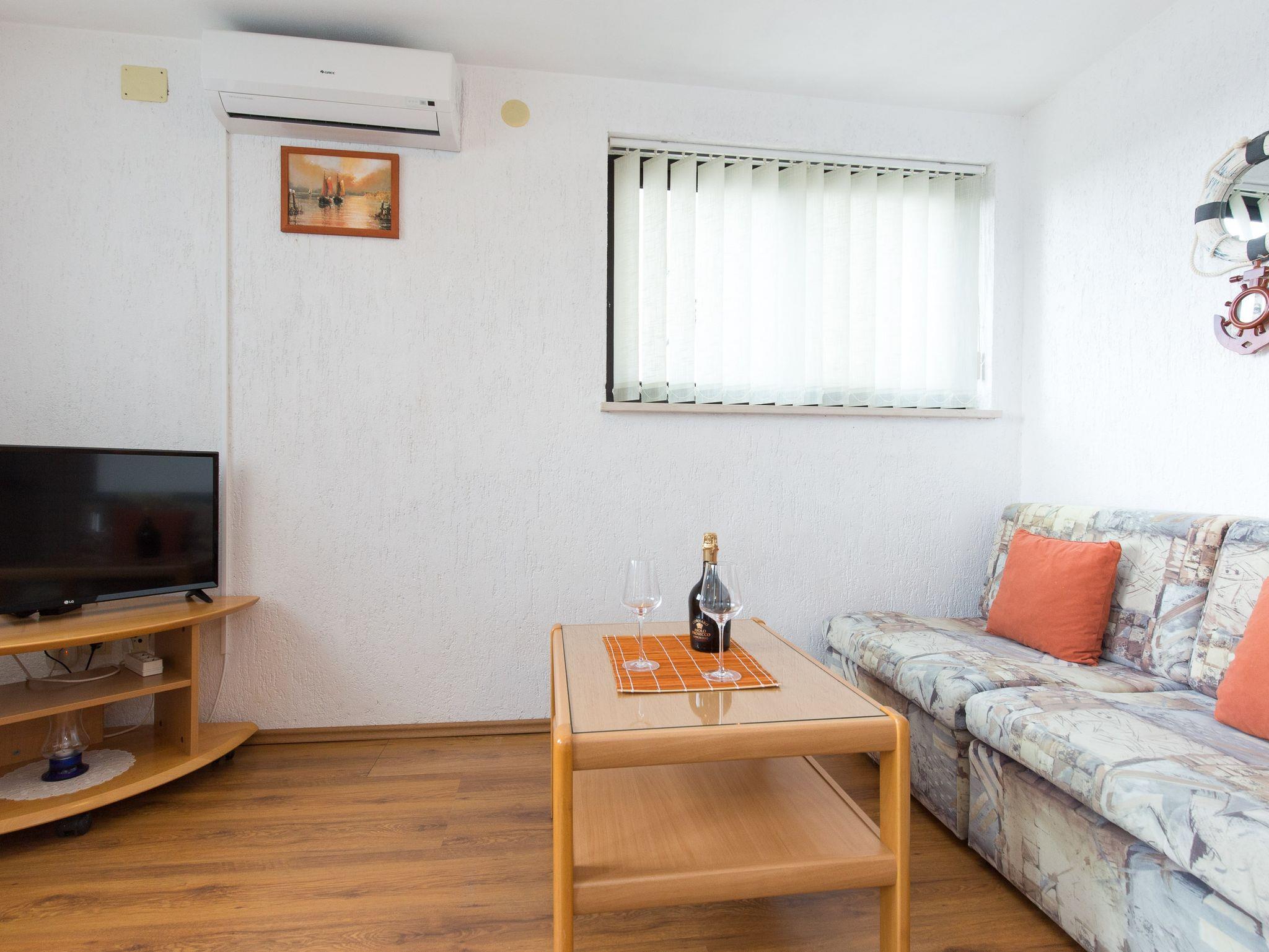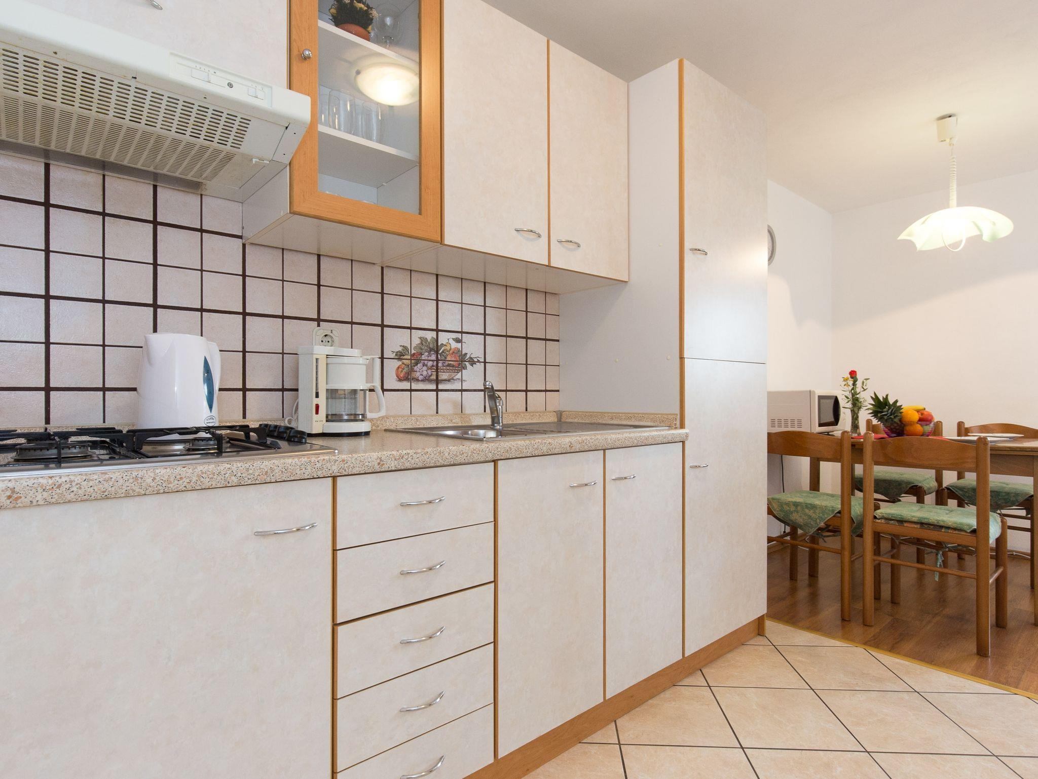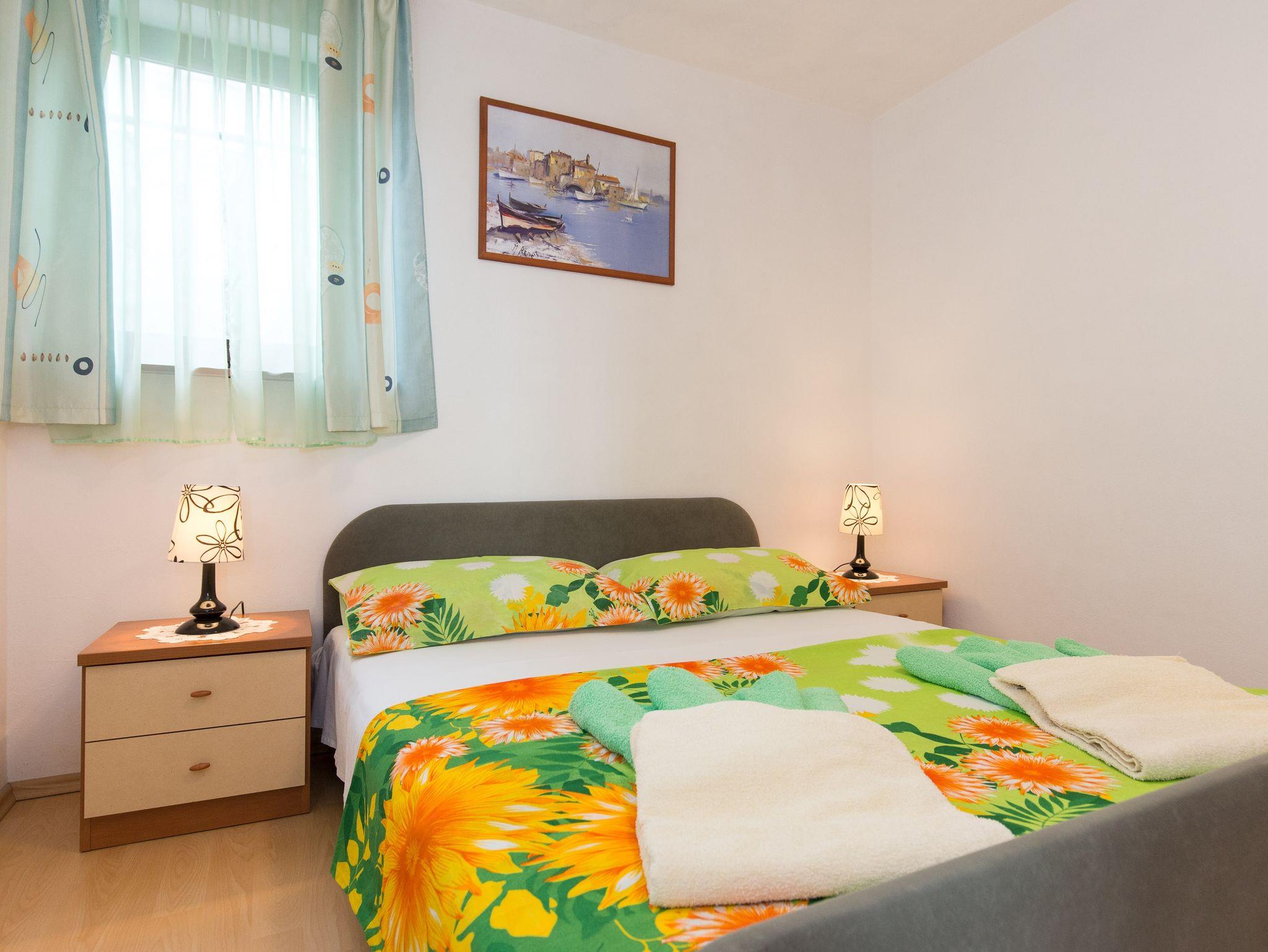 Ferienwohnung bietet Platz für 4 Gäste. Die Betten sind in Schlafzimmern, die es 1 gibt, und in Wohnzimmer, innerhalb einer Gesamtfläche von 33m2, angeordnet. Die Gäste haben eine eigene Terrasse zur Verfügung, auf der sie in warmen Sommernächten genießen können. Das Apartment bietet Meerblick. Es ist erlaubt, Speisen auf dem Gemeinschafts-Grill vorzubereiten. Während ihres Aufenthalts können Gäste das gemeinsam zur Nutzung stehende Schwimmbad benutzen. In der Unterkunftseinheit besteht die Möglichkeit des Mitbringens von Haustieren gegen Aufpreis. IM PREIS INBEGRIFFEN: Kurtaxe, Endreinigung, Klimatisierung, Pool, Parkplatz, Internet, Kinderbett, Bügeleisen, Bügelbrett, Föhn. VERBINDLICHE ZUSÄTZLICHE KOSTEN: Aufzahlung für Kurzaufenthalte (prozentualer Zuschlag pro Nächtigungsanzahl: 30% - 1, 20% - 2, 10% - 3). UNVERBINDLICHE ZUSÄTZLICHE KOSTEN: Zentralheizung (6,00 € pro Nacht), Wäschewaschen (5,00 € Waschen), Haustiere (10,00 € pro Nacht). Die Verfügbarkeit zusätzlicher Dienstleistungen in Ihrem reservierten Termin und die Preise derselben (falls nicht aufgeführt) müssen im Voraus überprüft werden. Zusätzliche Dienstleistungen die in der Zahlungsaufforderung nicht aufgeführt sind werden direkt beim Vermieter bezahlt, angenommen der Gast nutzt auch diese.