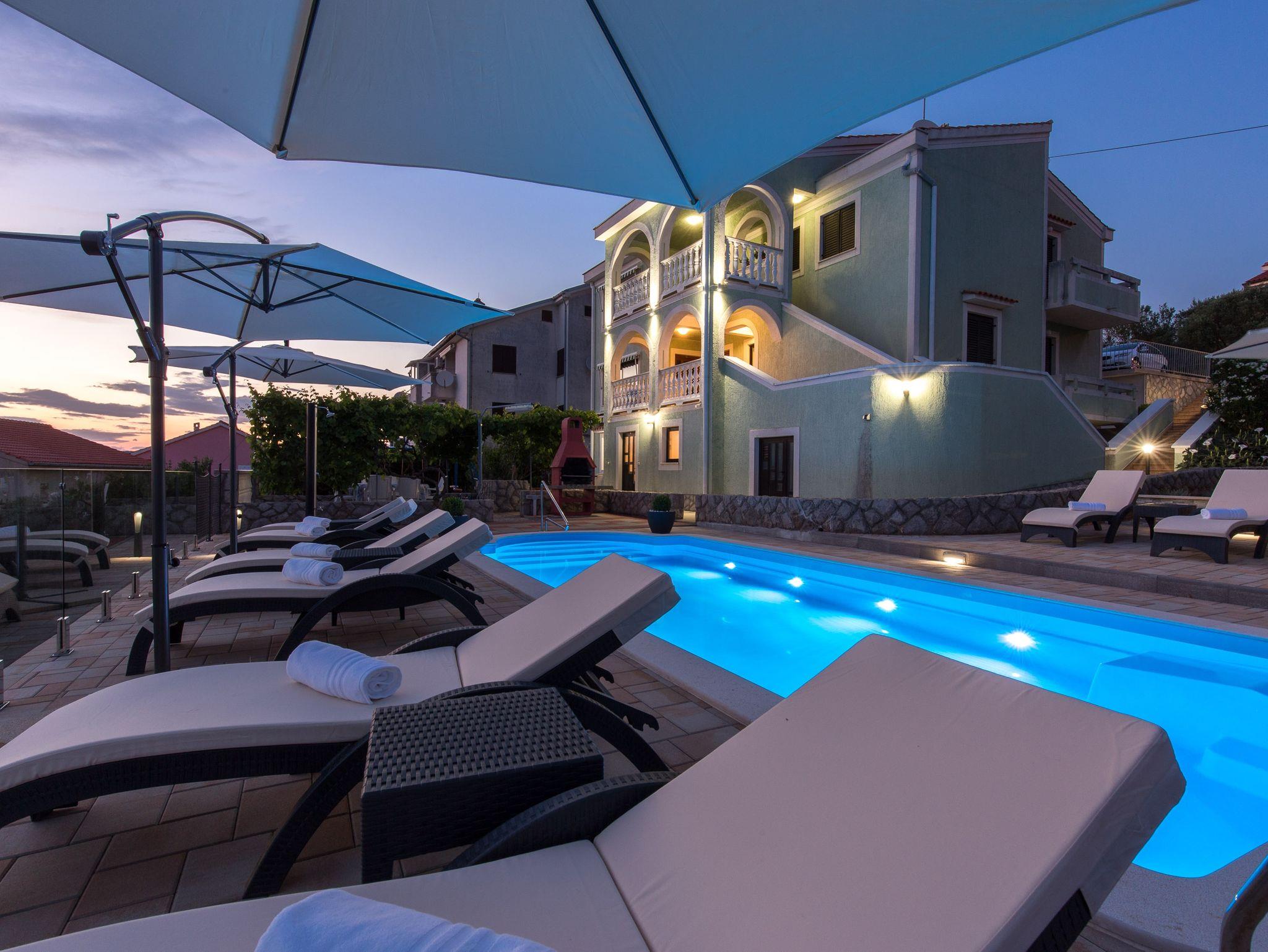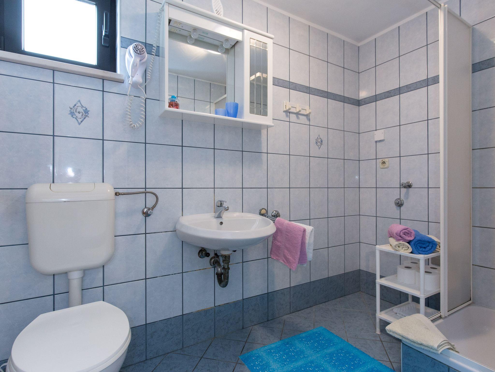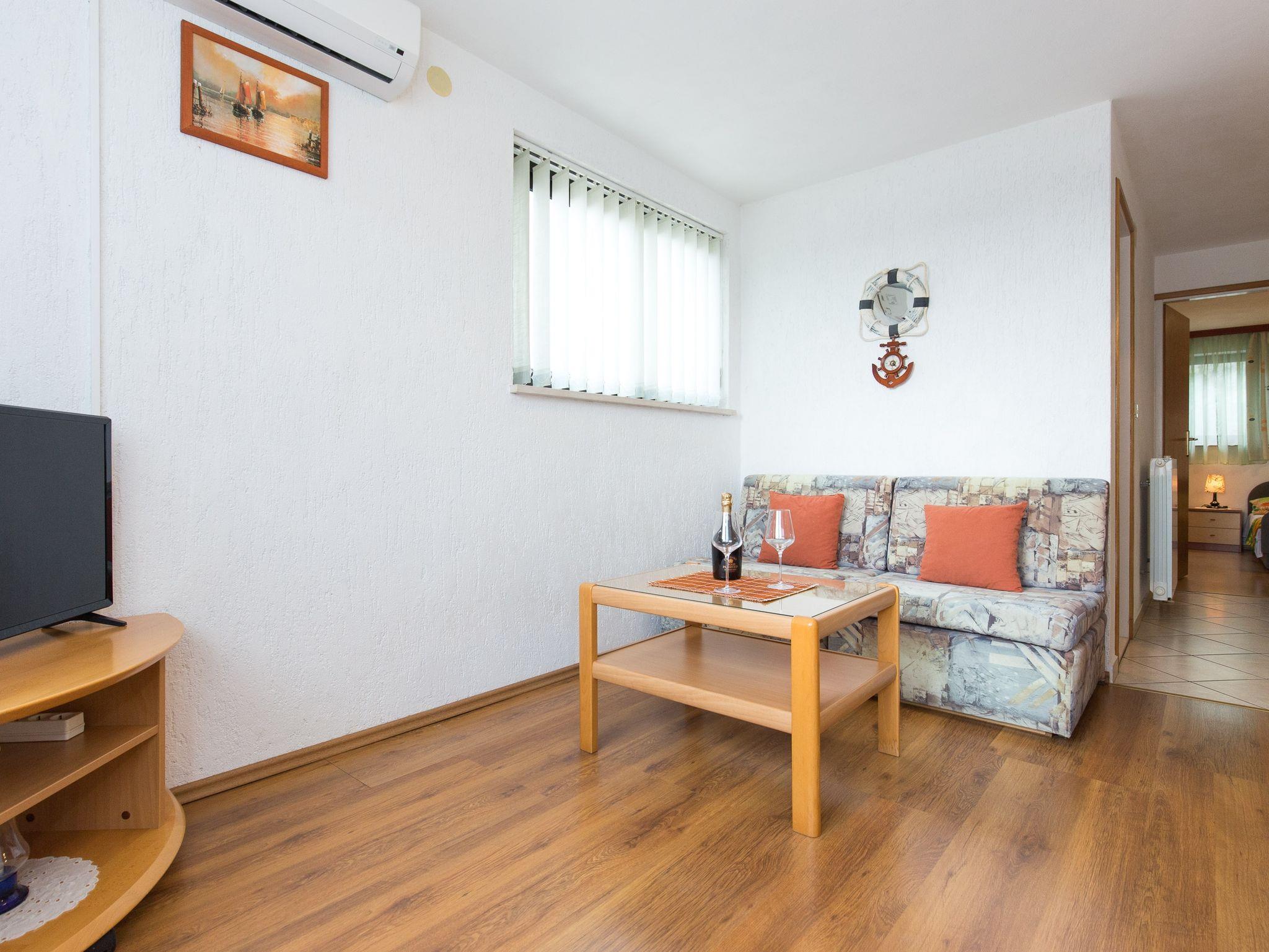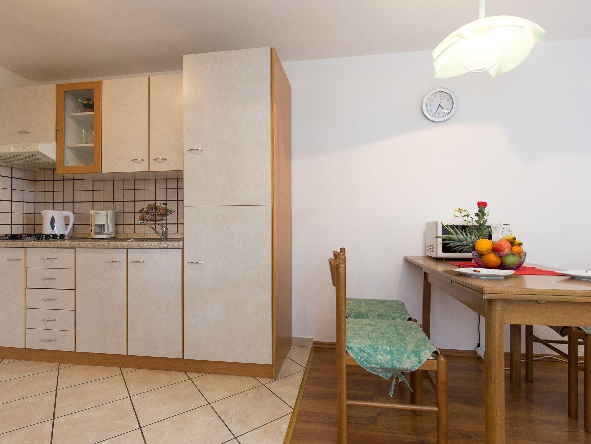Ferienwohnung bietet Platz für 4 Gäste. Die Betten sind in Schlafzimmern, die es 1 gibt, und in Wohnzimmer, innerhalb einer Gesamtfläche von 33m2, angeordnet. Die Gäste haben eine eigene Terrasse zur Verfügung, auf der sie in warmen Sommernächten genießen können. Das Apartment bietet Meerblick. Es ist erlaubt, Speisen auf dem Gemeinschafts-Grill vorzubereiten. Während ihres Aufenthalts können Gäste das gemeinsam zur Nutzung stehende Schwimmbad benutzen. In der Unterkunftseinheit besteht die Möglichkeit des Mitbringens von Haustieren gegen Aufpreis. IM PREIS INBEGRIFFEN: Kurtaxe, Endreinigung, Klimatisierung, Pool, Parkplatz, Internet, Kinderbett, Bügeleisen, Bügelbrett, Föhn. VERBINDLICHE ZUSÄTZLICHE KOSTEN: Aufzahlung für Kurzaufenthalte (prozentualer Zuschlag pro Nächtigungsanzahl: 30% - 1, 20% - 2, 10% - 3). UNVERBINDLICHE ZUSÄTZLICHE KOSTEN: Zentralheizung (6,00 € pro Nacht), Wäschewaschen (5,00 € Waschen), Haustiere (10,00 € pro Nacht). Die Verfügbarkeit zusätzlicher Dienstleistungen in Ihrem reservierten Termin und die Preise derselben (falls nicht aufgeführt) müssen im Voraus überprüft werden. Zusätzliche Dienstleistungen die in der Zahlungsaufforderung nicht aufgeführt sind werden direkt beim Vermieter bezahlt, angenommen der Gast nutzt auch diese.