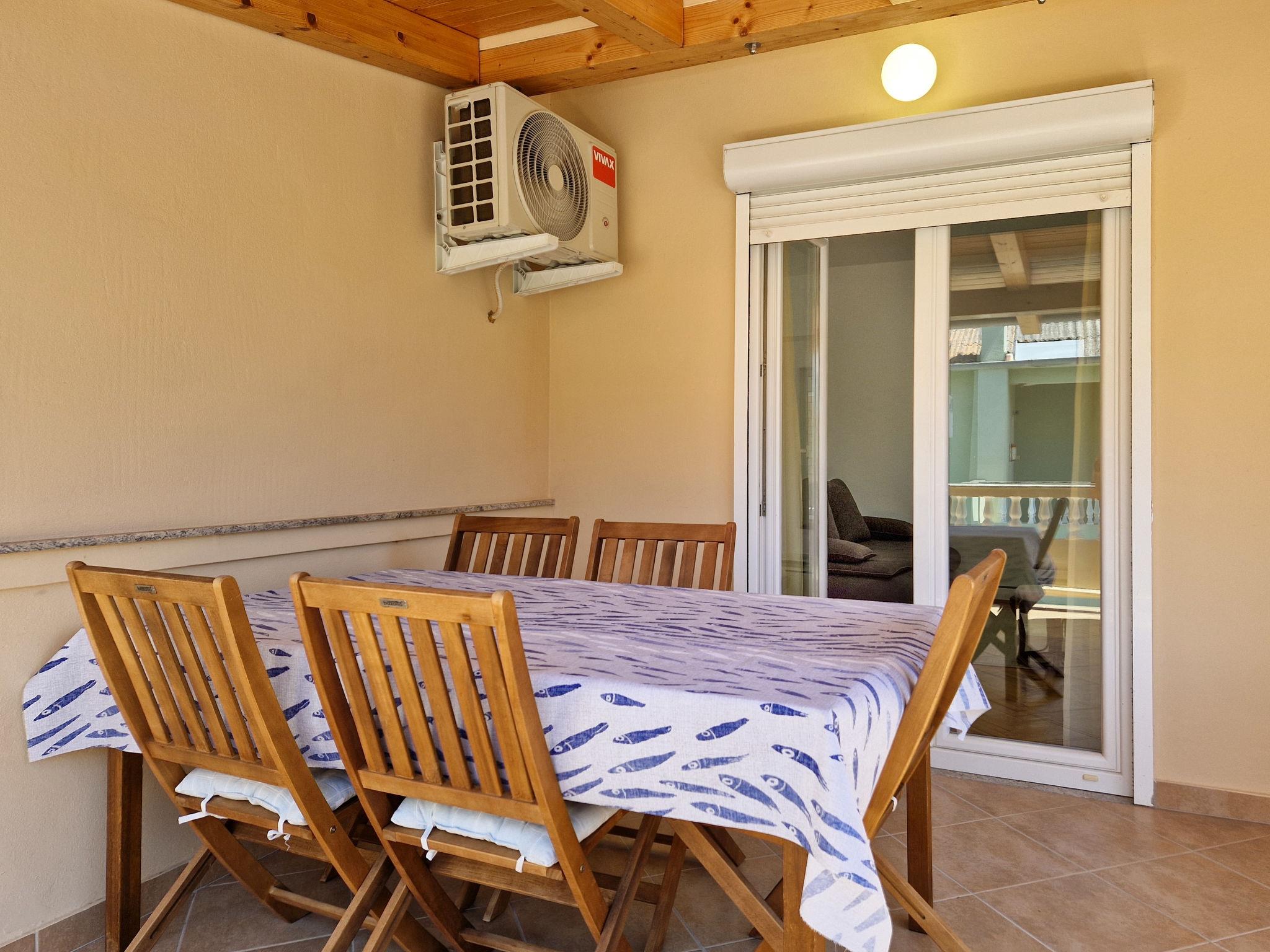 3-Zimmer-Wohnung 60 m2 im 1. Stock. Schön und gemütlich eingerichtet: Wohn-/Esszimmer 25 m2 mit Sat-TV (Flachbildschirm), Klimaanlage. Ausgang zur Terrasse. 1 Zimmer mit 1 Doppelbett (2 x 80 cm, Länge 200 cm). 1 Zimmer mit 2 Betten (80 cm, Länge 200 cm), Dusche/WC. Offene Küche (4 Kochplatten, Backofen, Geschirrspüler, elektrische Kaffeemaschine). Dusche/WC. Klimaanlage. Terrasse 14 m2, überdacht, Terrasse 18 m2, überdacht. Terrassenmöbel. Zur Verfügung: Internet (WLAN, gratis). Bitte beachten: Maximal 1 Haustier/Hund erlaubt. Eigener Eingang.