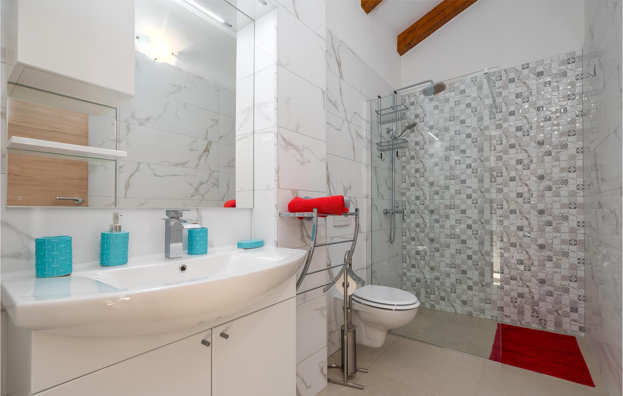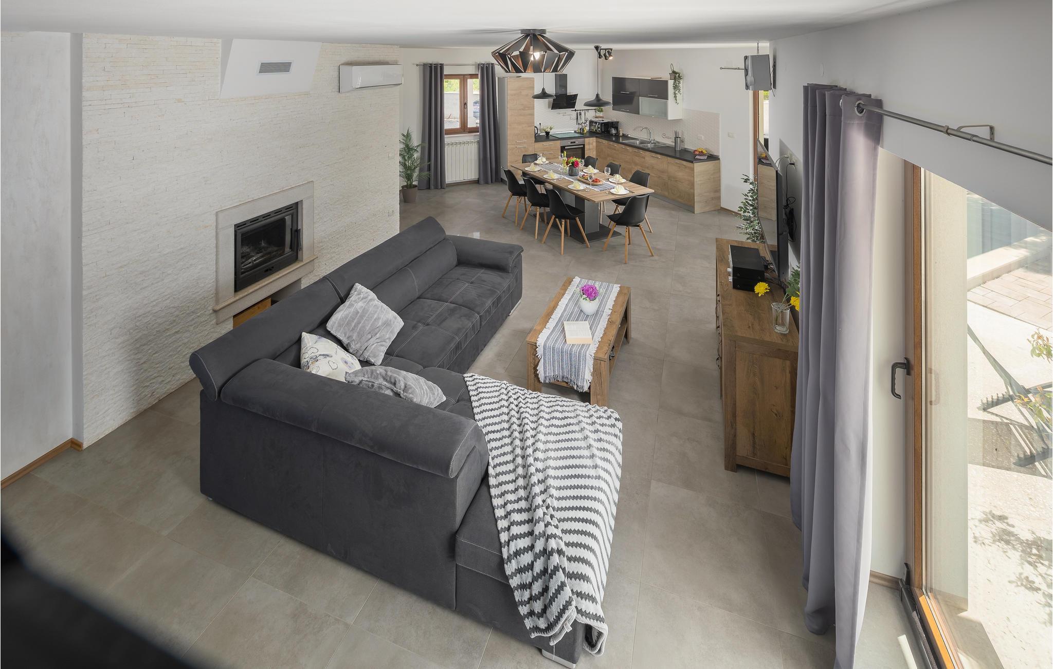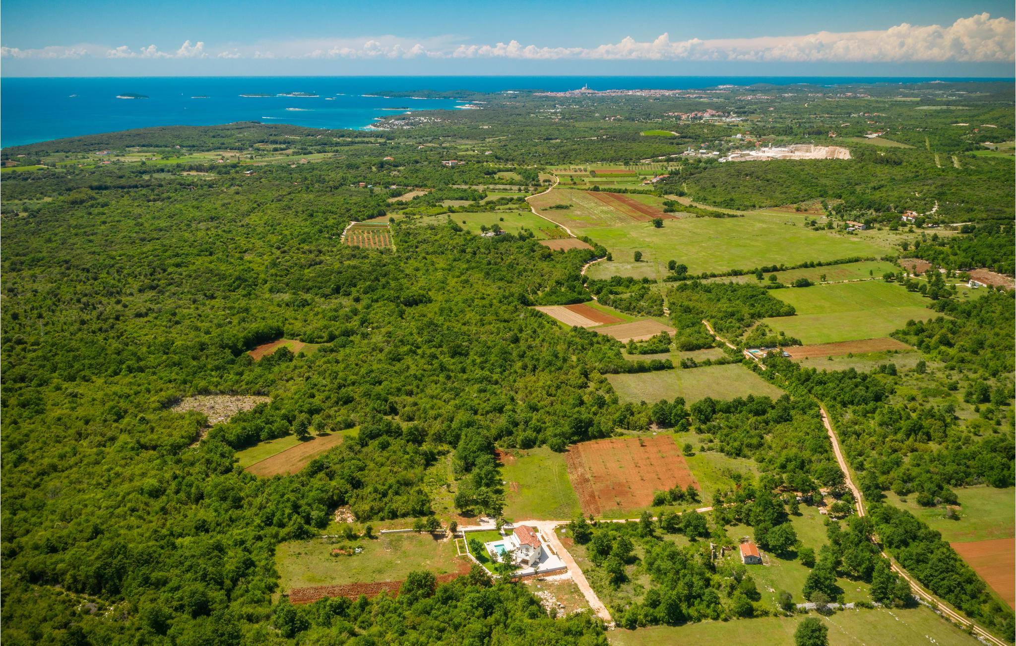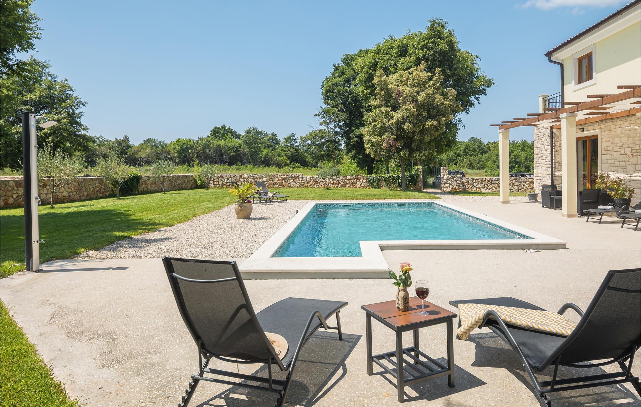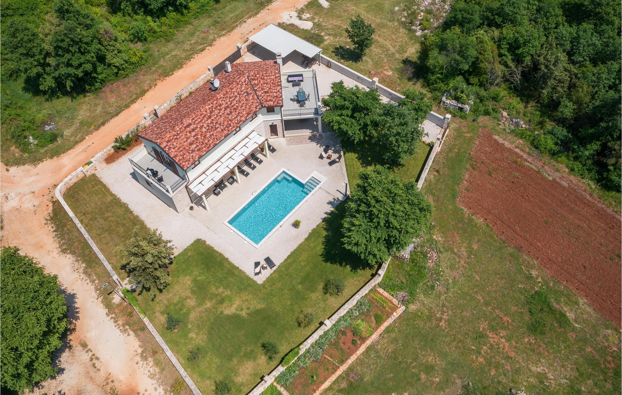 In ruhiger Lage bietet dieses wunderbare Ferienhaus mit Pool viel Privatsphäre für einen erholsamen Urlaub mit Familie und Freunden. Das geräumige Ferienhaus bietet seinen Gästen viel Komfort und besteht aus vier Schlafzimmern mit en-suite Badezimmern, Wohnzimmer, Küche und Essbereich sowie direktem Zugang zur Terrasse und Poolbereich. Die Terrasse ist überdacht und hat eine Außenküche, auf der Sie auch im Freien köstliche Mahlzeiten zubereiten können. Im Obergeschoss sind zwei weitere Terrassen mit Ausblick auf das umliegende Grün. Die ersten Strände erreichen Sie in etwa zehn Minuten Fahrt mit dem Auto. Besuchen Sie die bezaubernde Stadt Rovinj mit Ihrer Kirche der Hl. Euphemia, aber auch die Kleinstadt Bale strahlt einen besonderen Charme aus und ist ebenfalls einen Besuch wert. Auf dem Grundstück befindet sich ein großer, mit Salz behandelter Pool, in dem Sie schwimmen und entspannen können.