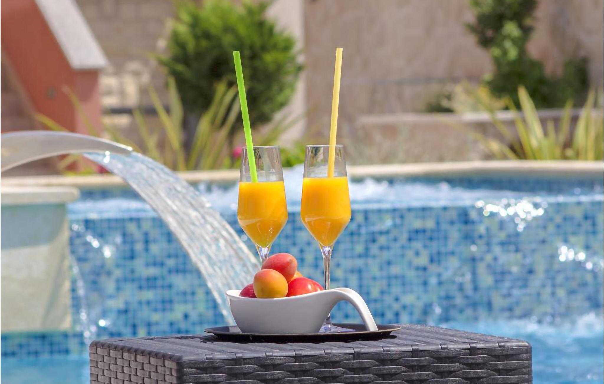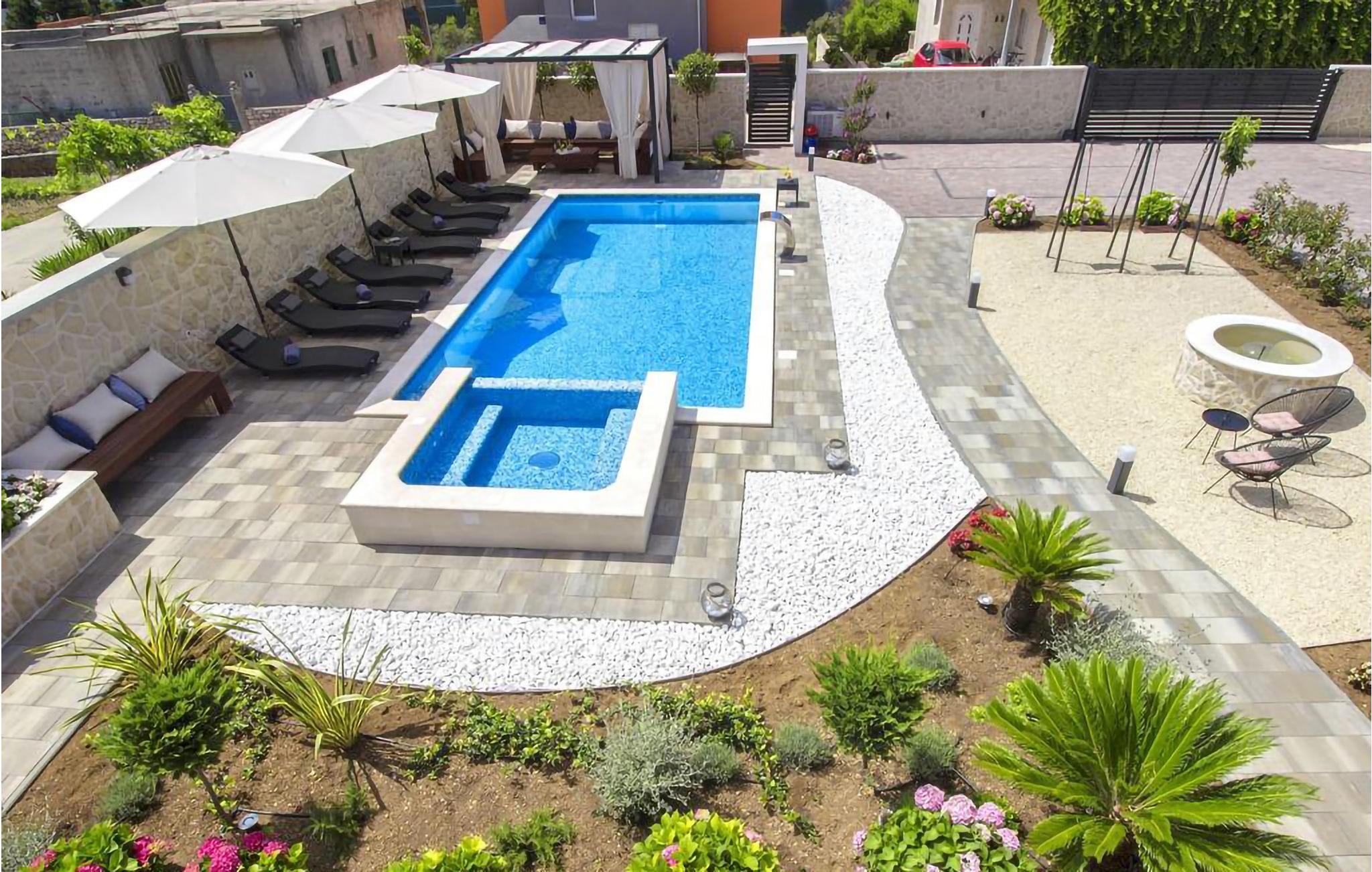 Das Grundstück ist groß und vor neugierigen Blicken geschützt. Erfrischen Sie sich im Gemeinschaftspool, nehmen Sie ein Sonnenbad auf bequemen Liegen und entspannen Sie im Whirlpool, den Sie mit den anderen Mietern teilen.