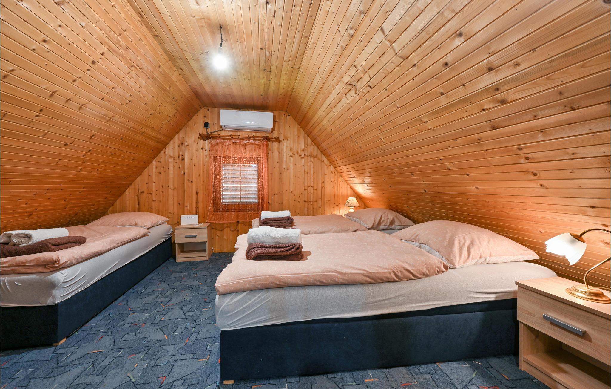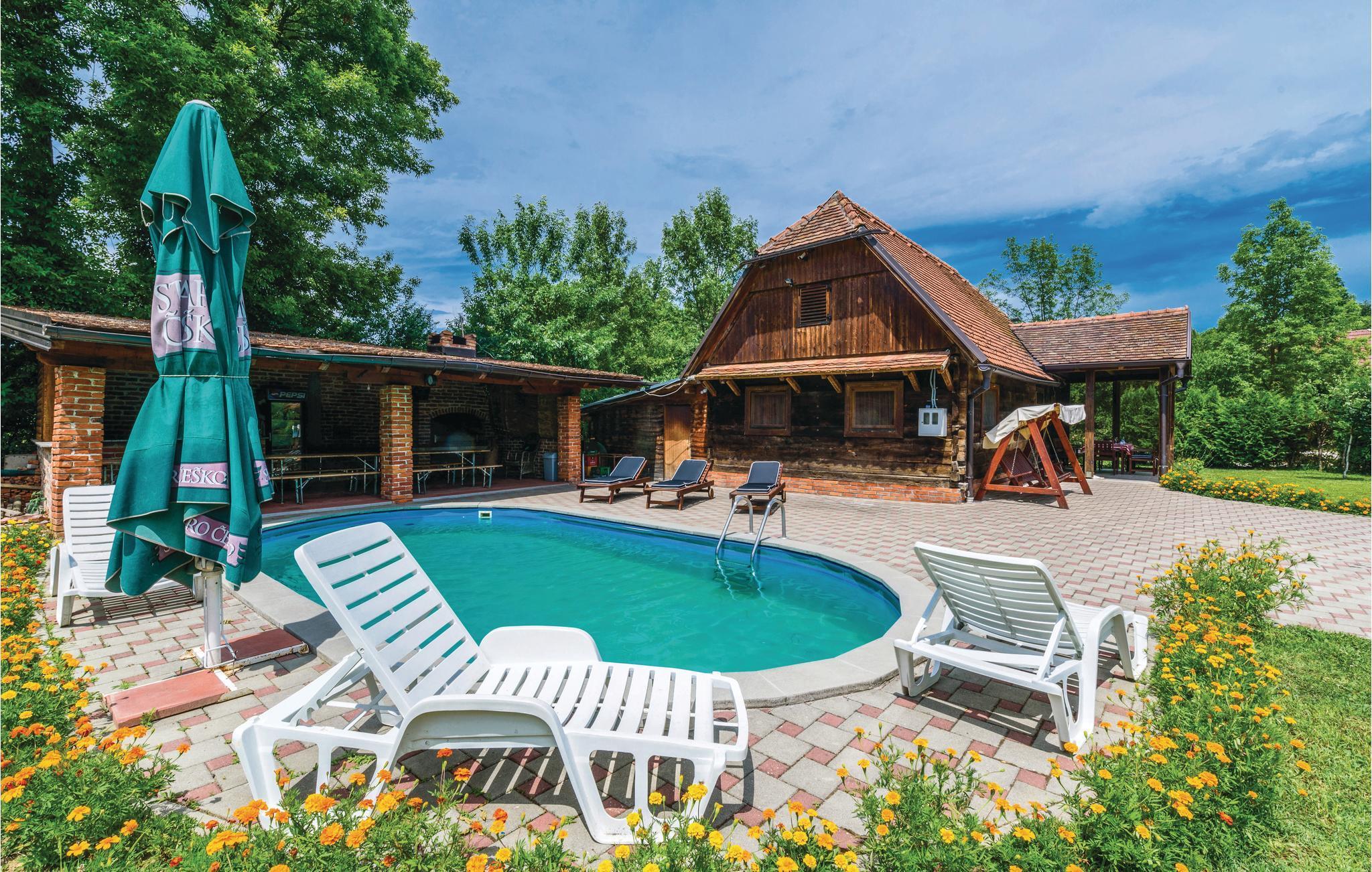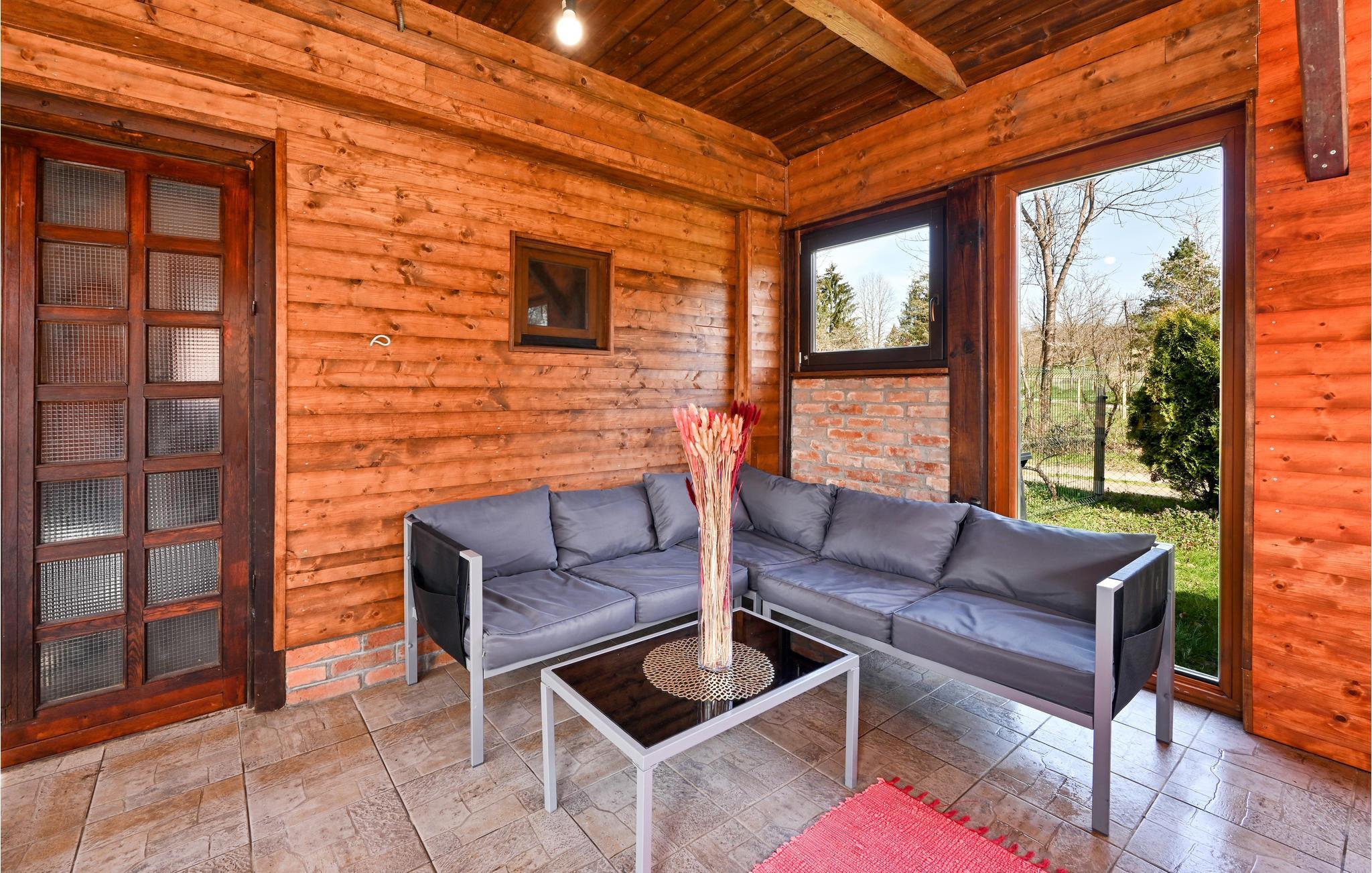 Dieses rustikale Ferienhaus mit Pool befindet sich in der Region Turopolje, in Zentralkroatien und eignet sich ideal für diejenigen, die dem Lärm und Stress der Stadt entfliehen möchten um in ländlicher Umgebung zu entspannen. Auf dem Grundstück dominiert der Poolbereich mit Liegestühlen, neben dem eine überdachte Außenküche mit Sitzgarnitur und gemauertem Grill stehen. Der gepflegte Garten bietet viel Platz für das unbeschwerte Spiel Ihrer Kinder. Der Innenbereich besteht im Erdgeschoss aus einer Wohnküche mit einer steilen Treppe zum Dachgeschoss (Dachschräge auf ca. 40 cm). Im Dachgeschoss erwarten Sie zwei Schlafzimmer mit schöner Aussicht auf die Landschaft. Genießen Sie Ihren Morgenkaffe auf der überdachten Terrasse vor dem Haus und spazieren Sie zum ca. 50 m entfernt gelegenen Fluss Kupa, in dem Sie baden oder angeln können. Empfehlenswert ist ein Besuch der Städte Zagreb und Sisak (1 h im Auto). In der bietet der Naturpark Lonjsko als Reservat vielen Vögeln Lebensraum. Die letzten drei Kilometer zum Ferienhaus sind nicht asphaltiert.