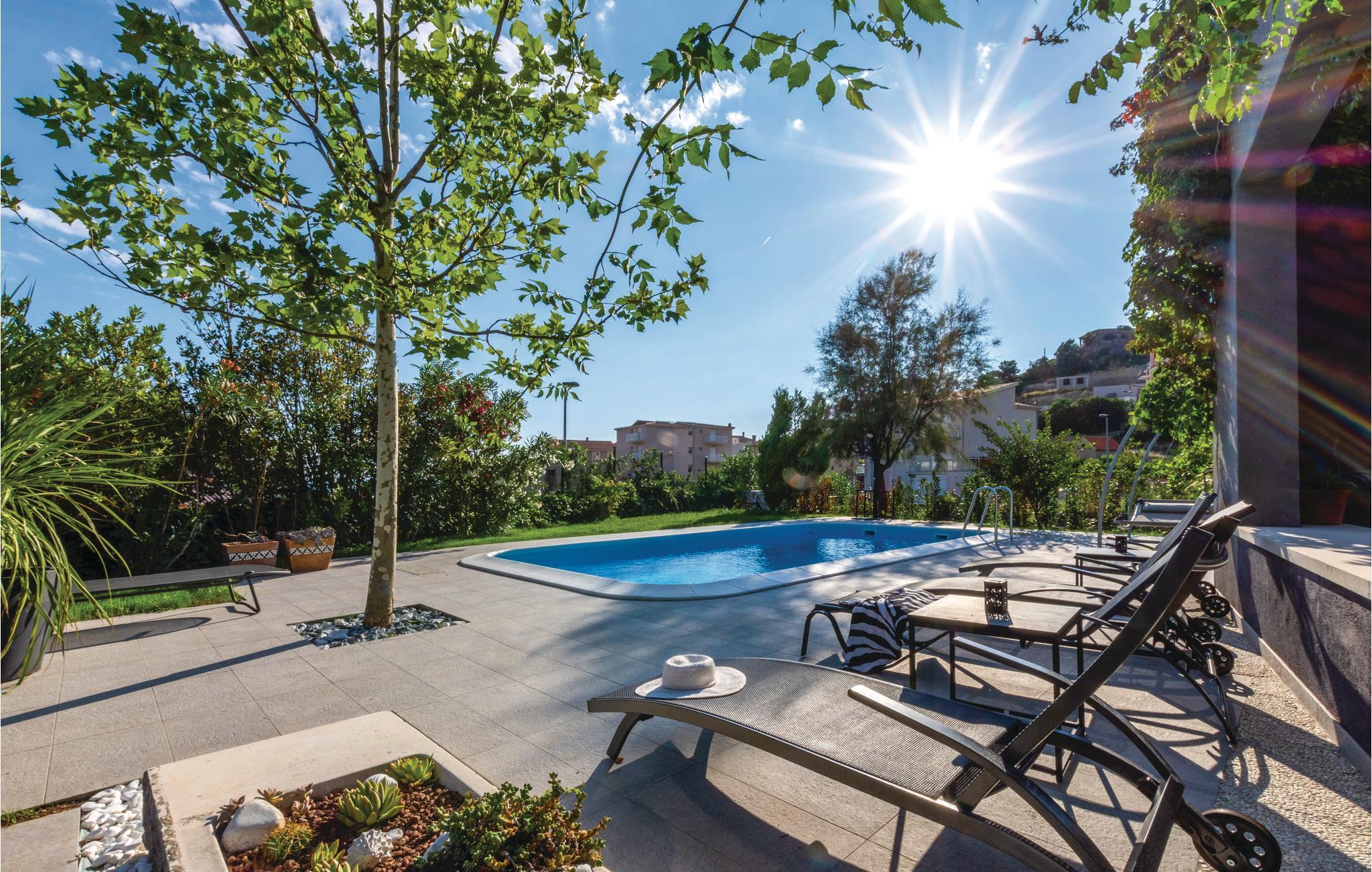 Dieses sorgfältig eingerichtete Haus mit beheiztem Pool befindet sich nur wenige Gehminuten vom Strand entfernt in einer ruhigen Umgebung in Podstrana. Hier finden Sie die ideale Urlaubsunterkunft; das schöne Innere ist geräumig und komfortabel, ebenso wie der Garten mit Pool mit Sonnenliege, viel Grün, schönen Terrassen mit bequemen Möbeln und einem Grill.