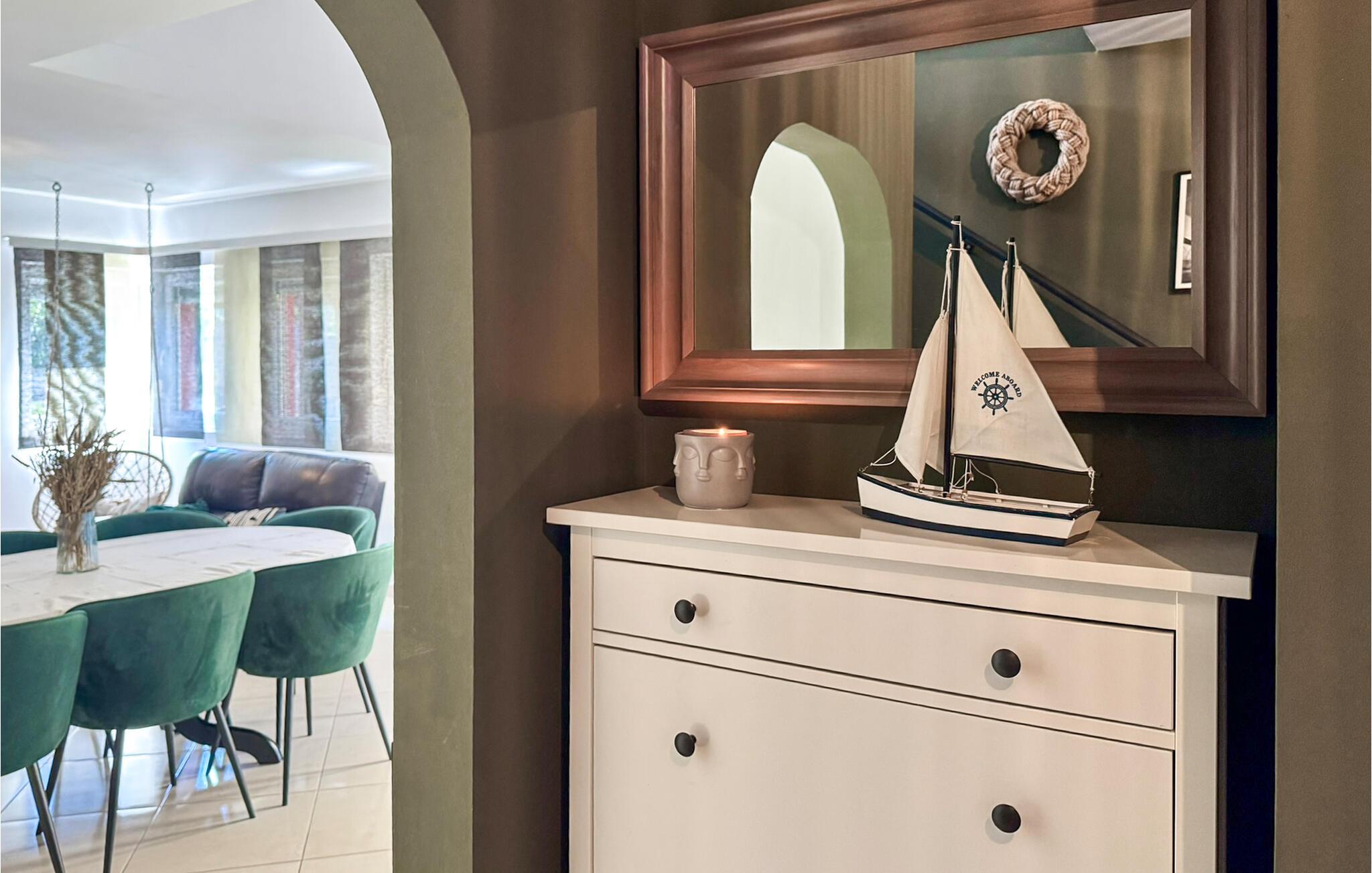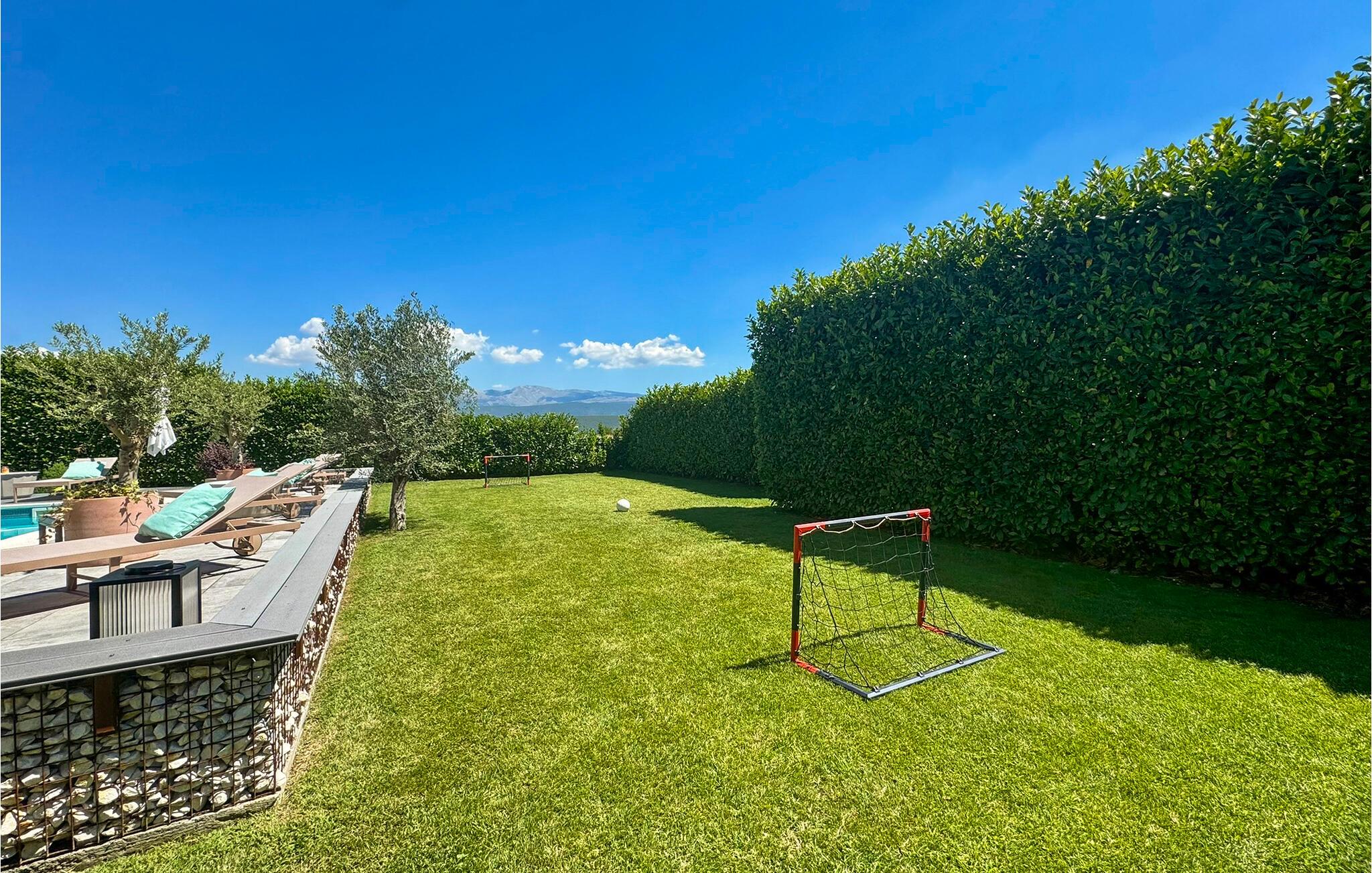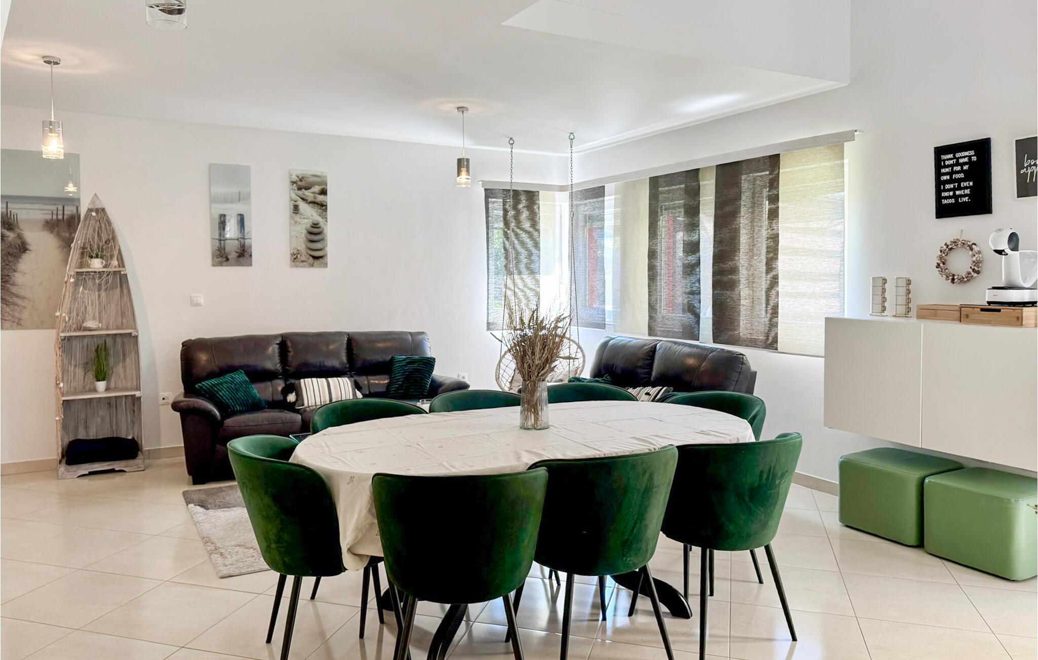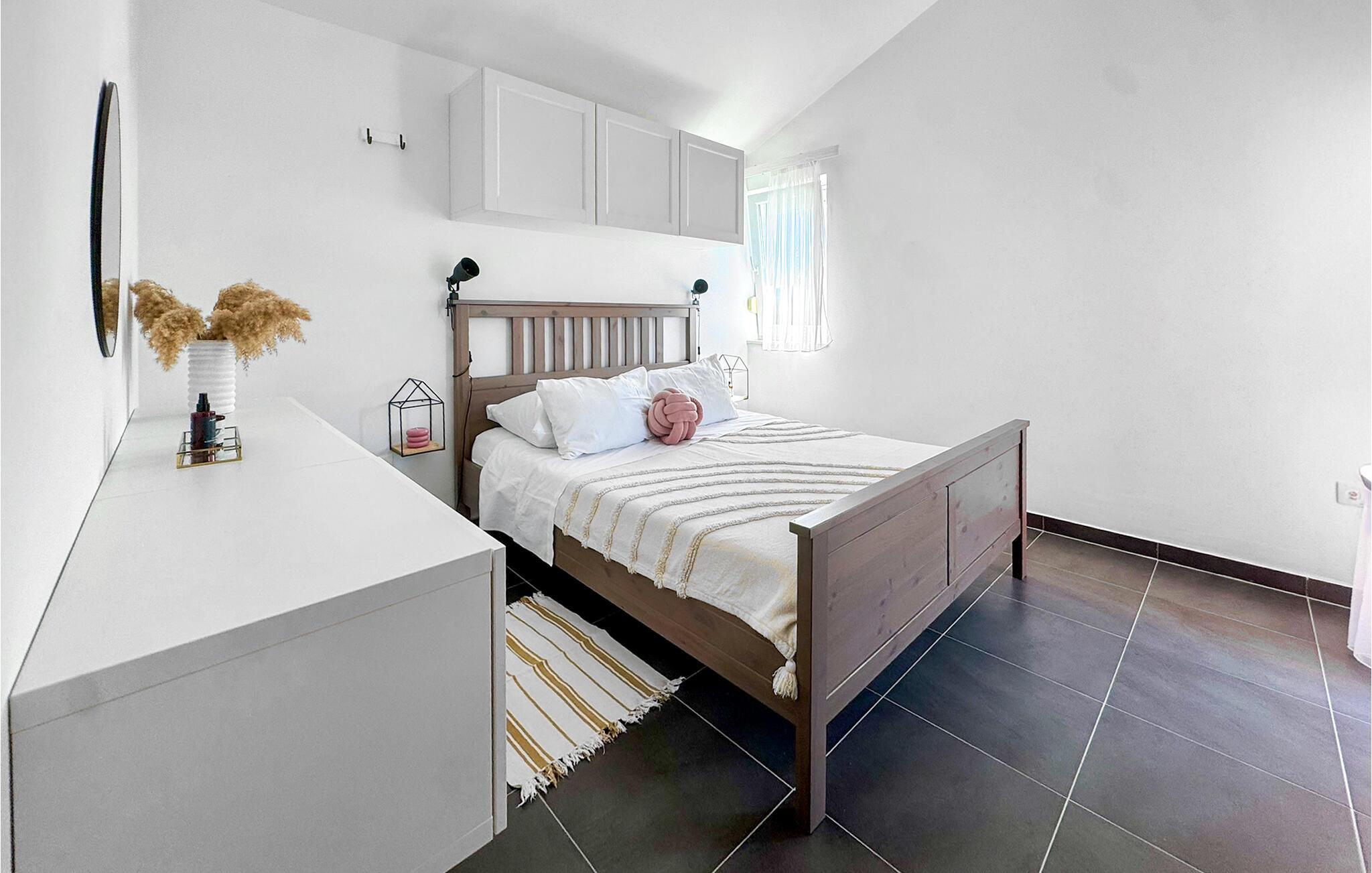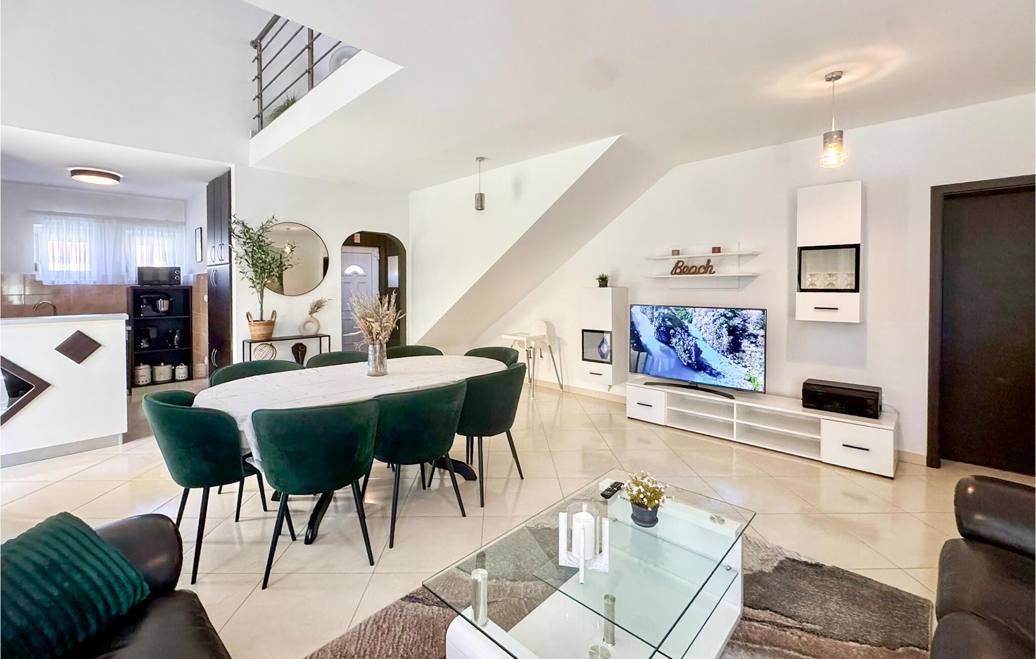 Dieses schöne und komfortable Ferienhaus mit Pool befindet sich unweit des Flusses Cetina. Es wurde modern und familienfreundlich eingerichtet, es passt gut für einen Sommerurlaub. Innentreppen verbinden die Etagen, die niedrigste Deckenhöhe im Dachgeschoss beträgt 50 cm. Die Terrasse geht in den Rasen über, dort liegt ein großer Pool mit Massagedüsen. Daneben findet man auch eine Sommerküche mit Grill, auf welchem Sie leckere Speisen zubereiten können. Im Raum mit der Waschmaschine steht auch eine Dusche und ein Waschbecken. Nur ca. 300 m vom Haus entfernt ist der Fluss Cetina mit Bademöglichkeit. Ins Zentrum des kleinen dalmatinischen Ortes Trilj, wo immer etwas passiert, gelangen Sie in 10 Minuten zu Fuß.