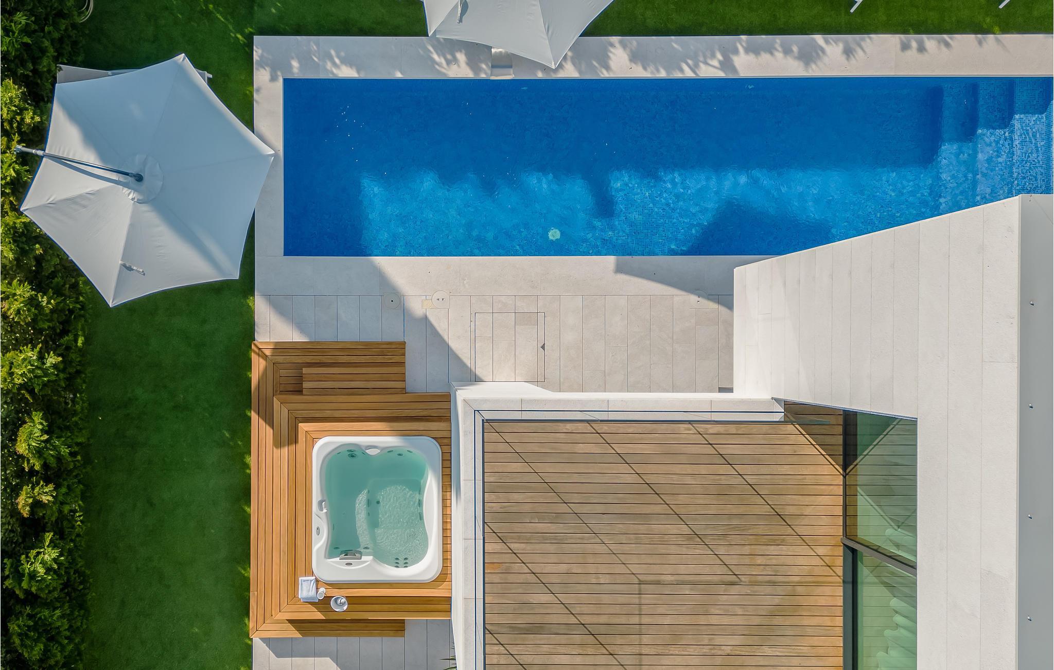 Von der oberen Terrasse können Sie beim Weintrinken am Abend auf das Meer blicken und wunderschöne Sonnenuntergänge bewundern. Im Garten und der Terrasse können Sie sich entweder im Whirlpool entspannen oder mit Ihren Kindern im beheizten Pool baden. Kommen Sie zu Ihren Mahlzeiten auf der Terrasse zusammen und berichten von Ihren Erlebnissen des Tages.