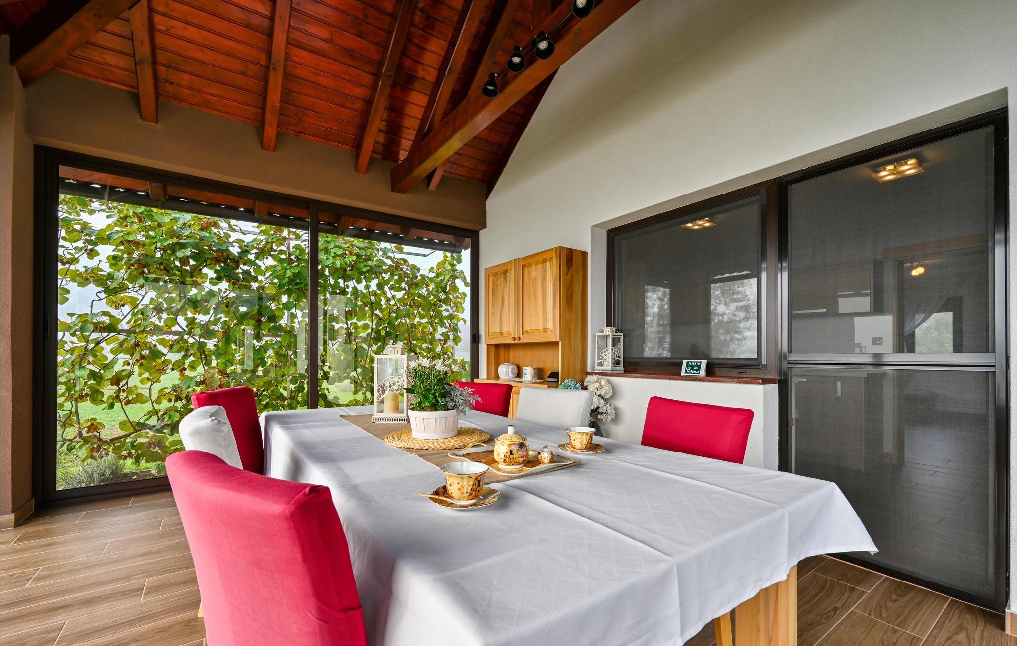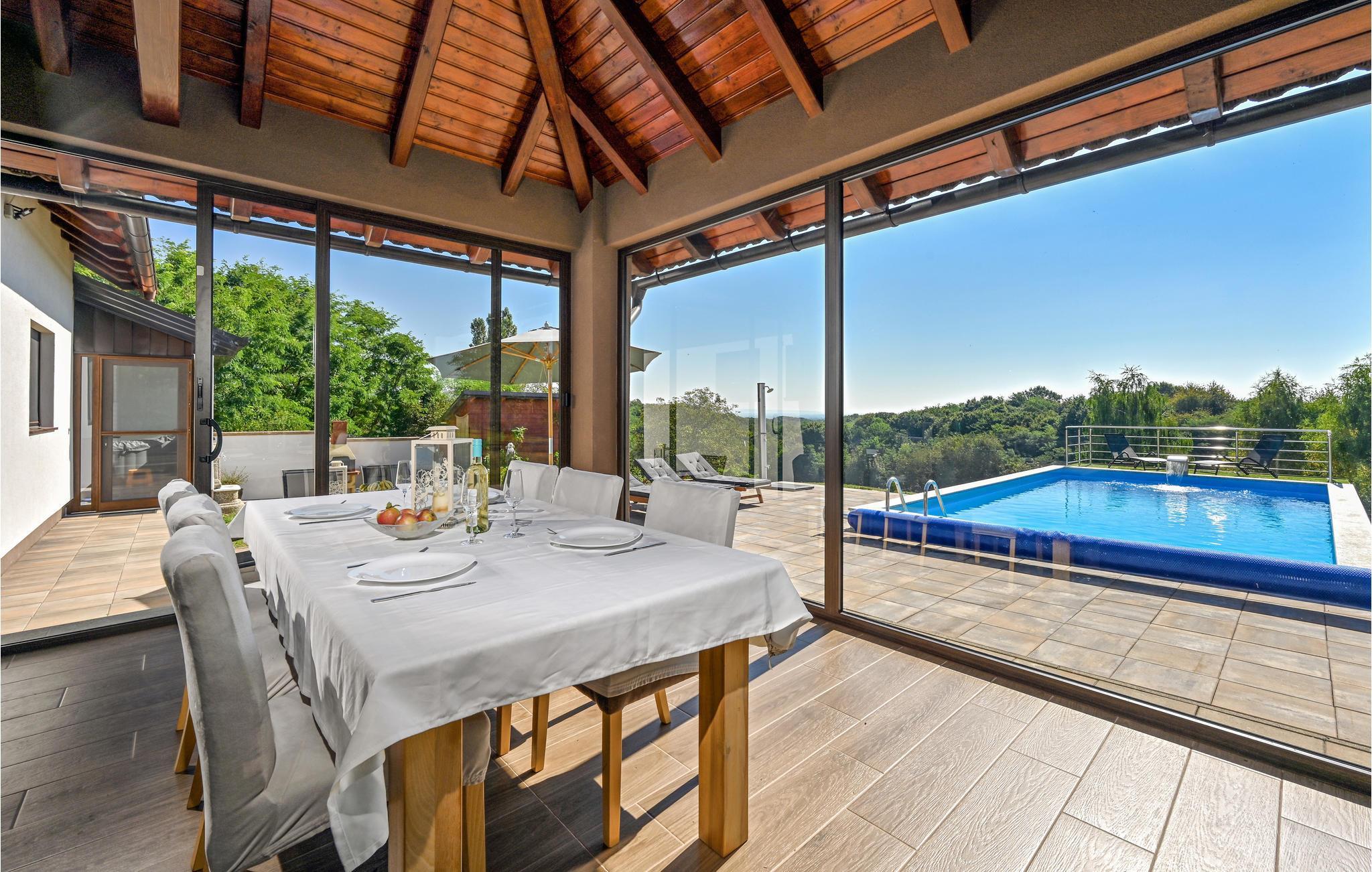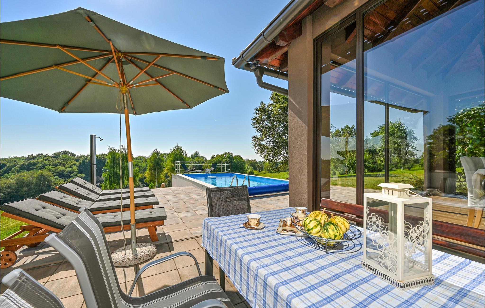 Unweit der nördlichen kroatischen-slowenischen Grenze empfängt Sie dieses geräumige Ferienhaus, dass Ihnen und Ihren Liebsten ein gemütliches zuhause bietet. Zu jeder Jahreszeit können Sie hier einen unbeschwerten Urlaub verbringen, denn der Wohnraum lädt zum Beisammensein ein und Ihre Speisen können Sie im Wintergarten mit Blick in den Garten und auf die Landschaft einnehmen. Sollte es etwas kühler sein, können Sie ein wärmendes Bad im innenliegenden Whirlpool nehmen und im Sommer können Sie Badespaß im Swimmingpool genießen.