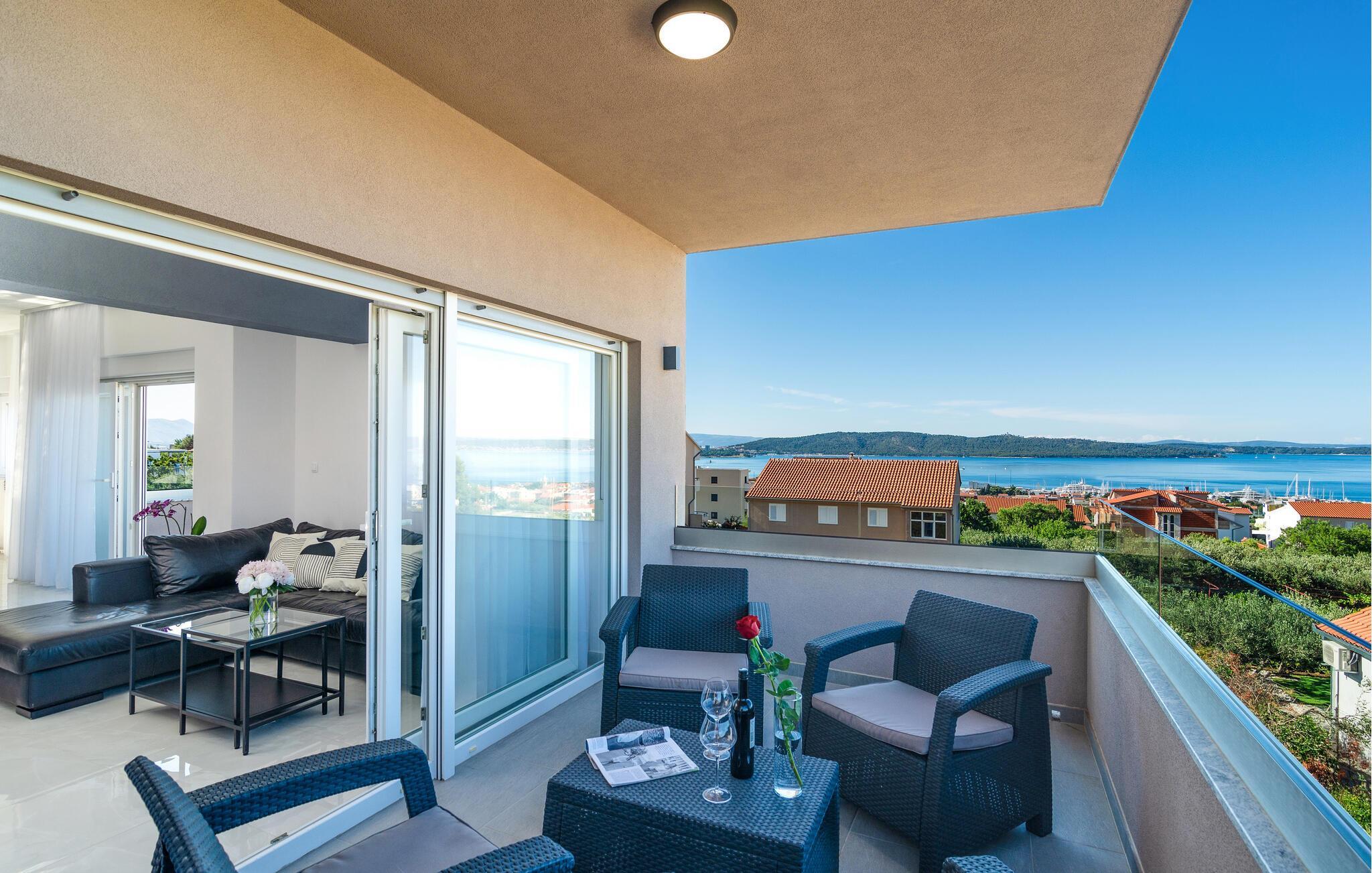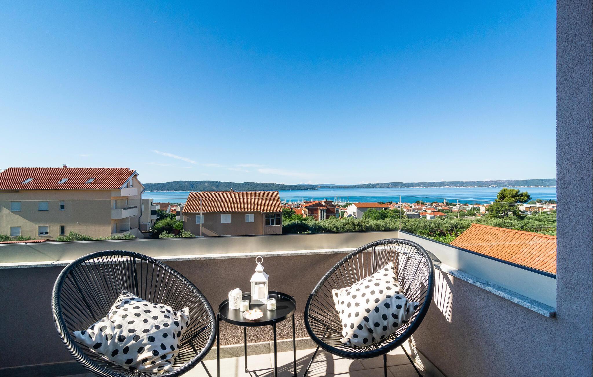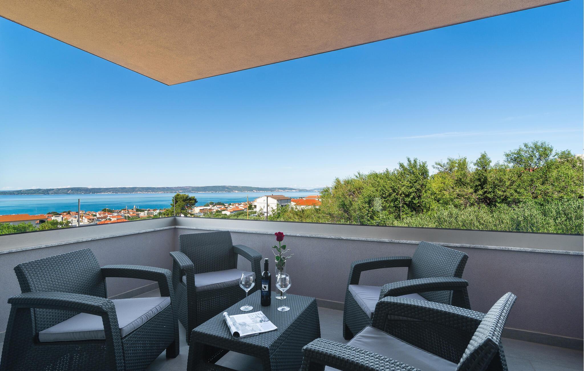 Entspannen Sie sich auf den Balkonen mit dem bezaubernden Sonnenuntergang und dem Blick auf den Tanz der Segelboote. Es bietet einen faszinierenden Panoramablick auf die Bucht von Kastelan, die Städte Split, Trogir und Solin, Inseln, Küsten und versteckte Buchten, die Ihren Aufenthalt überraschen und bereichern.