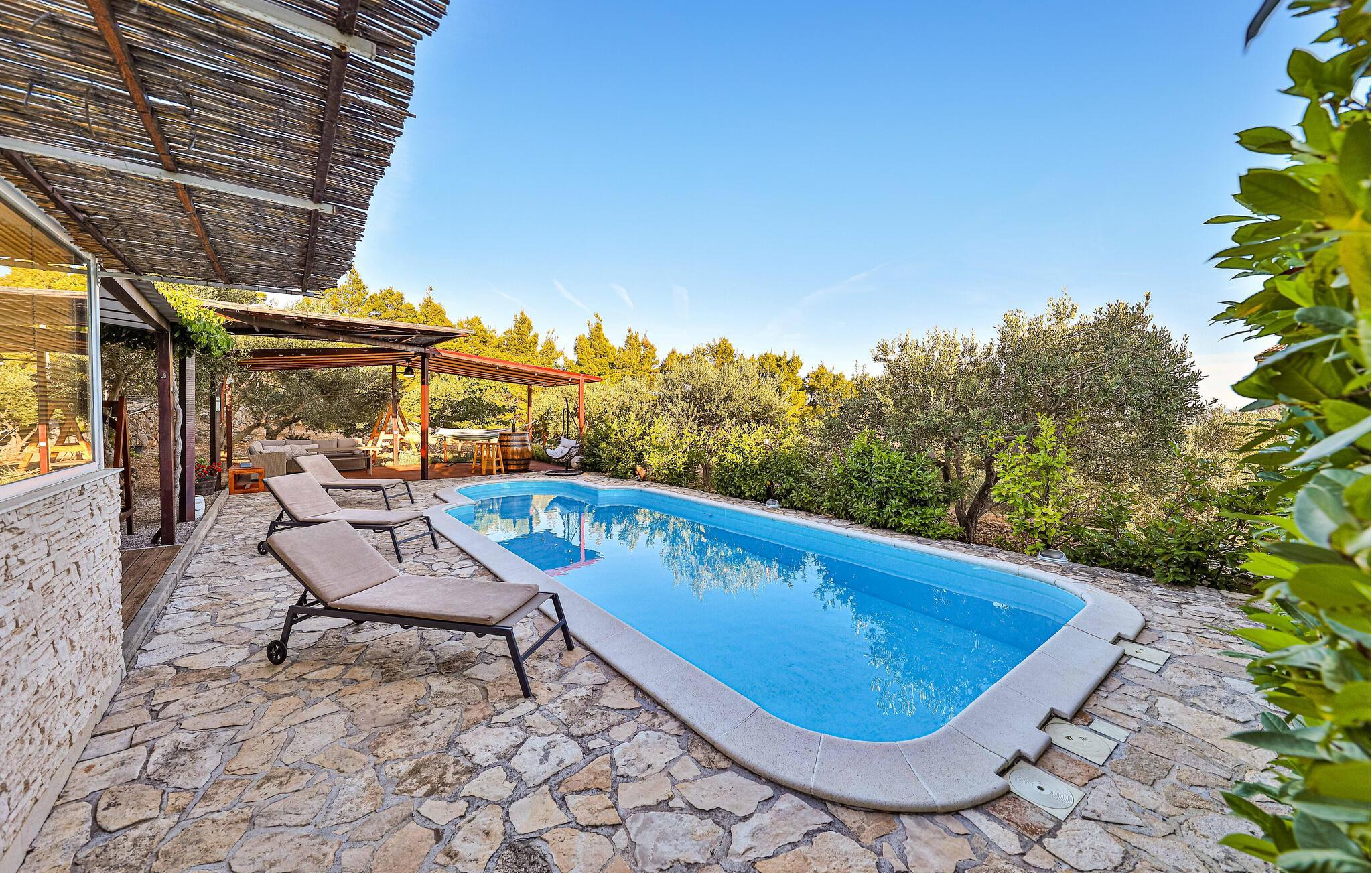 Das Ferienhaus liegt auf einem Grundstück, etwa 500 m von der Hauptstraße entfernt. Sie sind vom Grün der Natur und von Olivenbäumen umgeben. Von der Terrasse am Swimmingpool haben Sie teilweise Blick auf das Meer. Dieser Bungalow besteht aus einem Schlafzimmer mit Doppelbett und einem Einzelbett, Bad, sowie einer Wohnküche, mit noch einer Schlafmöglichkeit. Auf der rechten Seite des Hauses, gleich an der Terrasse am Pool, befindet sich der Grill mit Holztisch und Bänken, für gesellige Momente. Das Haus liegt an einem guten Ausgangspunkt, da der Flughafen, Marina und der historische Altstadtkern von Trogir, Salona und Split in der Nähe liegen.
