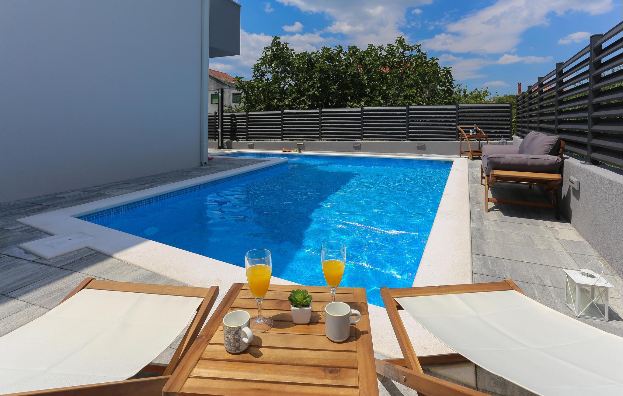Erholen Sie sich in dieser stilvollen Ferienwohnung mit Pool und Meerblick.