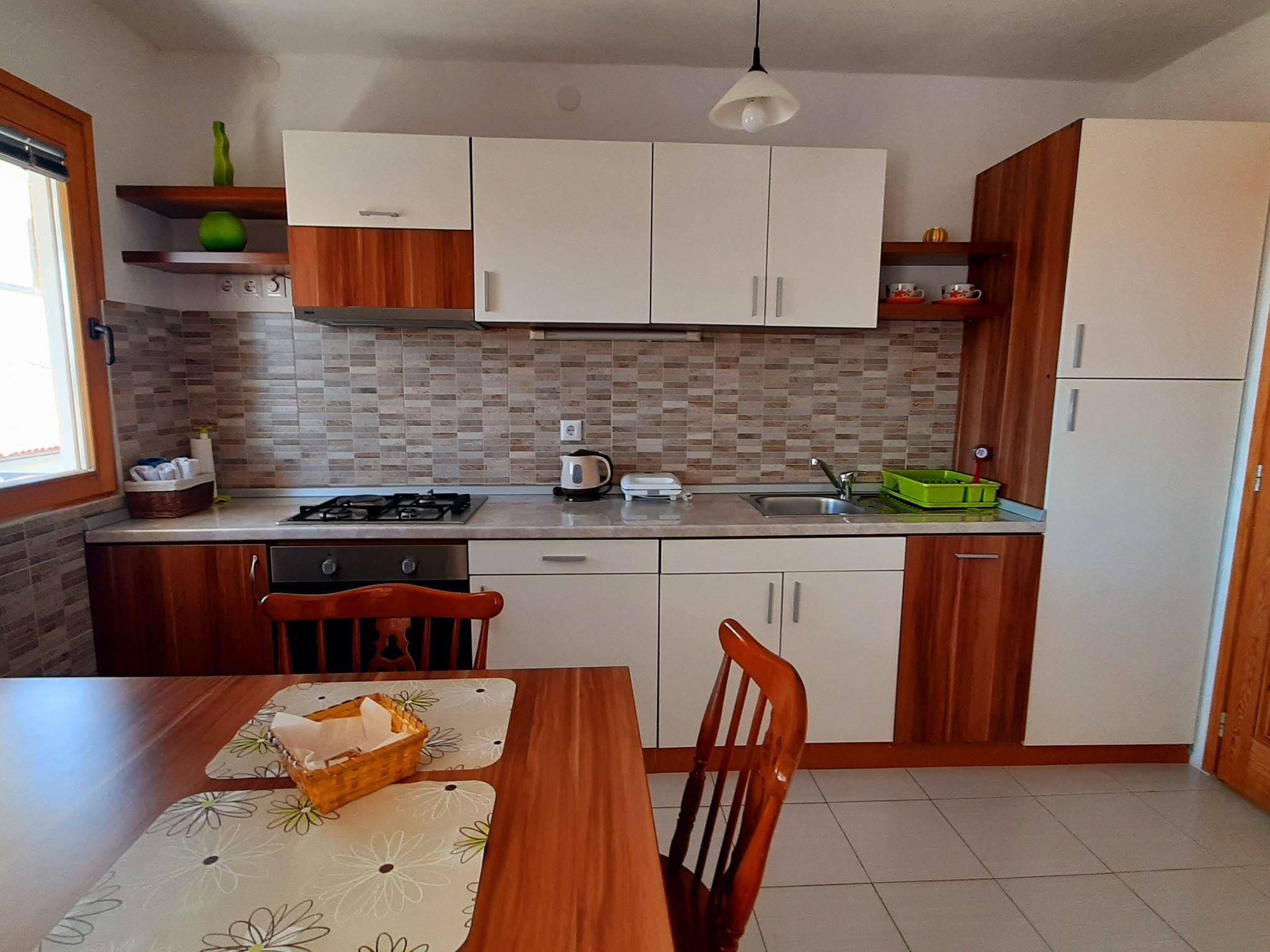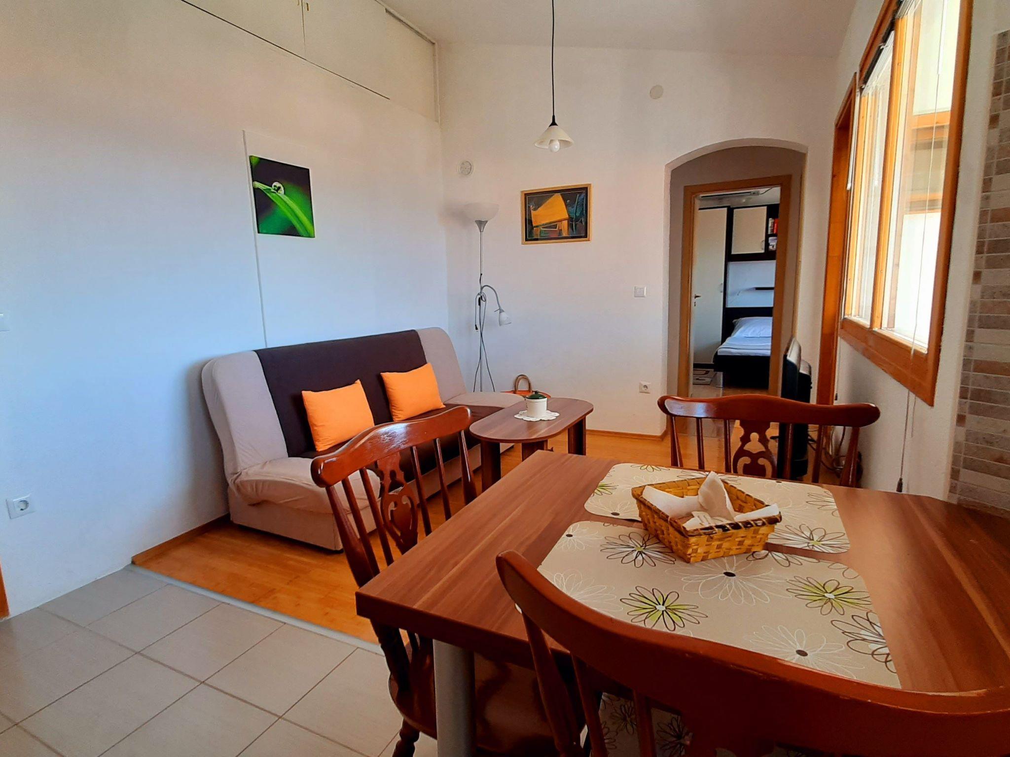 "Apartmani Mlakic" besteht aus zwei Mietwohnungen mit Parkplatz neben dem Haus und einem Außenbereich für Gäste mit einem separaten Grill, Tisch und Stühlen im Schatten eines Feigenbaums.