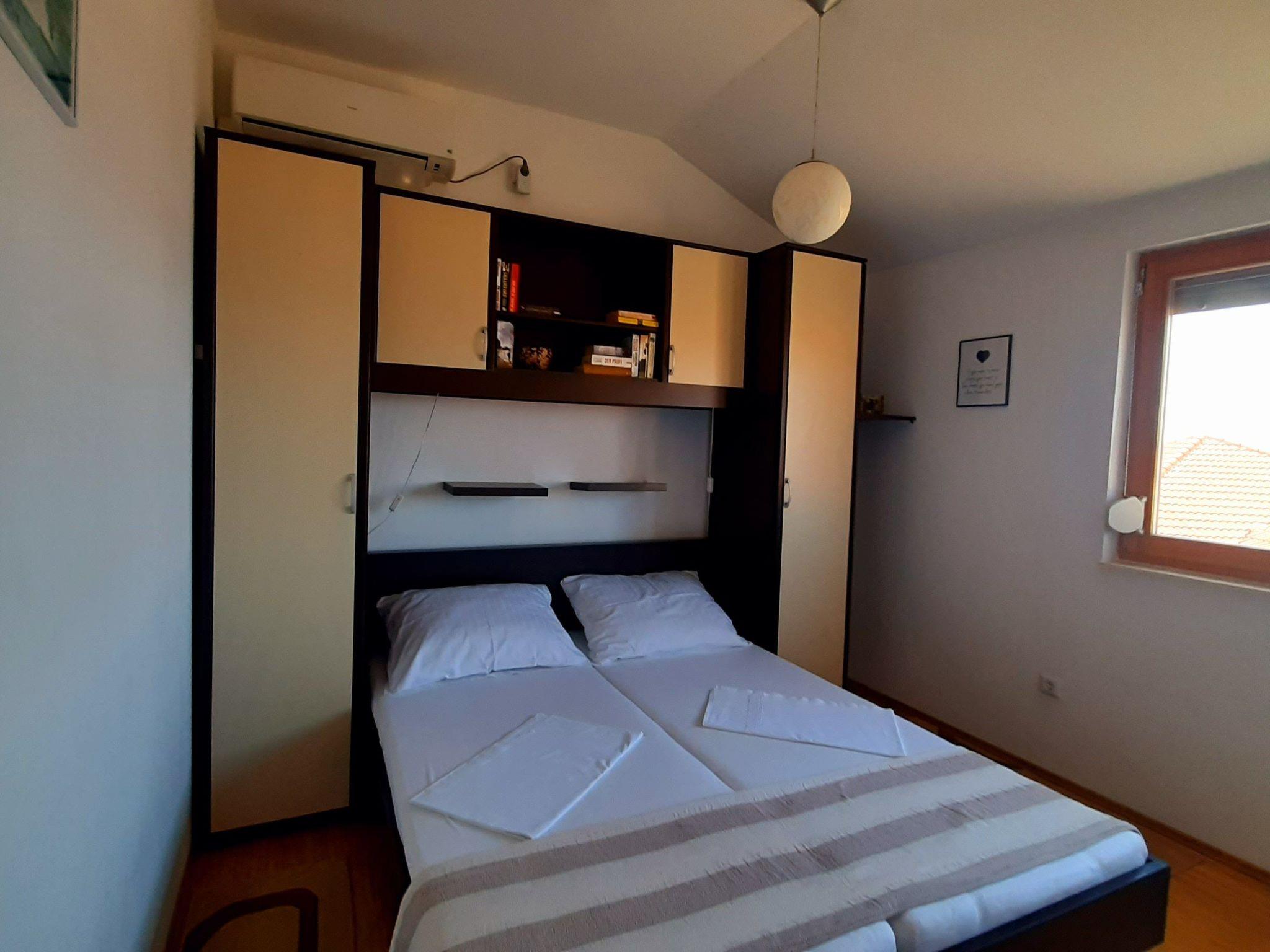 Die Wohnung hat zwei Schlafzimmer, eines mit zwei Einzelbetten und einem großen Kleiderschrank. Das zweite, größere Schlafzimmer hat ein Doppelbett und eine zusätzliche Schlafcouch, die zu einem bequemen Einzelbett ausgeklappt werden kann. Von diesem Schlafzimmer aus haben Sie Zugang zu einer privaten Loggia, die ebenfalls einen unverbaubaren Blick auf das Meer und die Umgebung von Ciovo bietet.