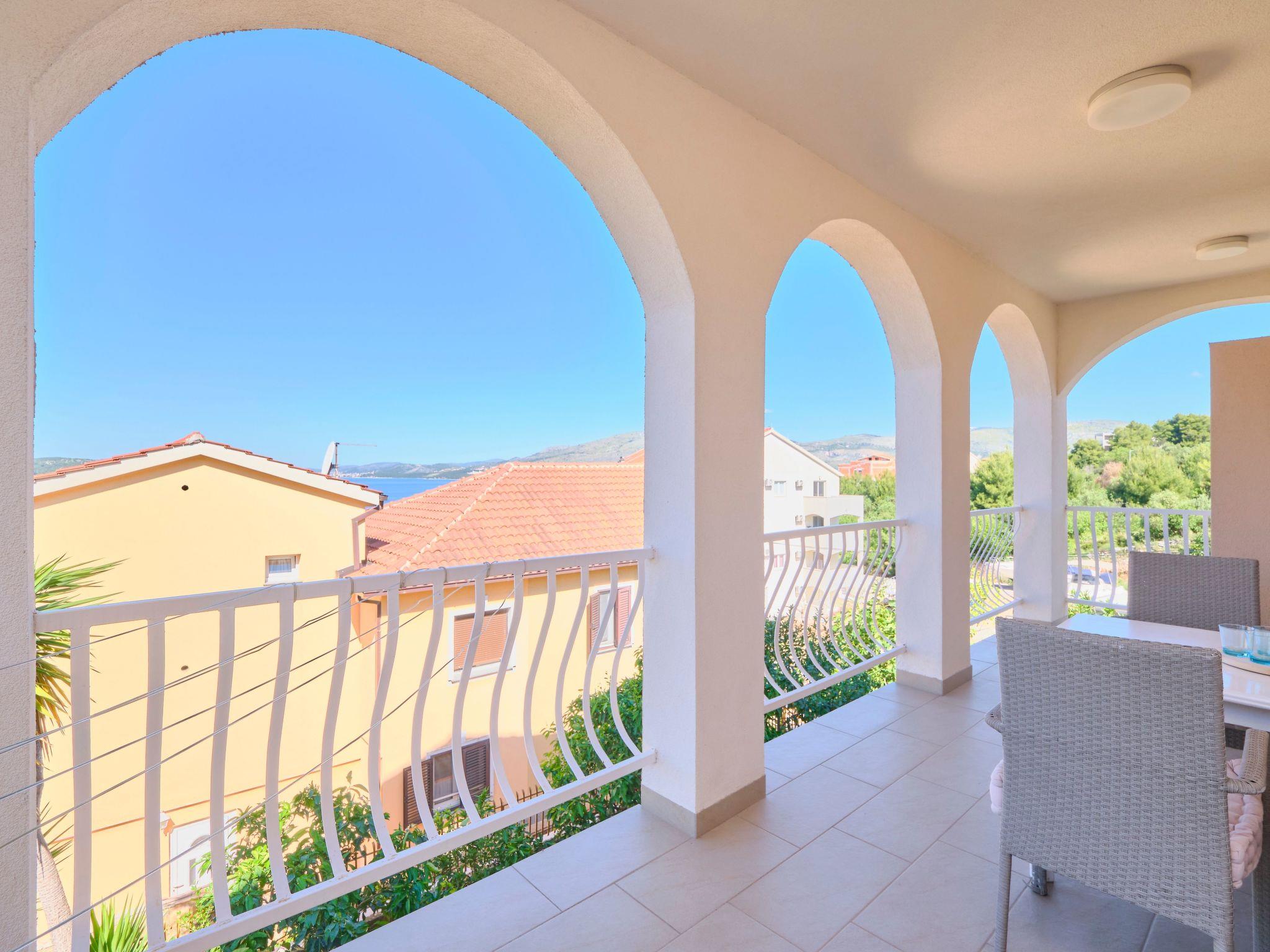 Der Außenbereich des Apartments zeichnet sich durch eine private Terrasse und einen Balkon aus, die eine idyllische Umgebung zum Entspannen und Essen im Freien bieten, während man den ruhigen Meerblick bewundert. Die Gäste finden hier ein perfektes Ambiente vor, in dem sie sich entspannen, speisen oder einfach nur die Schönheit der Natur genießen können, die sie umgibt.
