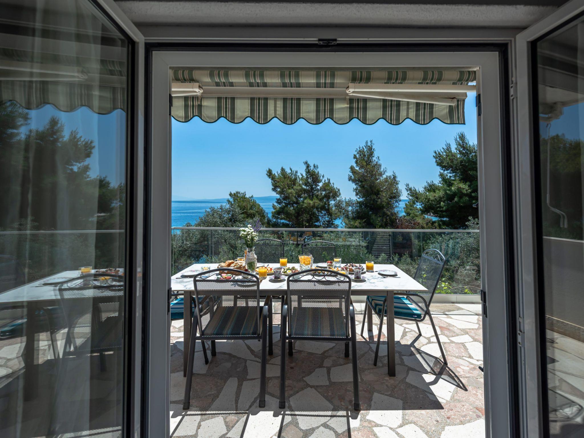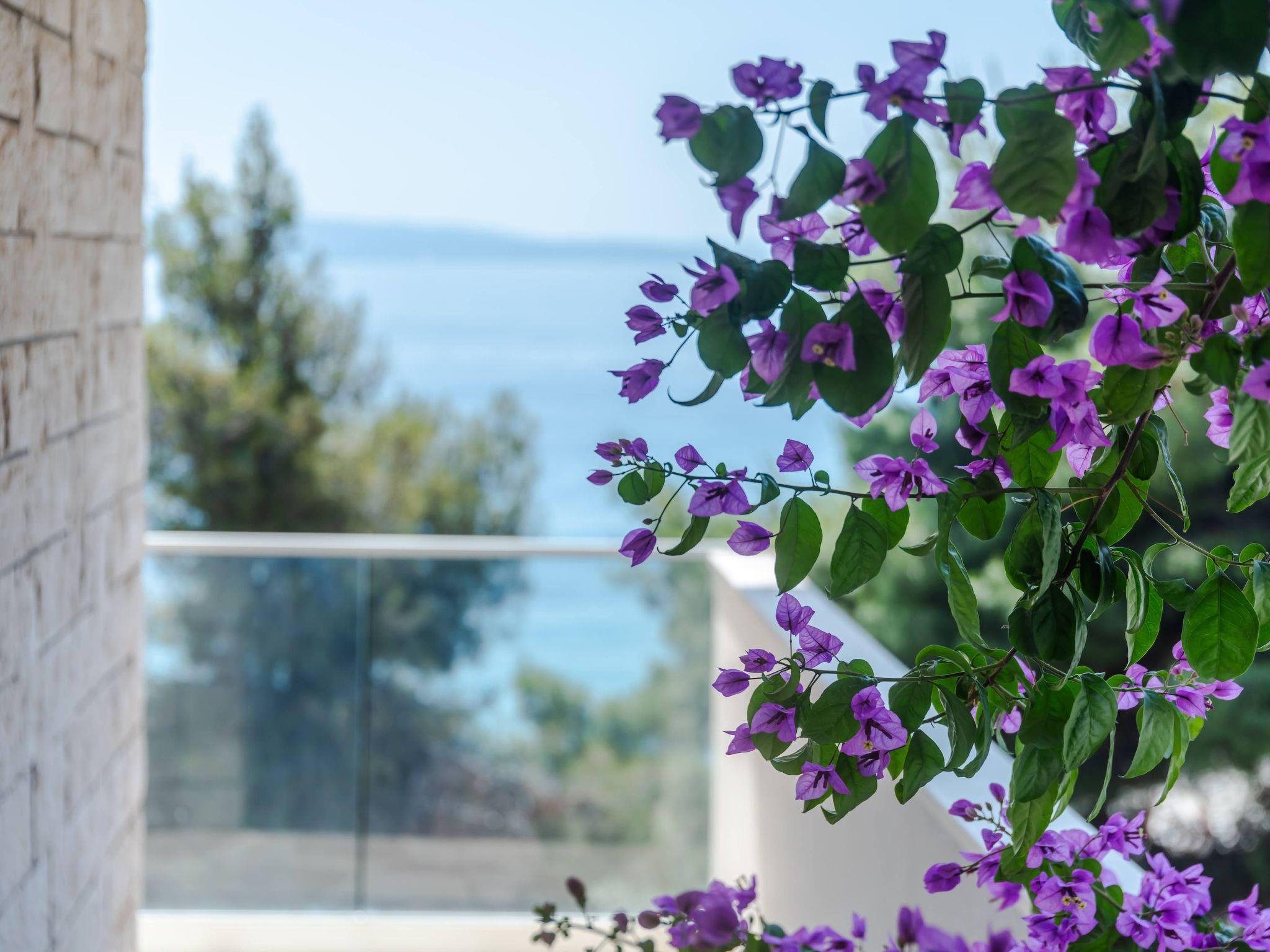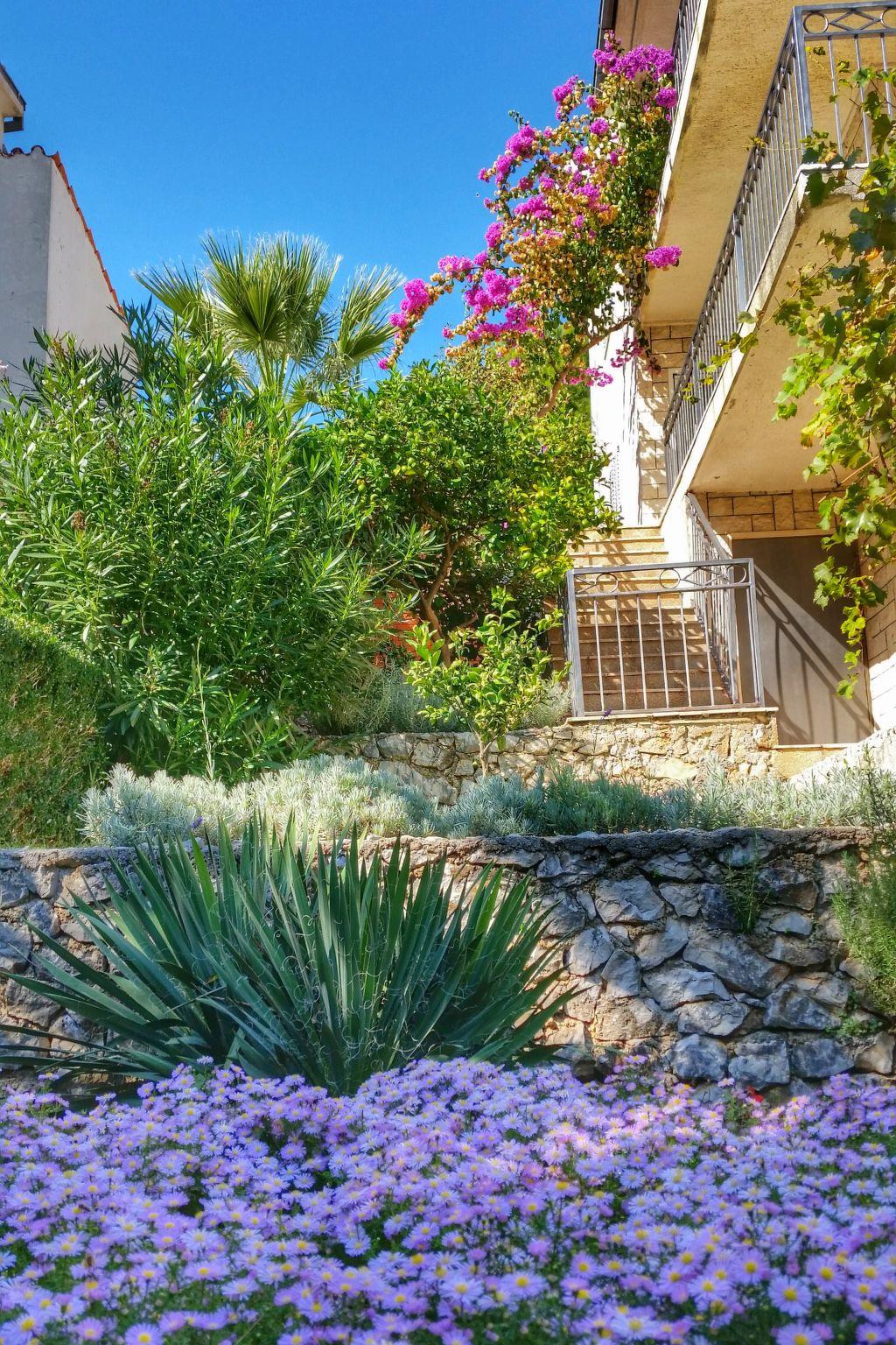 Das Wohnzimmer führt hinaus auf eine große Terrasse (30 m²) mit einer schönen Aussicht auf das Meer und den Garten. Ausgestattet ist die Terrasse mit Gartenmöbeln, Sonnenschirm und zwei Teak-Liegen. Genießen Sie die freie Aussicht und die Sonne. Das Haus verfügt über einen Garten mit mediterranen Kräutern sowie einen Außengrillplatz. Auf dem Grundstück ist auch ein Parkplatz für drei bis vier Autos vorhanden.