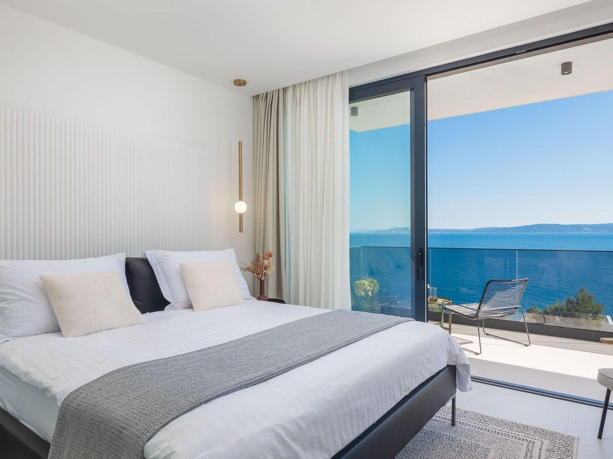 Eine Treppe führt in den ersten Stock, wo sich 3 Schlafzimmer, 2 Bäder und 1 Halbbad befinden. Das zweite Schlafzimmer hat ein Kingsize-Doppelbett. Das dritte und vierte Schlafzimmer haben ein Kingsize-Bett, ein eigenes Bad und einen gemeinsamen Balkon mit Meerblick.