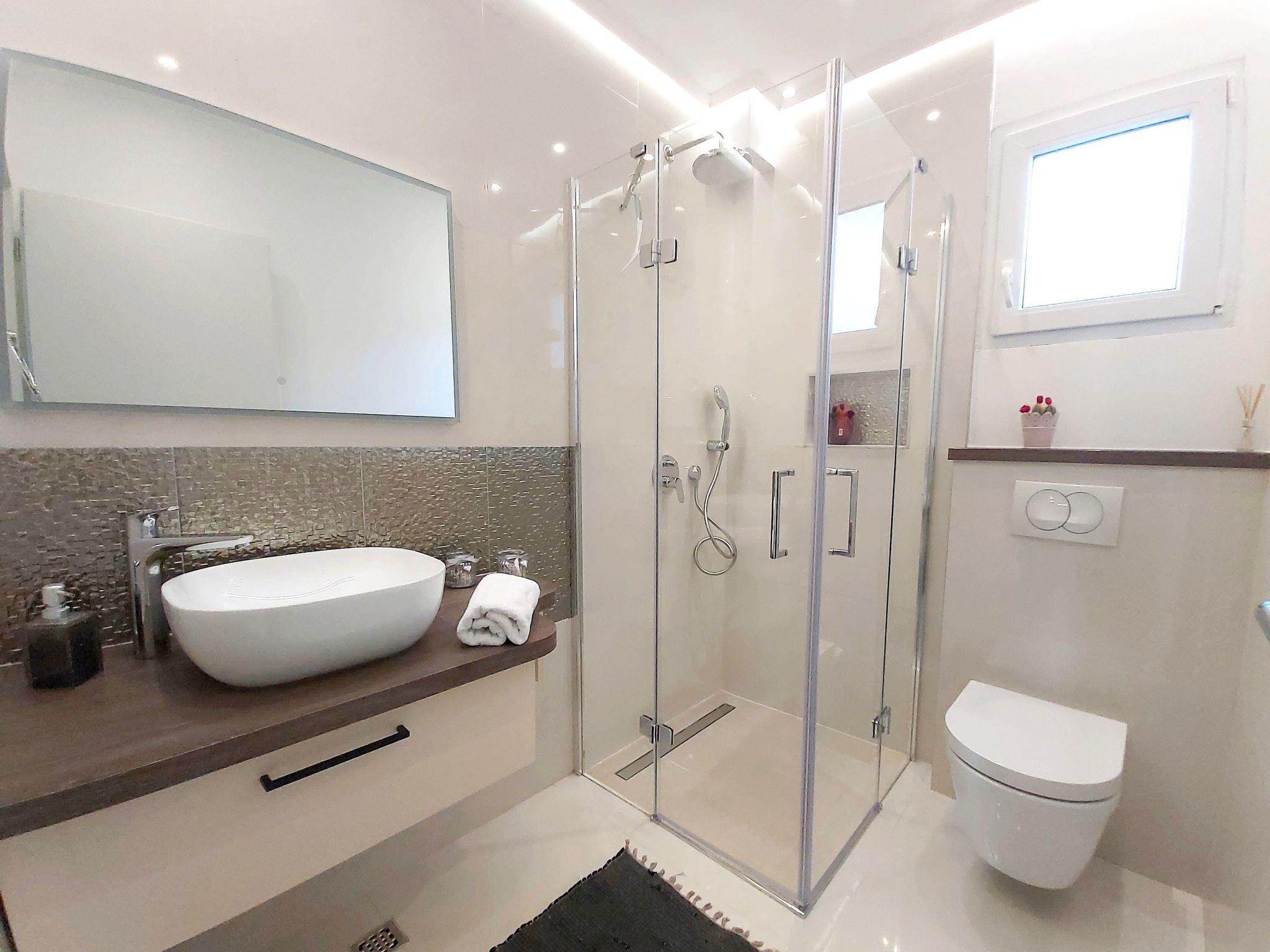 Diese 55 m² große, neu eingerichtete Ferienwohnung befindet sich im ersten Stock des Gebäudes und verfügt über einen Wohn-/Essbereich mit integrierter, voll ausgestatteter Küche, zwei Schlafzimmer und ein Badezimmer. Das klimatisierte Wohnzimmer ist mit einem Sofa und einem Satellitenfernseher ausgestattet. Der Essbereich bietet einen großen Holztisch mit passenden Stühlen. Neben dem Essbereich befindet sich die Küche, die mit Herd, Backofen, Kühlschrank, Gefrierfach, Geschirrspüler, Mikrowelle und Wasserkocher ausgestattet ist. Eines der beiden Schlafzimmer ist mit einem 160 cm x 200 cm großen Doppelbett ausgestattet, das andere Schlafzimmer hat zwei 90 cm x 190 cm große Einzelbetten, die zu einem Doppelbett zusammengeschoben werden können. Das Badezimmer ist mit einer Dusche, einem Waschbecken und einer Toilette ausgestattet. Ein zuverlässiger 5G-WLAN-Zugang wird kostenlos angeboten. Privater schattiger Parkplatz, Schwimmbad vom 20.04. bis 15.10. geöffnet.