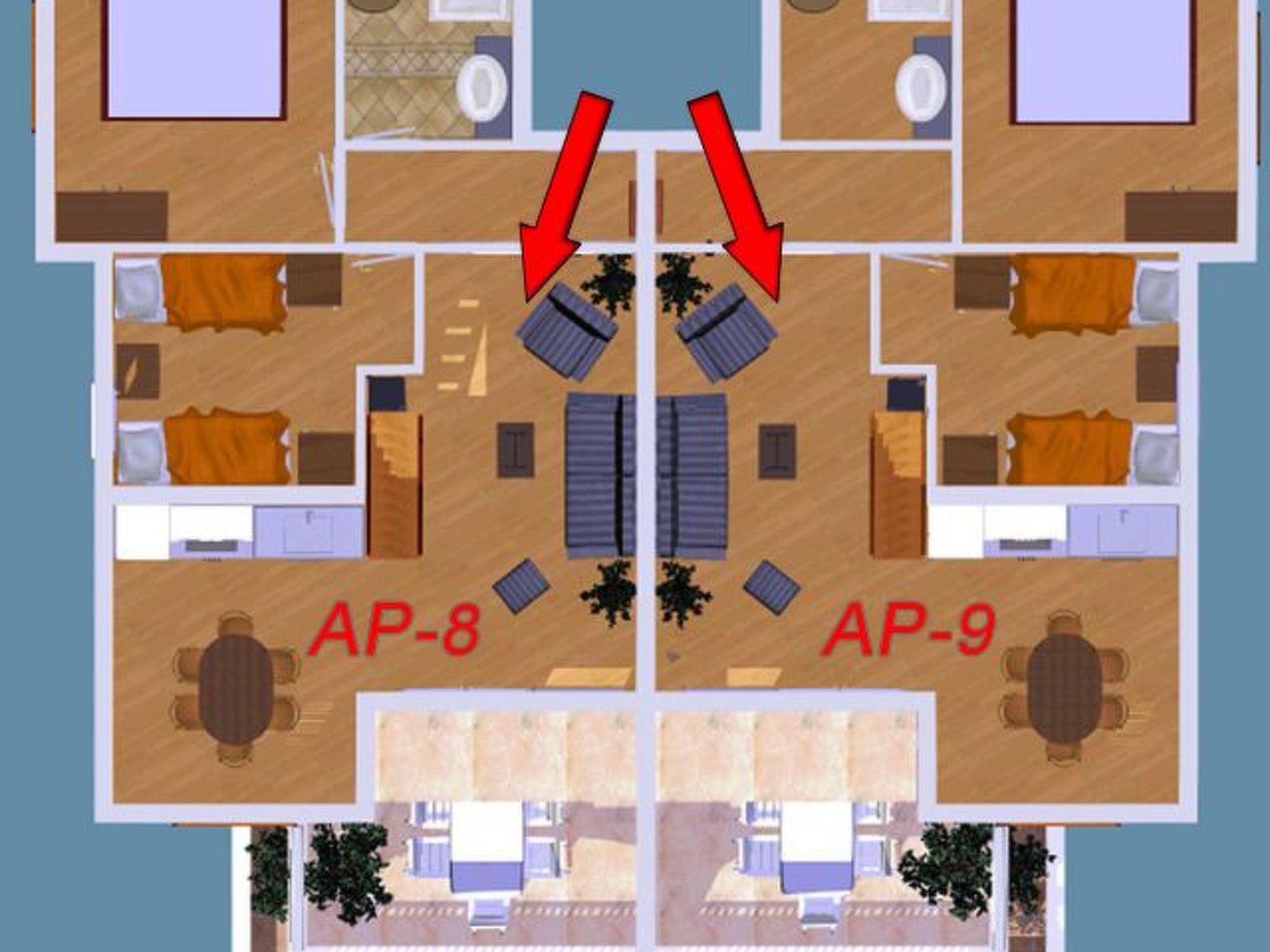 Diese 55 m² große Ferienwohnung befindet sich im obersten Stockwerk des Gebäudes und verfügt über einen Wohn-/Essbereich mit integrierter, voll ausgestatteter Küche, zwei Schlafzimmer und ein Badezimmer. Das klimatisierte Wohnzimmer ist mit einem Sofa und einem Satellitenfernseher ausgestattet. Der Essbereich bietet einen großen Holztisch mit passenden Stühlen. Neben dem Essbereich befindet sich die Küche, die mit Herd, Backofen, Kühlschrank, Gefrierfach und Wasserkocher ausgestattet ist. Eines der beiden Schlafzimmer ist mit einem 160 cm x 200 cm großen Doppelbett ausgestattet, das andere Schlafzimmer hat zwei 90 cm x 190 cm große Einzelbetten, die zu einem Doppelbett zusammengeschoben werden können. Das Badezimmer ist mit einer Dusche, einem Waschbecken und einer Toilette ausgestattet. Ein zuverlässiger 5G-WLAN-Zugang wird kostenlos angeboten. Privater schattiger Parkplatz, Schwimmbad vom 20.04. bis 15.10. geöffnet.