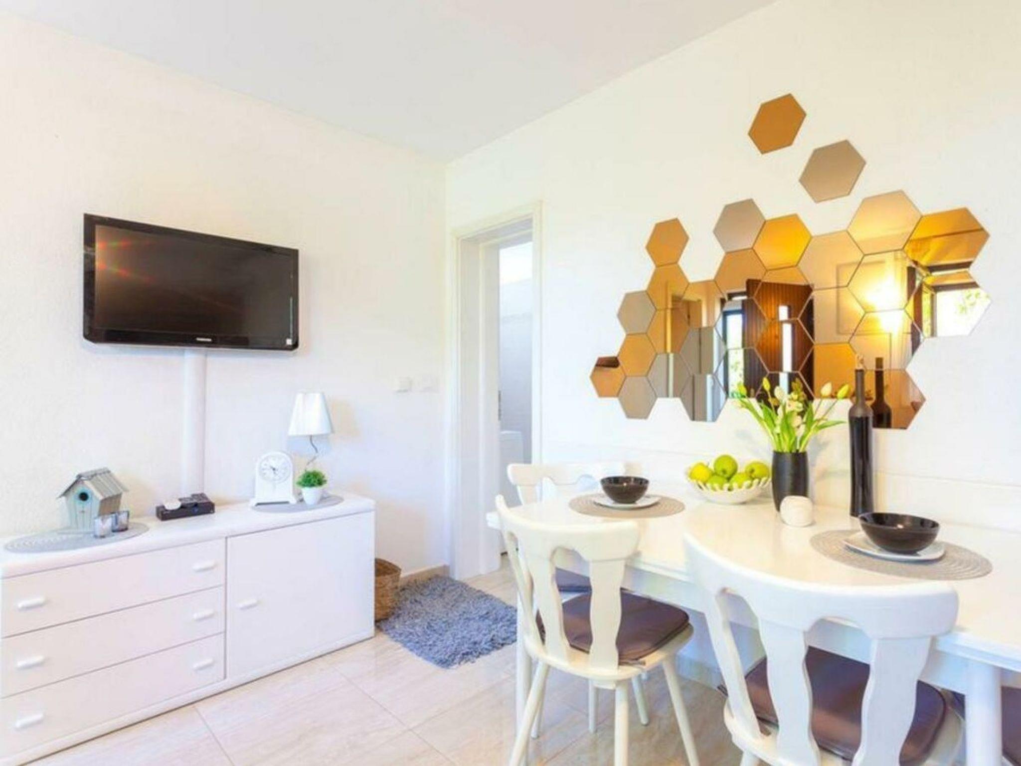 Der Eingang ist ebenerdig durch die Terrasse in das Wohnzimmer mit Sofa, Essecke, SAT / TV, Radio, DVD. Das Schlafzimmer ist mit Doppelbett, Kleiderschrank und Klimaanlage ausgestattet. Küche mit großem Kühlschrank, Gefrierschrank, Mikrowelle, Kaffeemaschine, Wasserkocher, Gewürzen, Geschirrtüchern. Badezimmer mit Dusche und Waschmaschine.
