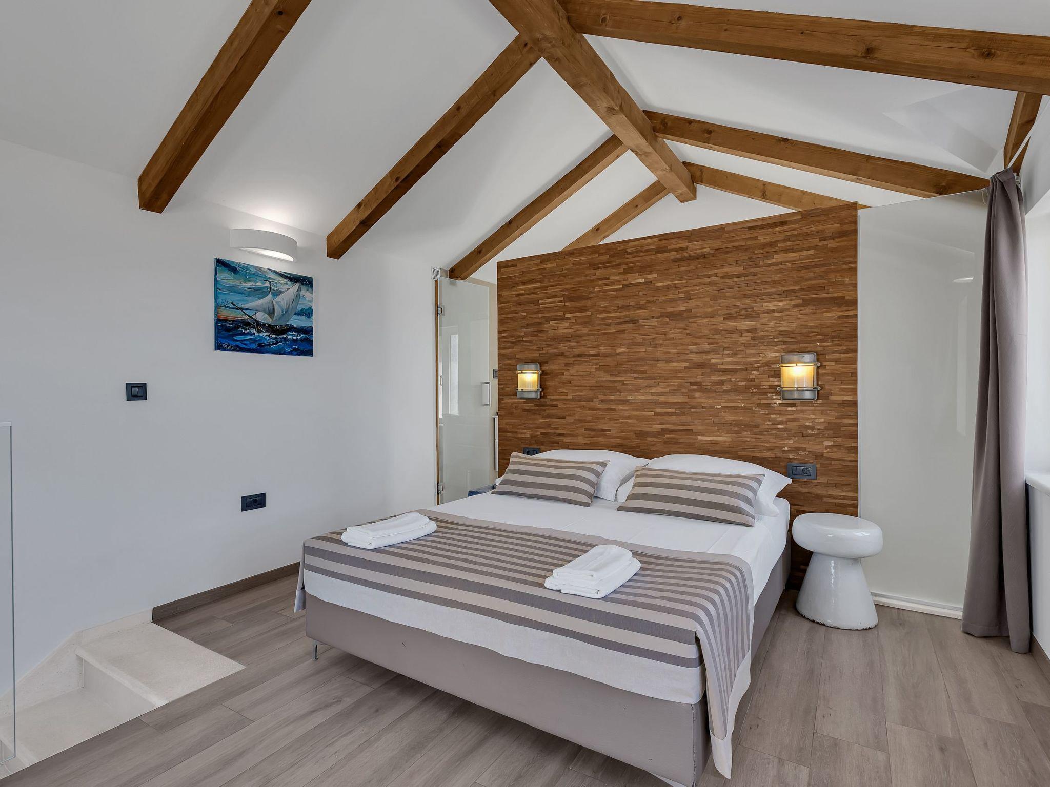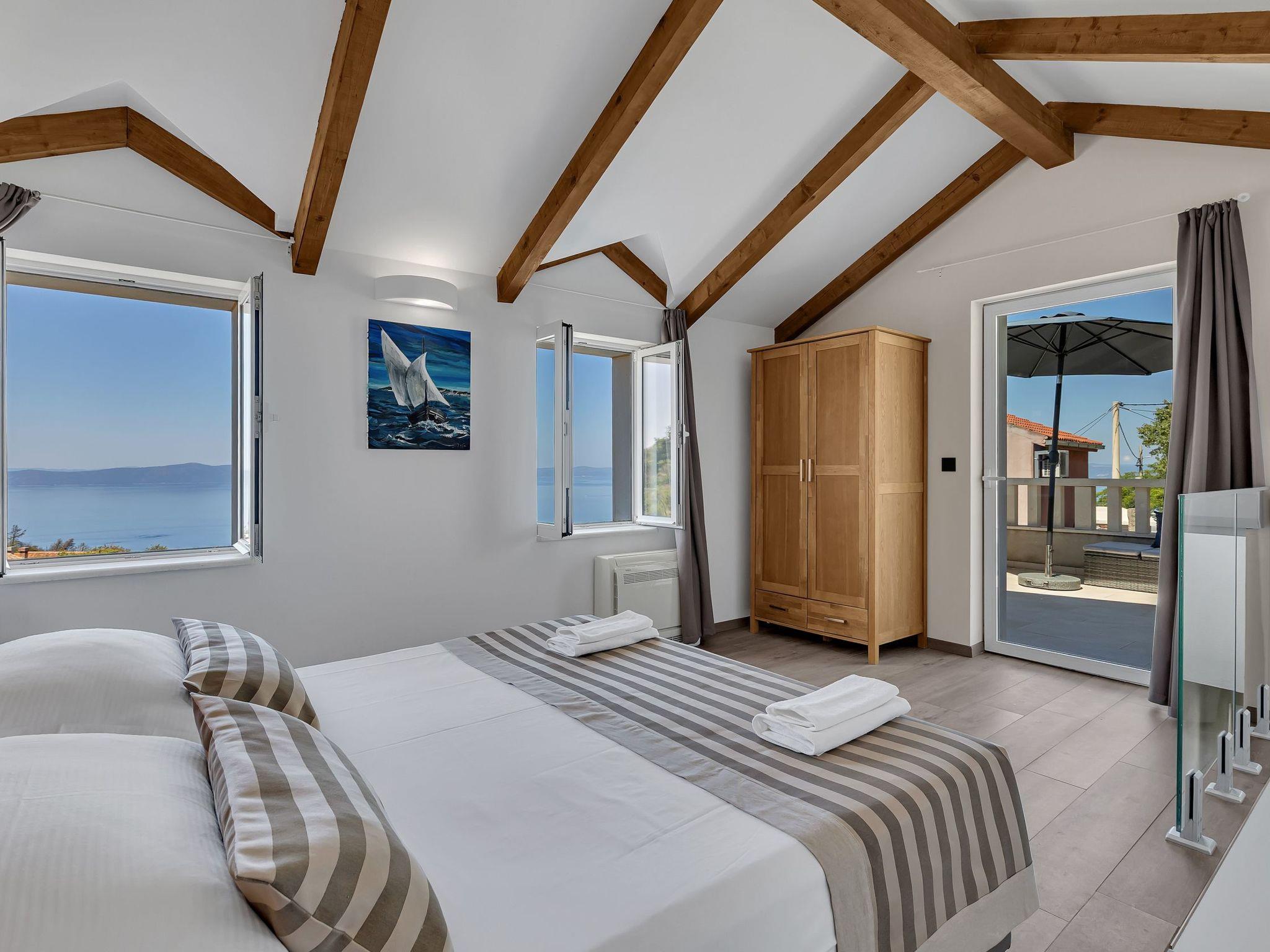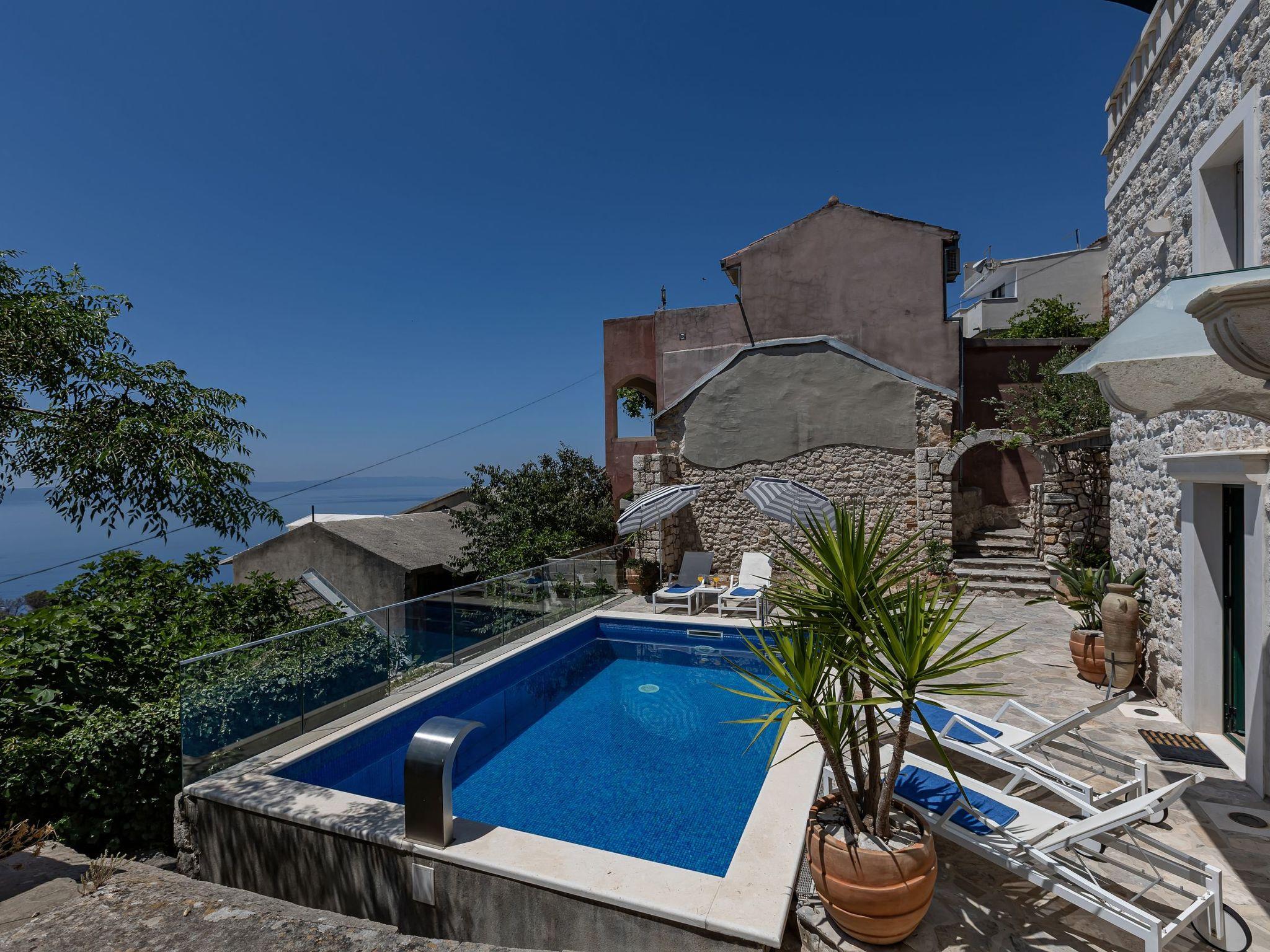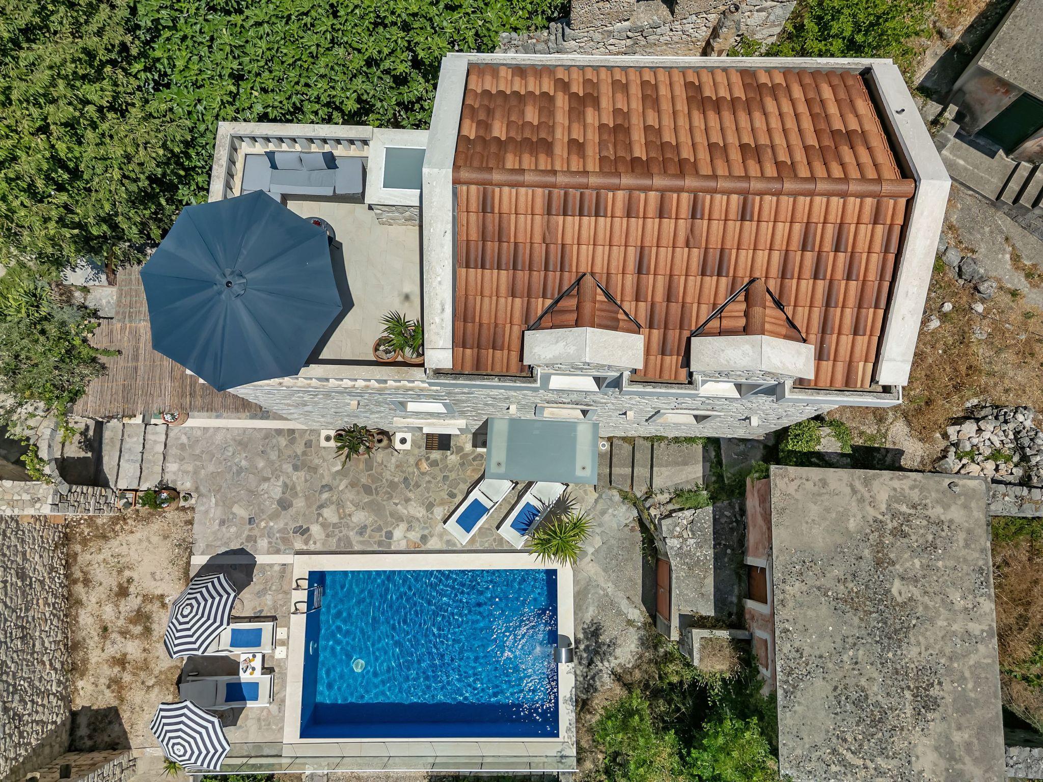 Der Außenbereich mit einem Pool und einer Terrasse lädt zum Entspannen ein. Ein Gartentisch und Stühle stehen für romantische Mahlzeiten im Freien bereit, begleitet von einer sanften Meeresbrise und einem beeindruckenden Blick auf die Bucht und die umliegenden Berge. Auch ein Grill steht zur Verfügung, um das mediterrane Leben in vollen Zügen zu genießen. Die hochwertige Ausstattung und die sorgfältige Pflege des Anwesens sorgen für ein erstklassiges Freizeiterlebnis.