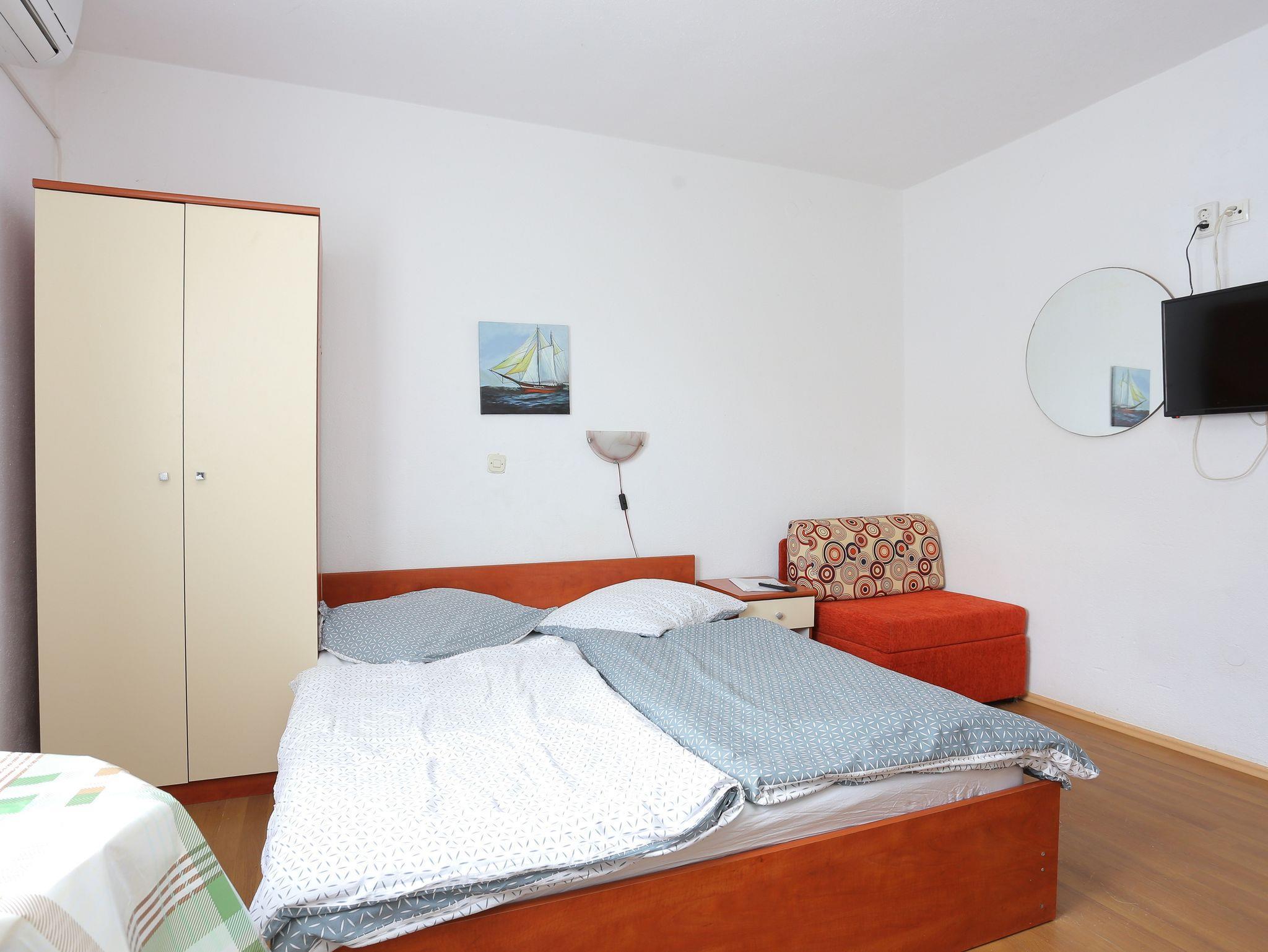 Studio bietet Platz für 3 Gäste. Die Betten sind in Schlafzimmern, die es 1 gibt, innerhalb einer Gesamtfläche von 15m2, angeordnet. Es ist erlaubt, Speisen auf dem Gemeinschafts-Grill vorzubereiten. Die reservierte Unterkunftseinheit hat keinen Balkon und keine Terrasse. IM PREIS INBEGRIFFEN: Kurtaxe, Endreinigung, Klimatisierung, Parkplatz, Internet, Bügelbrett. VERBINDLICHE ZUSÄTZLICHE KOSTEN: Aufzahlung für Kurzaufenthalte (prozentualer Zuschlag pro Nächtigungsanzahl: 30% - 1, 20% - 2, 10% - 3). Die Verfügbarkeit zusätzlicher Dienstleistungen in Ihrem reservierten Termin und die Preise derselben (falls nicht aufgeführt) müssen im Voraus überprüft werden. Zusätzliche Dienstleistungen die in der Zahlungsaufforderung nicht aufgeführt sind werden direkt beim Vermieter bezahlt, angenommen der Gast nutzt auch diese. Ermäßigung auf den Grundpreis: Gratistag 14=13 (bei einem Aufenthalt von 14 Tagen oder mehr erhalten Sie einen Gratistag für den Aufenthalt bis 31.12.26).