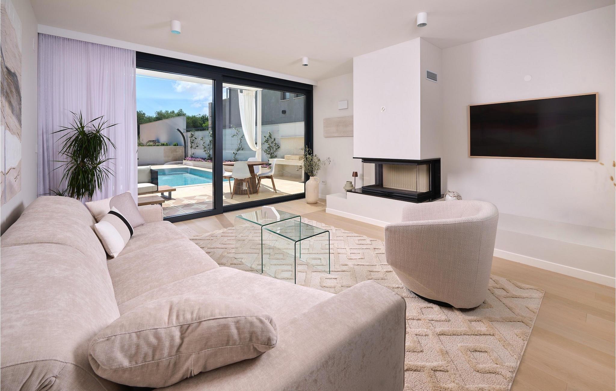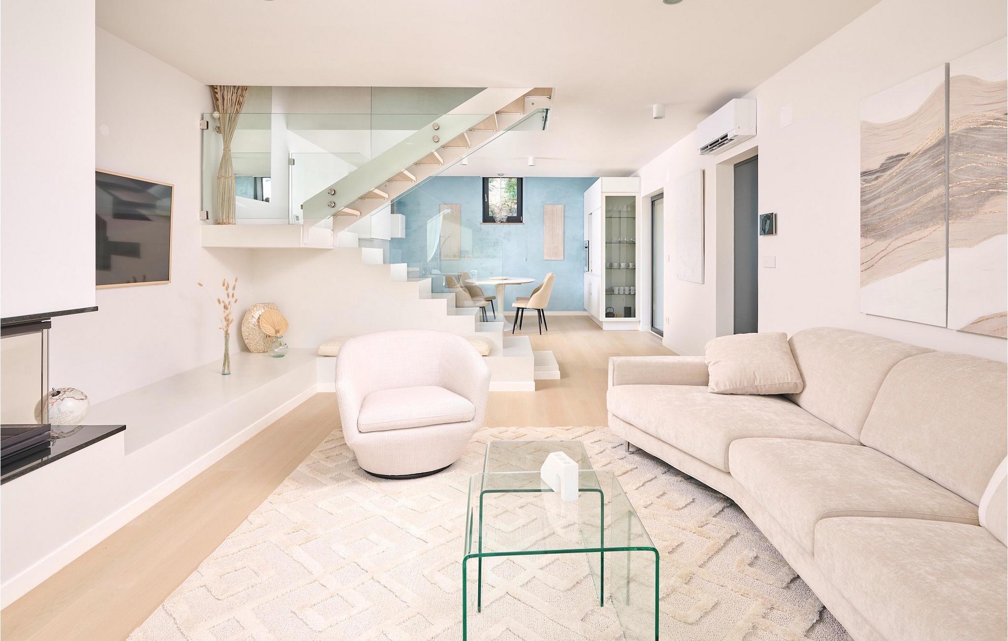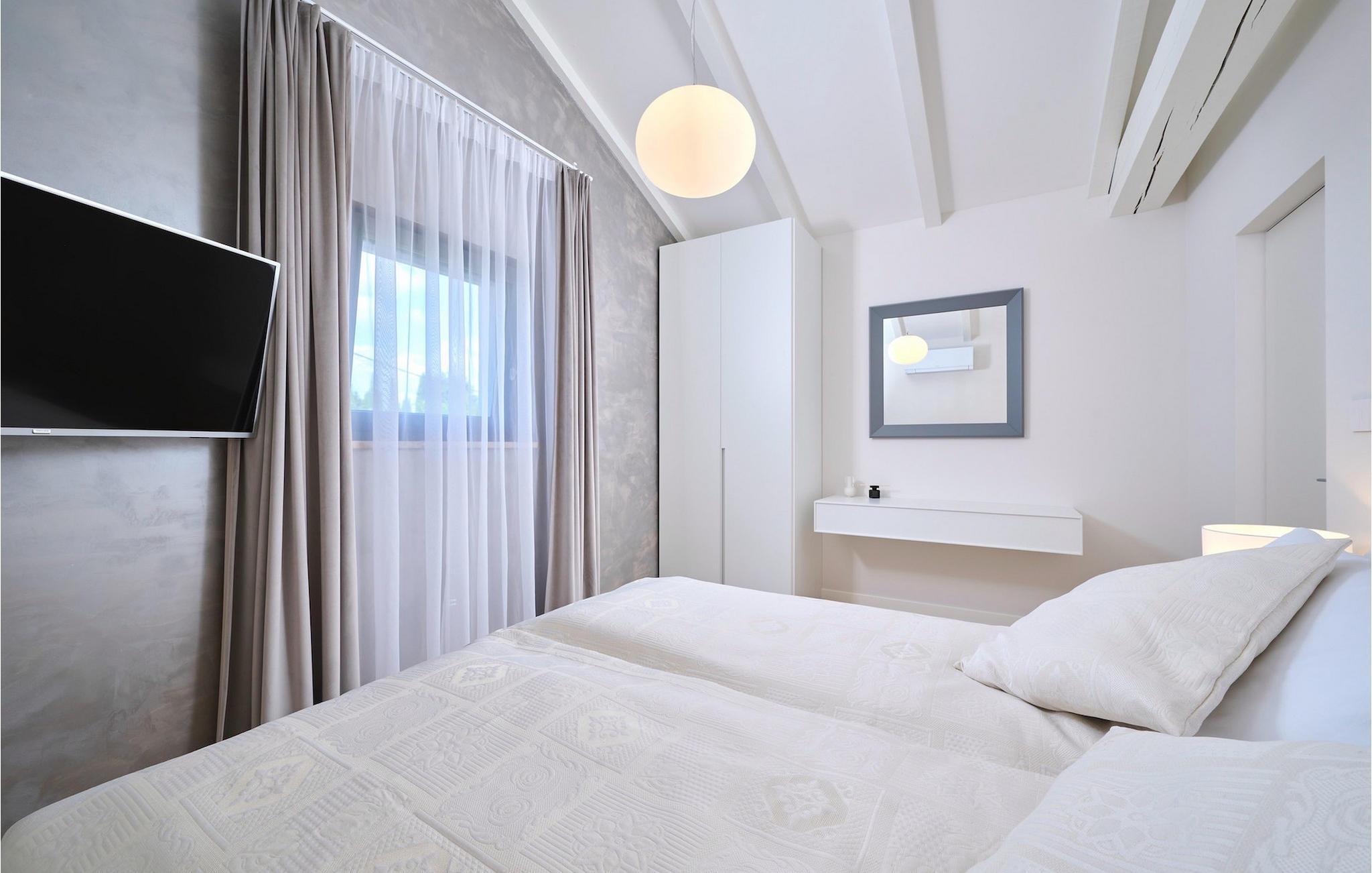 Beide Schlafzimmer befinden sich im ersten Stock. Die Schlafzimmer sind modern und komfortabel. Beide Zimmer verfügen über einen Fernseher und sind klimatisiert. Das Hauptschlafzimmer bietet ein Doppelbett, während das zweite Zimmer ein Doppelbett bietet, das in zwei Einzelbetten geteilt werden kann. Auf der gleichen Etage befindet sich auch ein Badezimmer. Im Erdgeschoss der Villa finden Sie ein helles, modern eingerichtetes Wohnzimmer mit Kamin und Fernseher sowie ein Essbereich und eine voll ausgestattete Küche, die in einem Open-Space-Konzept verbunden sind. Es gibt auch ein weiteres Badezimmer auf der Etage. Dieser Bereich ist klimatisiert und ideal für Ihren Urlaub. Der Garten der Villa bietet Ihnen verschiedene Orte zum Entspannen. An erster Stelle steht ein privater Pool mit Sonnenliegen. Für eine Pause vom Sonnenbaden und Schwimmen können Sie den schattigen Teil der Terrasse mit Relaxecke direkt neben dem Haus genießen. Im Garten finden Sie auch einen schattigen Essbereich mit Esstisch sowie einen Grill, wo Sie Ihre Kochkünste ausprobieren können.