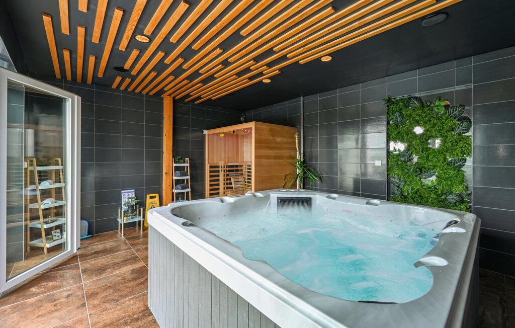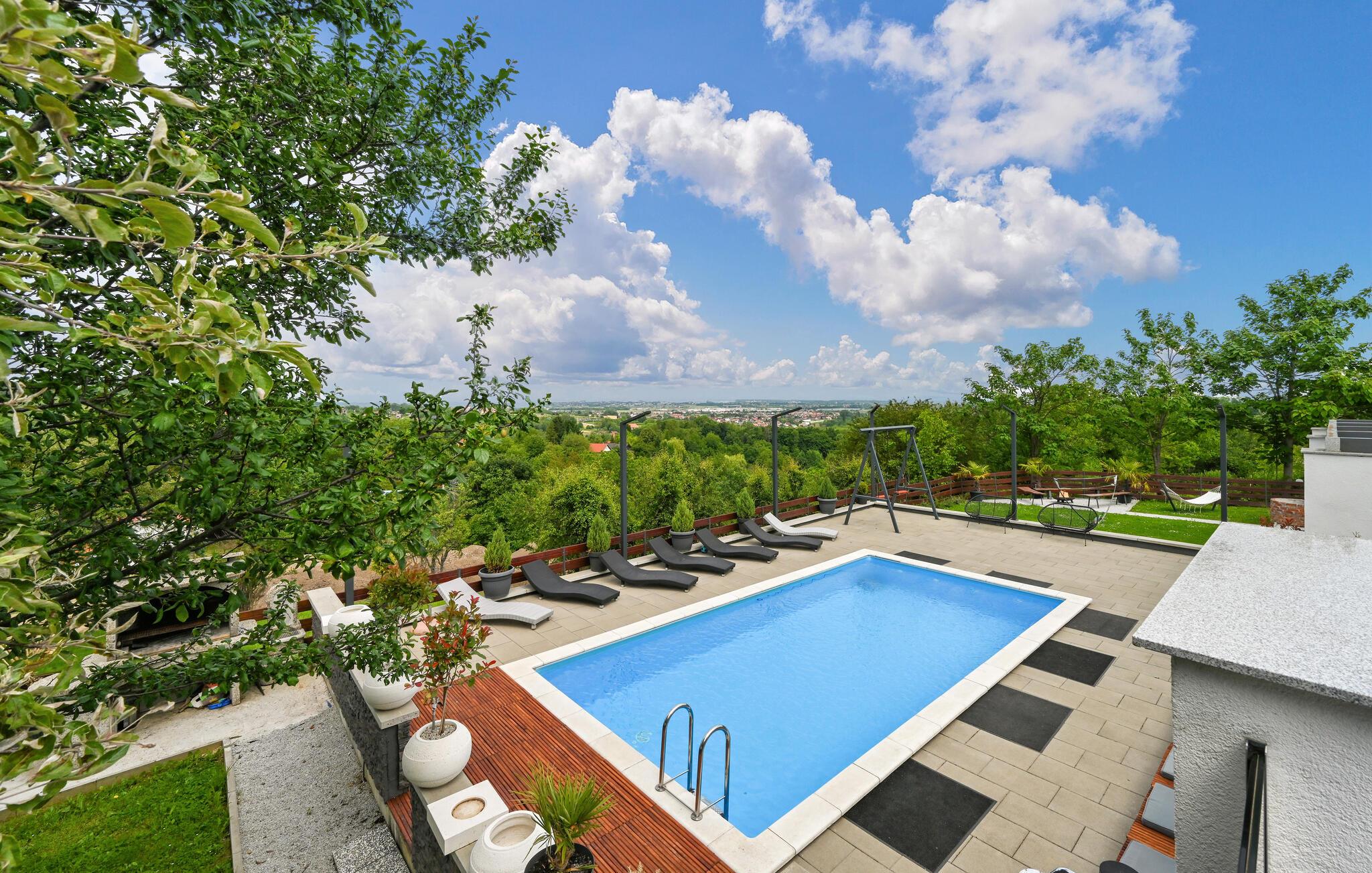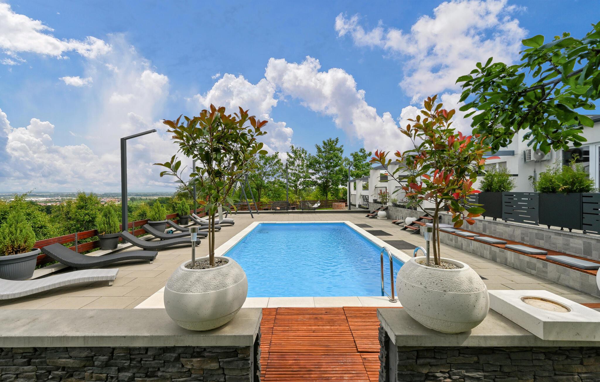 Draußen erwartet Sie ein privater Swimmingpool, der in den Sommermonaten Abkühlung und Badespaß verspricht. Entspannen Sie am Pool auf den Sonnenliegen und lassen Sie den Alltag hinter sich. Für die Kinder ist mit Schaukel, Sandkasten, Klettergerüst und Co. für Unterhaltung gesorgt. Am Abend können Sie den Tag mit einem leckeren Abendessen vom Grill auf einer der Terrassen ausklingen lassen.