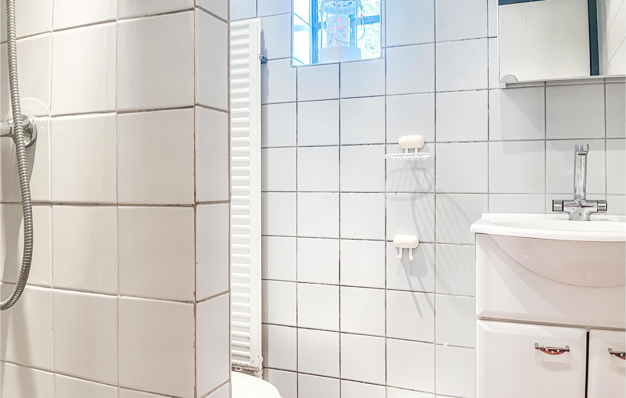 Das kleine, einfache Badezimmer hat eine Dusche und eine Toilette.