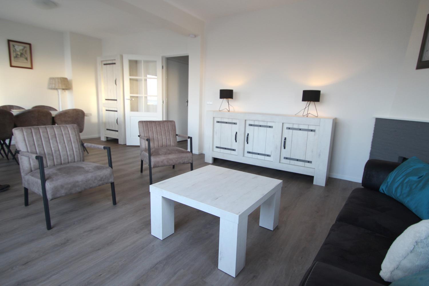 Das lichtdurchflutete Wohnzimmer ist geräumig und bietet bequeme Sitzgelegenheiten sowie einen Esstisch für vier Personen. Zwei gemütliche Schlafzimmer – eines mit einem Doppelbett, das andere mit zwei Einzelbetten – sorgen für erholsamen Schlaf. Die moderne Küche ist voll ausgestattet, inklusive Geschirrspüler. Das Badezimmer verfügt über eine Dusche und ein Waschbecken, während eine separate Toilette zusätzlichen Komfort bietet.