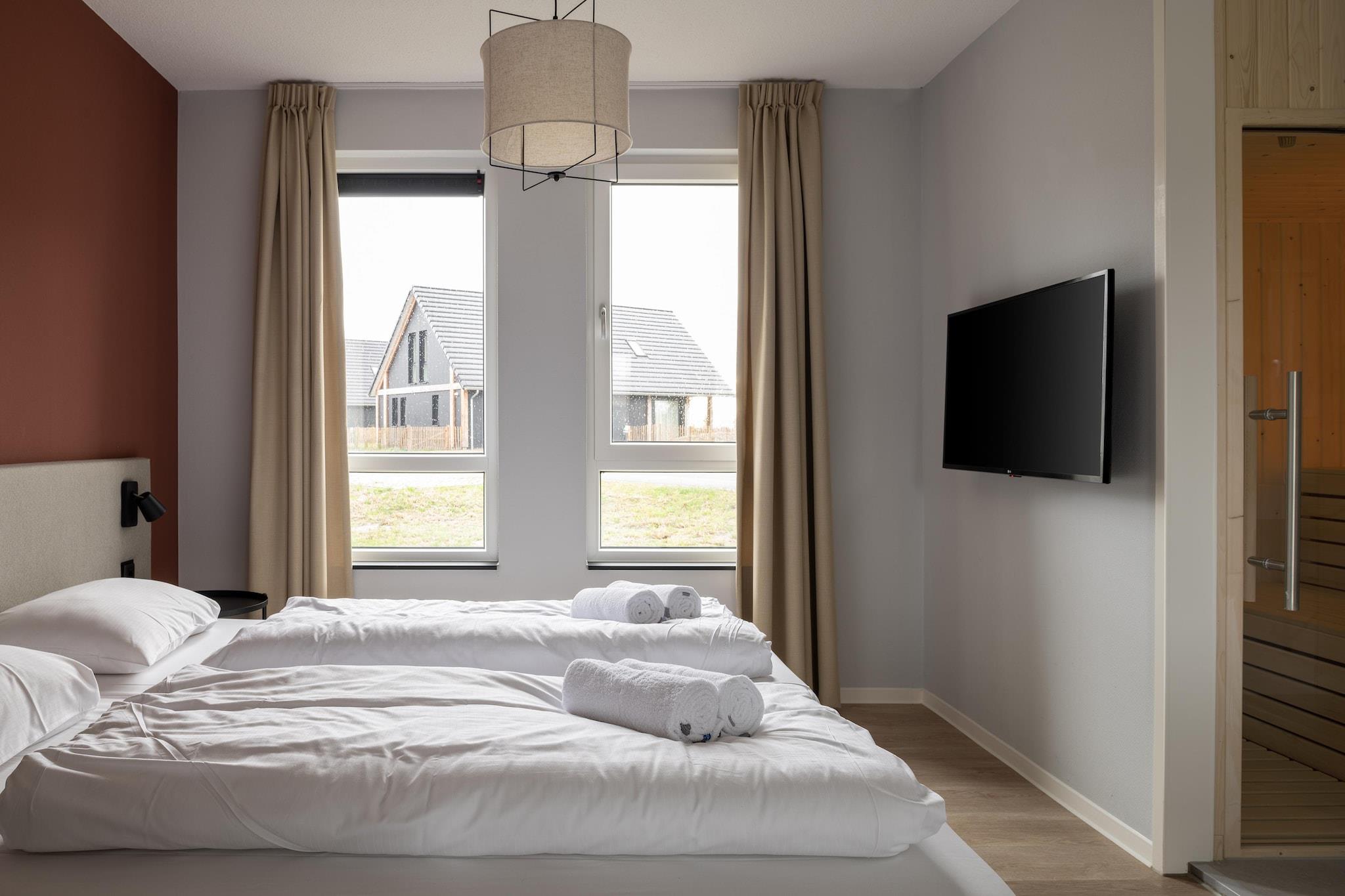 Dieses freistehende Ferienhaus mit eigener Sauna befindet sich im schönen Ferienpark Resort Nieuwvliet-Bad, der 2023 eröffnet wurde. Es liegt 16 km von dem berühmten belgischen Badeort Knokke entfernt. Der schöne Nordseestrand ist nur 1,2 km entfernt. Das Ferienhaus ist ideal für einen angenehmen Urlaub mit der ganzen Familie. Das Haus ist komfortabel und komplett eingerichtet und besteht aus zwei Etagen. Im Erdgeschoss finden Sie ein schönes Wohnzimmer mit Smart-TV mit Streaming-Funktion. In der modernen Küche mit Kochinsel finden Sie unter anderem ein doppeltes Bora-Kochfeld, zwei Kombibacköfen, zwei Geschirrspüler, einen Weinkühlschrank und einen Kaffeebohnenautomaten. Es gibt zwei Schlafzimmer mit jeweils zwei Einzelbetten. Boxspringbetten, auch in 2-Pers. Konfiguration. Beide Schlafzimmer haben ein eigenes Badezimmer, eines mit Badewanne und eines mit Sauna und Dusche. In einem der Schlafzimmer steht Ihnen ein Smart-TV mit Streaming-Funktion zur Verfügung. Auf dem Flur befindet sich ein separates WC. Im Obergeschoss gibt es weitere fünf Schlafzimmer mit jeweils zwei Boxspring-Einzelbetten, die eventuell als Doppelbett zusammenstehen. Zwei der Schlafzimmer haben ein eigenes Badezimmer mit Dusche und WC und ein Schlafzimmer hat ein Badezimmer mit Badewanne, Dusche und WC. Das vierte Badezimmer, das über den Flur erreichbar ist, verfügt über eine Dusche und ein WC. In zwei der Schlafzimmer im Obergeschoss finden Sie einen Smart-TV mit Streaming-Funktion. Durch die Flügeltüren erreichen Sie den großen Garten mit Terrasse und Gartenmöbeln. Beim Ferienhaus können drei Autos parken. Hier finden Sie auch eine Ladestation für Ihr Elektroauto. Im Ferienpark Resort Nieuwvliet-Bad können verschiedene Ferienhäuser, Bungalows, Villen und Gruppenunterkünfte für zwei bis zwanzig Personen gebucht werden. Die Hallen- und Freibäder des Ferienparks werden ab dem 7. Juli 2023 geöffnet sein.