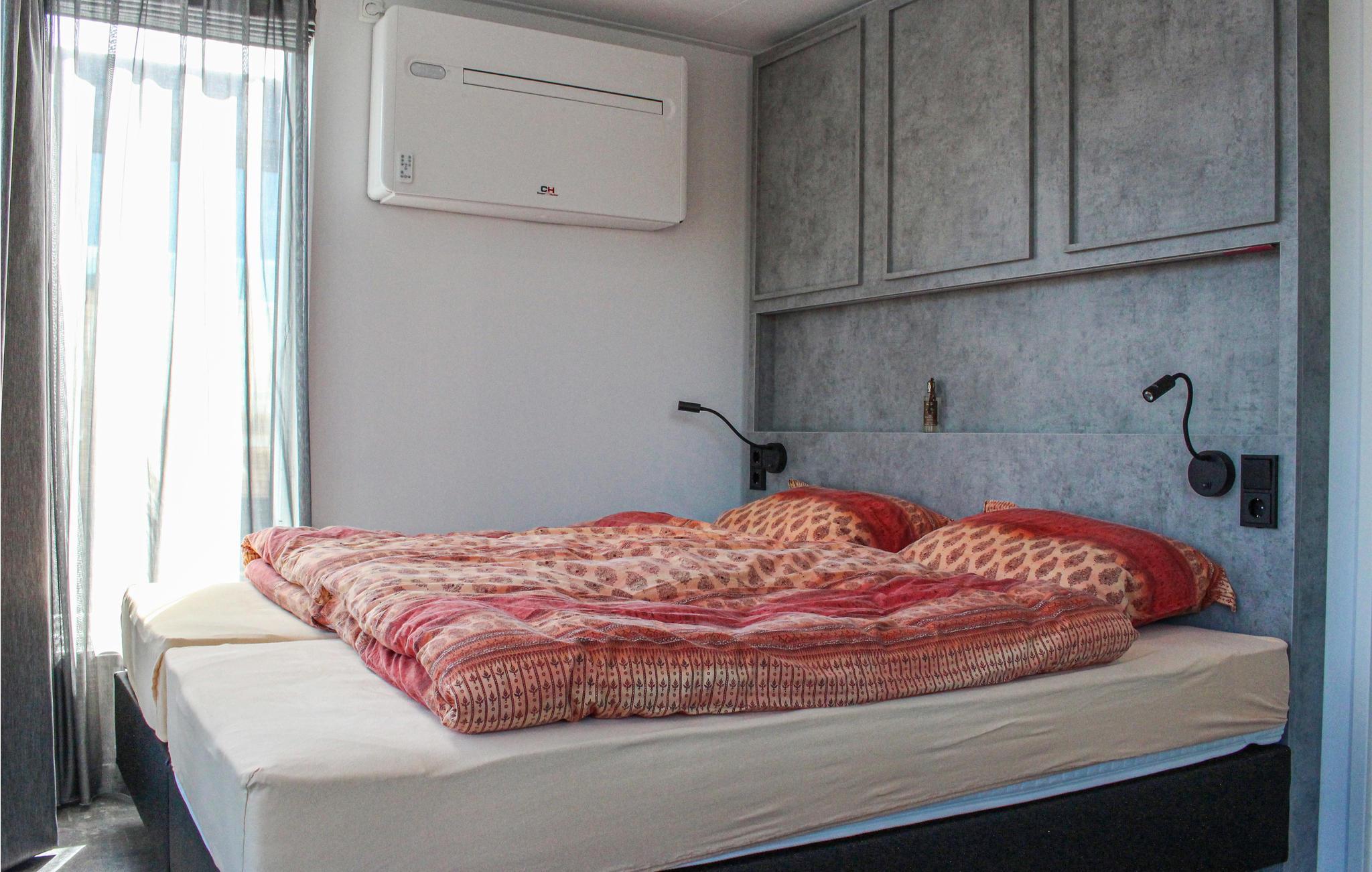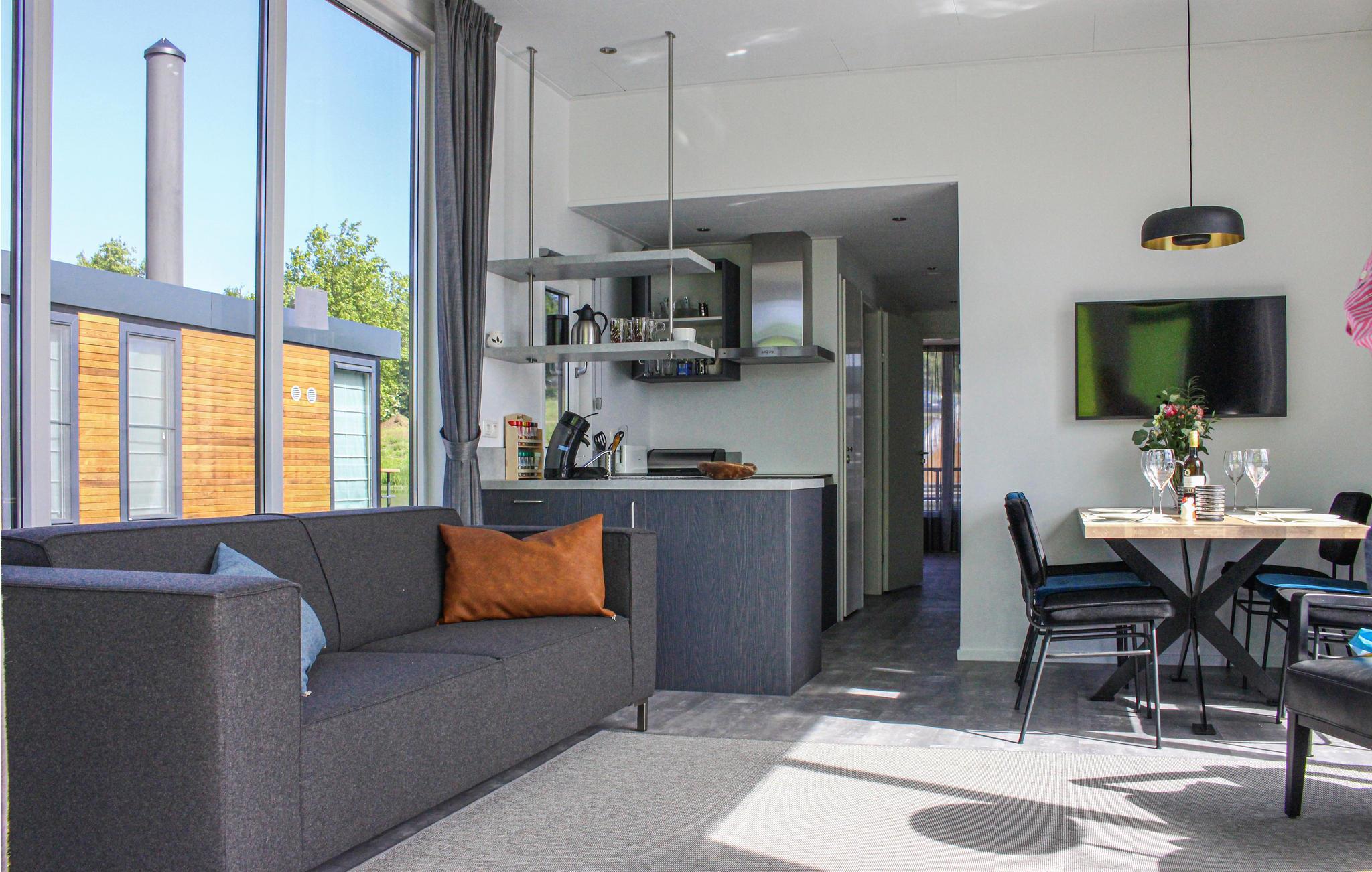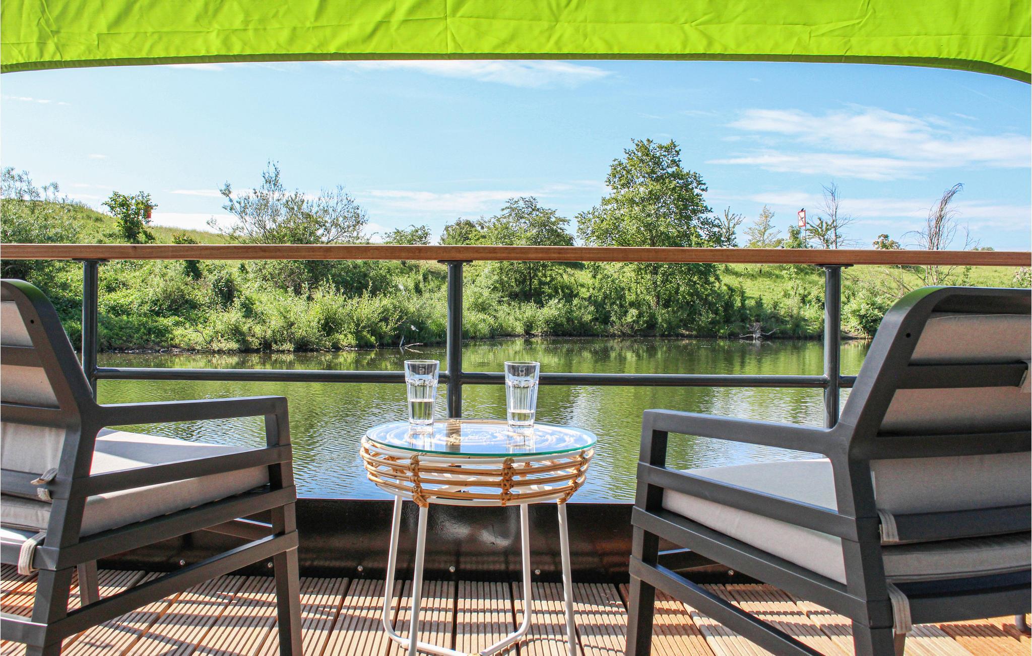 Das schwimmende Ferienhaus verfügt über einen eigenen Steg, an dem Sie Ihr kleineres Boot, Kanu oder SUP festmachen können. Sie betreten das Haus über die Terrasse mit freiem Blick auf das Wasser. Wenn Sie Schatten brauchen, hält der Eigentümer im Haus ein Sonnensegel für Sie bereit. Über die Terrasse betreten Sie das Wohnzimmer mit offener Küche. Vom Sitz- und Essbereich haben Sie einen schönen Blick auf das umliegende Wasser. Für ein Hausboot ist die Küche überdurchschnittlich gut ausgestattet. Zum Beispiel gibt es einen kleinen Geschirrspüler und einem Ofen. Die Schlafzimmer hat ein Doppelbett (200x180cm). Wenn Sie getrennt schlafen möchten, steht ein zweiter Schlafbereich zur Verfügung.