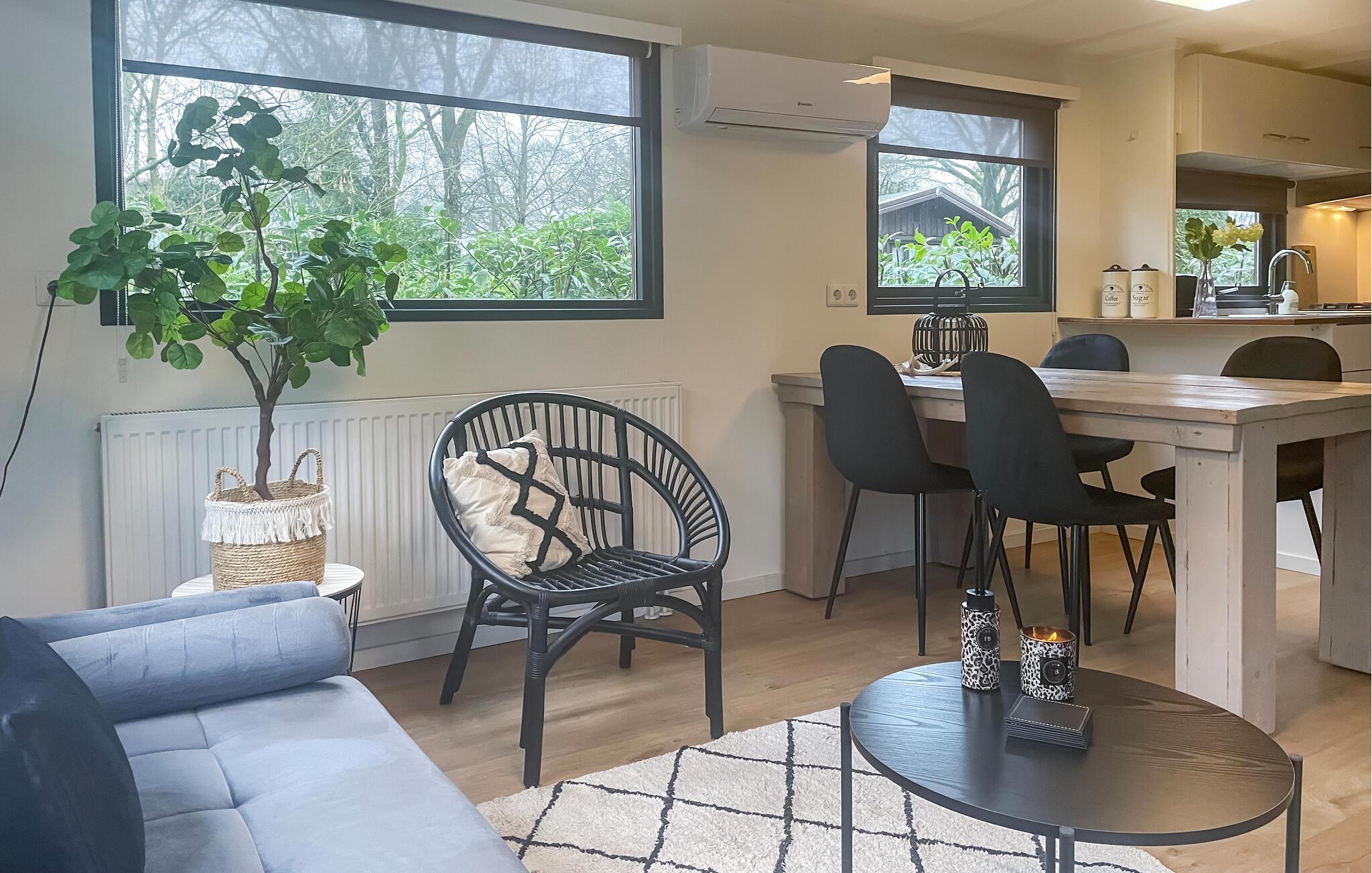 Gönnen Sie sich als Paar eine wohltuende Auszeit von Ihrem hektischen Alltag und verbringen ruhige Urlaubstage in diesem modernen eingerichteten Ferienhaus. Das gemütliche Haus bietet Ihnen alles, was Sie zum Wohlfühlen brauchen, und verspricht im Wohnbereich mit Sofa den idealen Platz, um ein Buch im Tageslicht zu lesen.