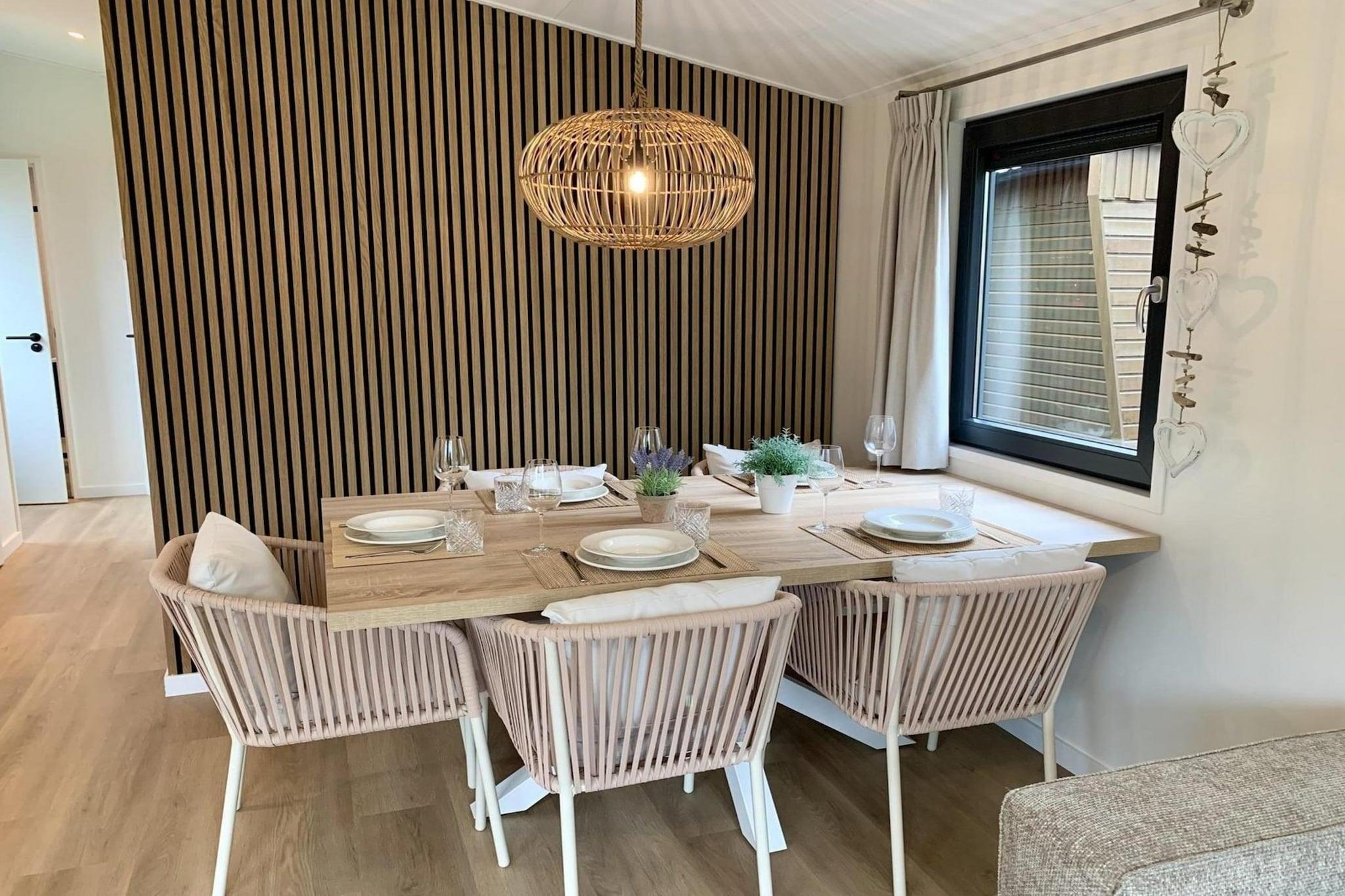 Nur eine kurze Radtour vom Sandstrand von Sint Maartenszee entfernt bietet dieses brandneue Chalet die perfekte Mischung aus Komfort, Stil und Entspannung. Mit seinem modernen Design, natürlichen Holzakzenten und einer gemütlichen, überdachten Veranda ist es ein luxuriöser und einladender Rückzugsort. Große Fenster strömen ins Licht und betonen die offenen Räume. Die natürlichen Farbtöne verleihen dem Interieur eine ruhige und luftige Atmosphäre. Im Inneren erwartet Sie ein geräumiges Wohnzimmer mit einem bequemen Sofa und Sessel – ideal zum Entspannen nach einem Tag am Meer. Die elegante, voll ausgestattete Küche macht das Essen zu einem Vergnügen, während der gemütliche Essbereich zu langen, gemeinsamen Mahlzeiten einlädt. Zwei Schlafzimmer sorgen für erholsame Nächte: ein Hauptschlafzimmer mit einem Boxspringbett für zwei Personen und ein zweites mit einem Etagenbett und einem zusätzlichen Klappbett – eine ausgezeichnete Wahl für Familien oder kleine Gruppen. Ein modernes Badezimmer mit Dusche, Waschtisch und WC rundet den wohnlichen Komfort ab. Durch die Schiebetüren gelangen Sie auf die Veranda, wo Sie Ihre Mahlzeiten im Freien genießen oder einfach auf den Liegestühlen mit Blick auf den privaten Garten entspannen können. Ob bei Regen oder Sonnenschein – auf der überdachten Terrasse können Sie die frische Luft genießen. Gäste haben außerdem kostenlosen Zugang zum Hallenbad im Park. Annehmlichkeiten wie Sauna, Minigolf und vieles mehr sorgen für zusätzlichen Komfort. WLAN, Zentralheizung und ganzjähriger Komfort machen dieses Ferienhaus zu einem wunderbaren Rückzugsort an der Küste, an dem Sie abschalten, entspannen und unvergessliche Erinnerungen schaffen können. Bettwäsche ist optional und kostet 13 EURO pro Person und Aufenthalt.
