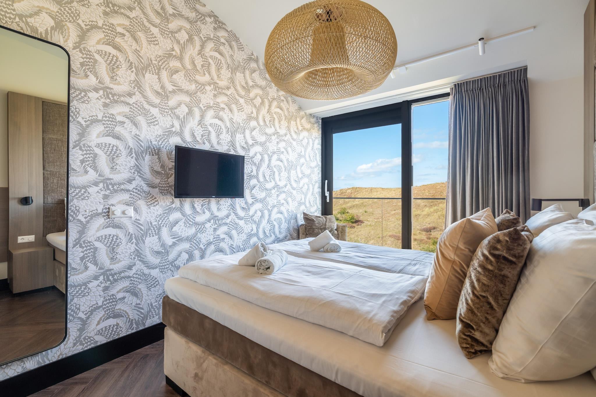 Stellen Sie sich vor, Sie öffnen die Türen Ihres Balkons und werden von endlosen Dünen begrüßt, die auf die schimmernde Nordseelinie treffen. Der sanfte Rhythmus der Wellen streicht durch die Luft und vermischt sich mit der stillen Schönheit Ihrer Umgebung. Das ist das Penthouse Zilt – ein Ort, an dem Raum, Licht und Design zu etwas Außergewöhnlichem vereinen. Das Penthouse erstreckt sich über zwei Ebenen im 2. und 3. Stock der Residence Westduin und strahlt ein Gefühl von kultiviertem Komfort aus. Jeder Winkel wirkt bewusst gewählt, jedes Detail sorgfältig ausgewählt. Die elegante Einrichtung, die natürlichen Farbtöne und die sanften Texturen verleihen dem Raum eine ungezwungene Wärme – ein Zuhause, das Ruhe und Eleganz ausstrahlt. Sie erreichen Ihren privaten Rückzugsort direkt vom Parkhaus aus mit dem Aufzug oder über die Treppe, ganz wie Sie möchten. Das Hauptschlafzimmer ist purer Luxus. Es bietet nicht nur ein extragroßes Bett, sondern auch eine freistehende Badewanne – perfekt für entspannte Morgen oder ruhige Abende, an denen Sie den Tag ausklingen lassen können. Zwei weitere Schlafzimmer bieten flexible Schlafmöglichkeiten mit bequemen Einzelbetten, die einzeln oder zusammen gestellt werden können. Die beiden modernen Badezimmer machen das Erlebnis noch schöner – eines davon verfügt über eine eigene Sauna, eine Oase der Entspannung, die jeden Tag zu einem kleinen Rückzugsort macht. Treten Sie hinaus und die Schönheit von Sint Maartenszee entfaltet sich vor Ihnen. In wenigen Minuten erreichen Sie den breiten Sandstrand, wo die Dünen ins Meer ragen und die Zeit stillzustehen scheint. Radeln Sie entlang der Küstenwege, durchqueren Sie farbenfrohe Blumenfelder oder erkunden Sie charmante Dörfer in der Nähe wie Callantsoog und Petten. Jeder Tag bietet neue Momente zum Genießen – sei es ein friedlicher Sonnenuntergang über den Dünen oder ein einfaches Frühstück auf Ihrem Balkon.