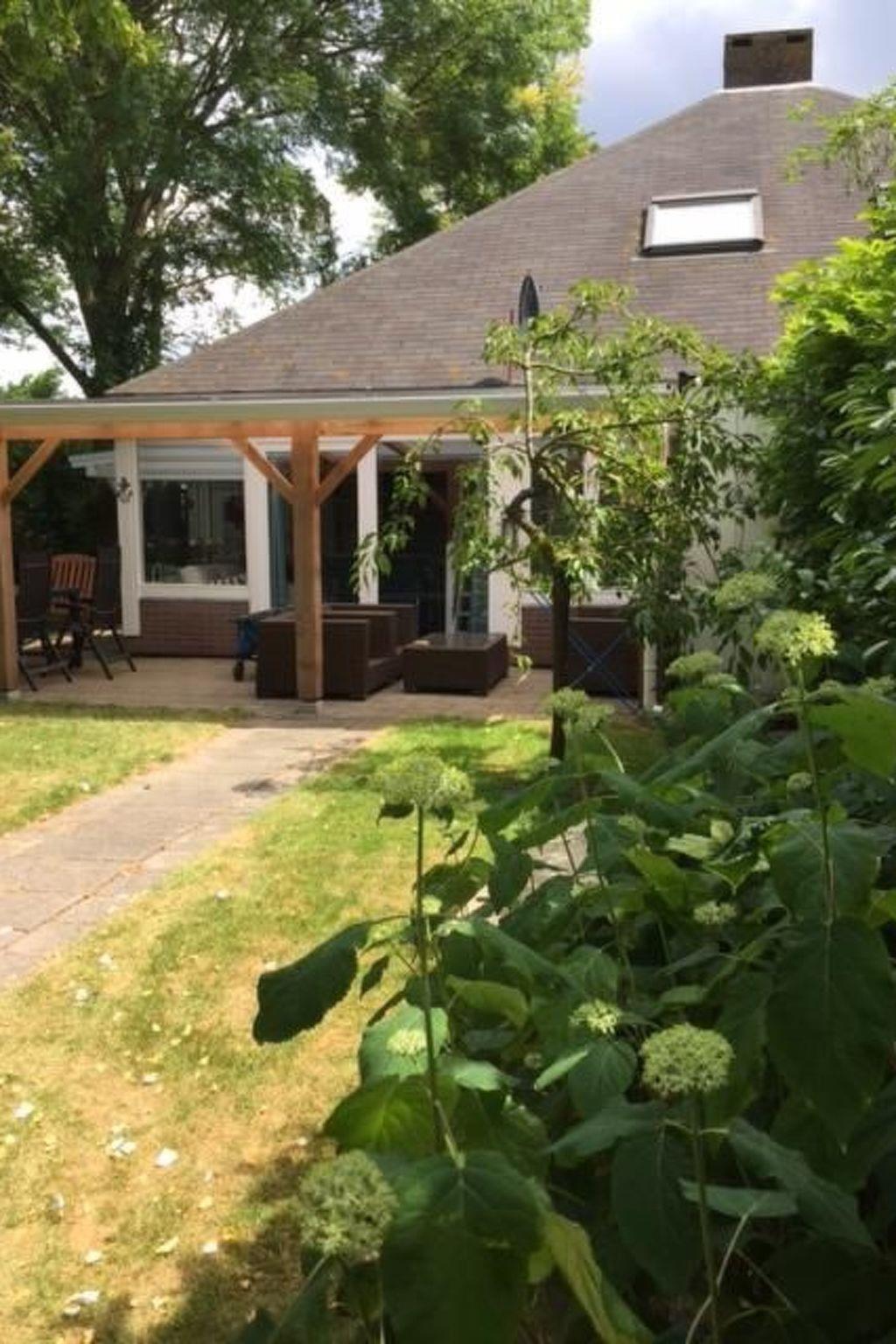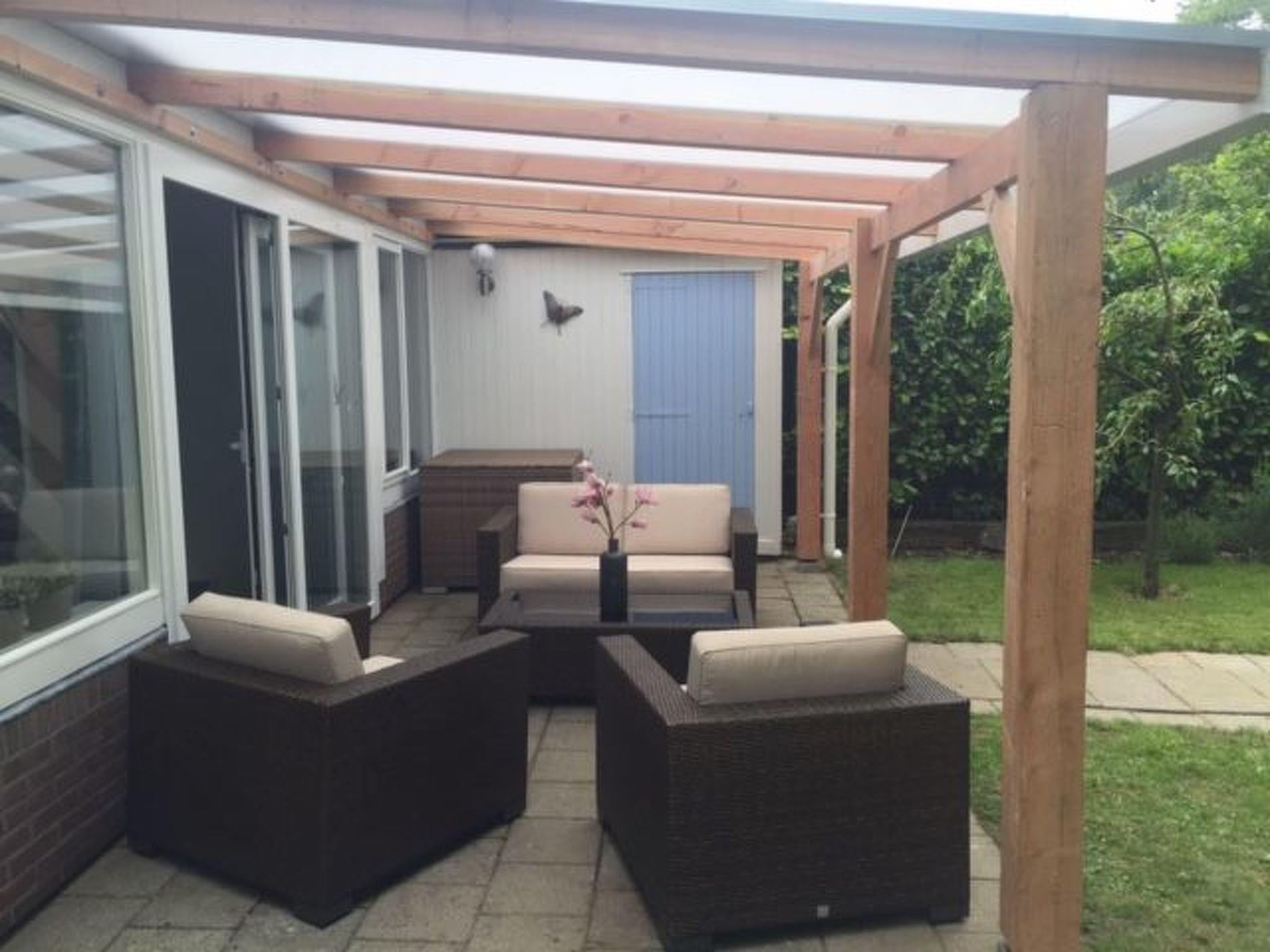 Im Garten finden Sie eine schöne Lounge unter einem Terrassendach, so dass Sie abends lange draußen sitzen können. Es gibt auch einen Esstisch mit Stühlen und einen Sonnenschirm.