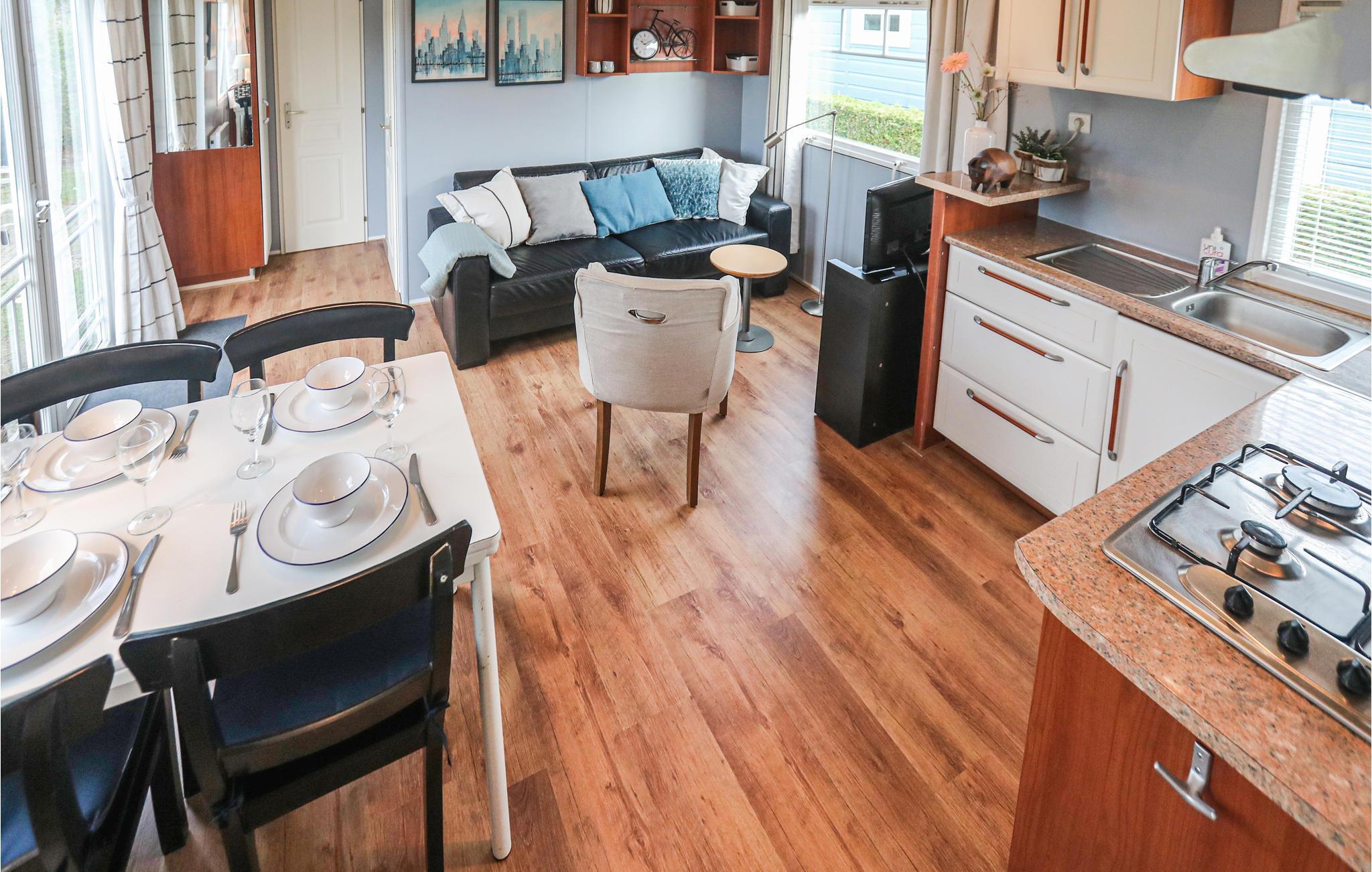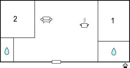 Das Haus verfügt über zwei Schlafzimmer, eines mit einem Doppelbett und eines mit zwei Einzelbetten. Das gemütliche Wohnzimmer hat einen schönen Esstisch, eine Sitzecke und eine offene Küche. Das Badezimmer kann vom Wohnzimmer und vom Schlafzimmer aus betreten werden und verfügt über eine Dusche und ein Waschbecken. Eine separate Toilette befindet sich auf der anderen Seite des Wohnzimmers.